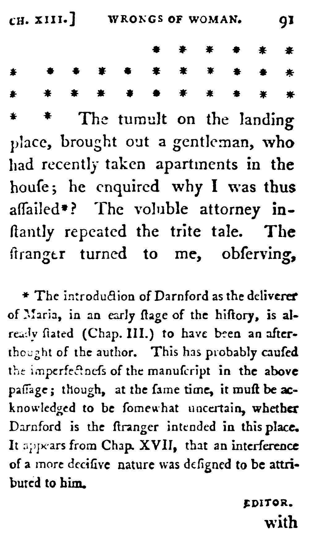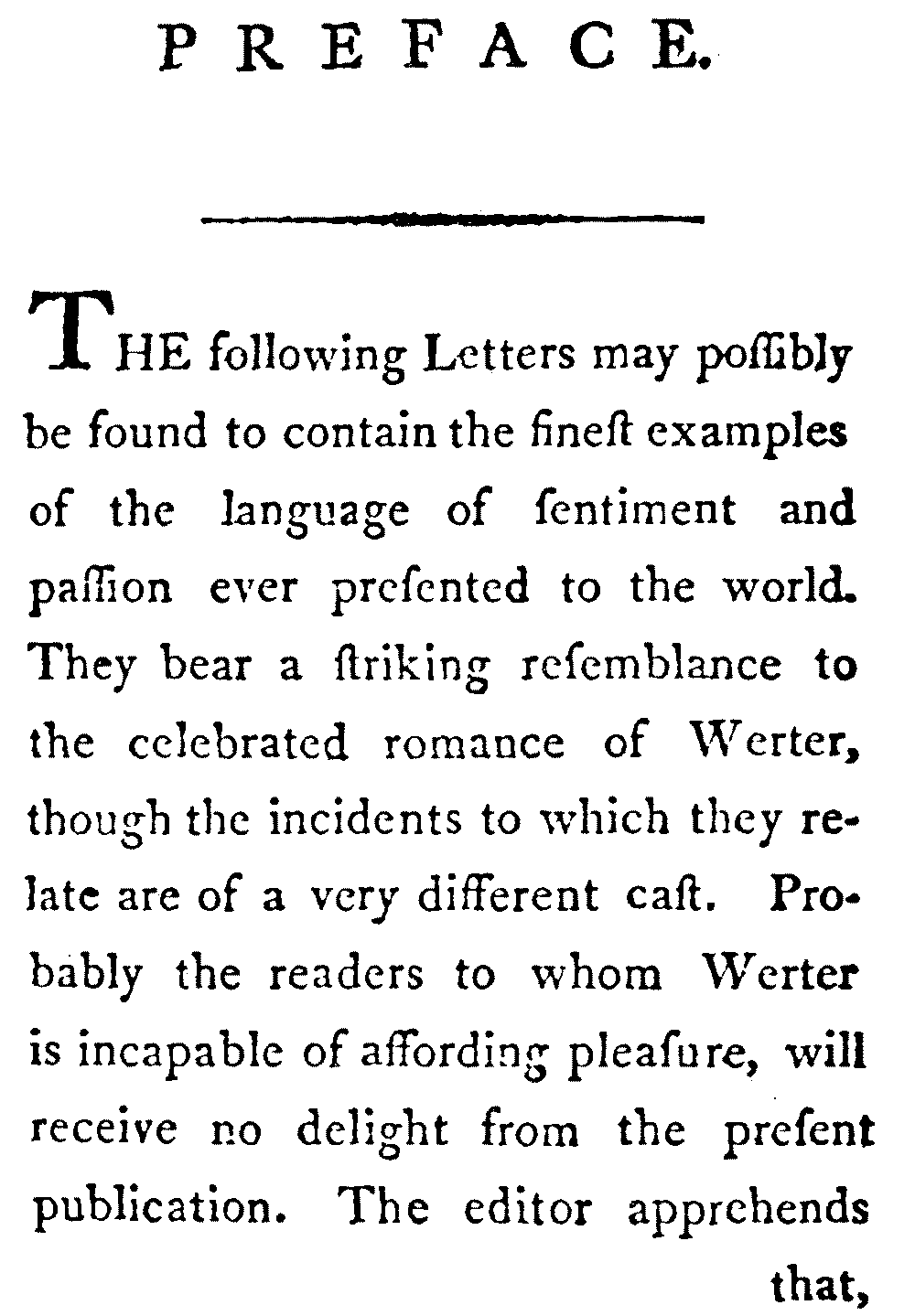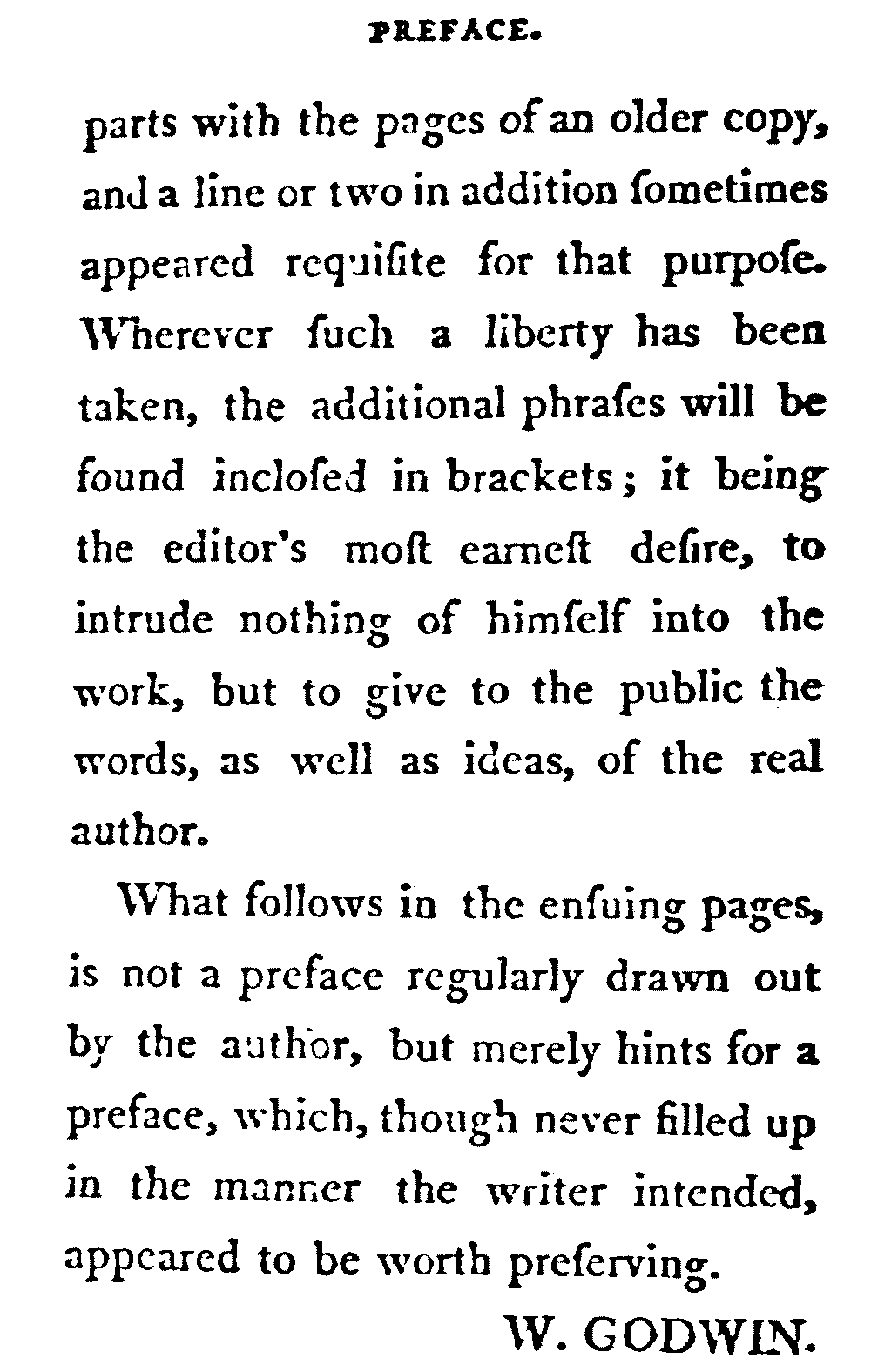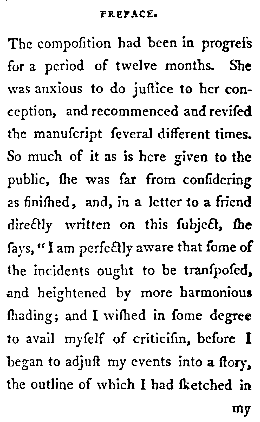 The purpose and structure of the following work, had long formed a favourite subject of meditation with its author, and she judged them capable of producing an important effect.[ix] The composition had been in progress for a period of twelve months. She was anxious to do justice to her conception, and recommenced and revised the manuscript several different times. So much of it as is here given to the public, she was far from considering as finished, and, in a letter to a friend directly written on this subject, she says, "I am perfectly aware that some of the incidents ought to be transposed, and heightened by more harmonious shading; and I wished in some degree to avail myself of criticism, before I began to adjust my events into a story, the outline of which I had sketched in[x] my mind[x-A]." The only friends to whom the author communicated her manuscript, were Mr. Dyson, the translator of the Sorcerer, and the present editor; and it was impossible for the most inexperienced author to display a stronger desire of profiting by the censures and sentiments that might be suggested[x-B].