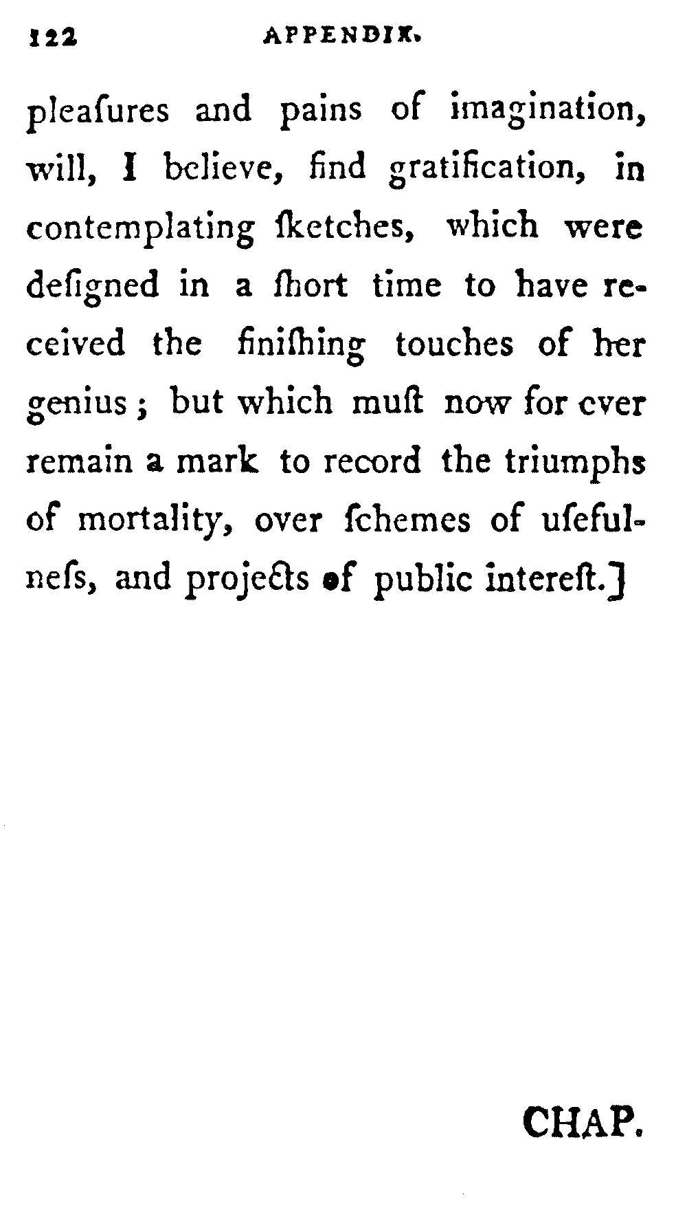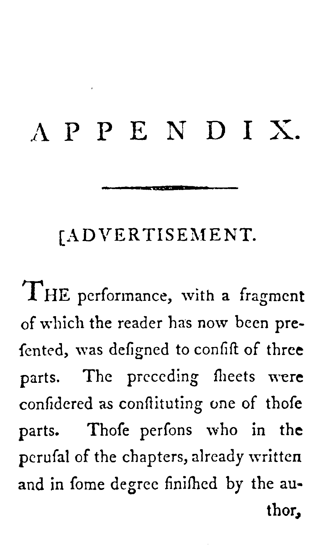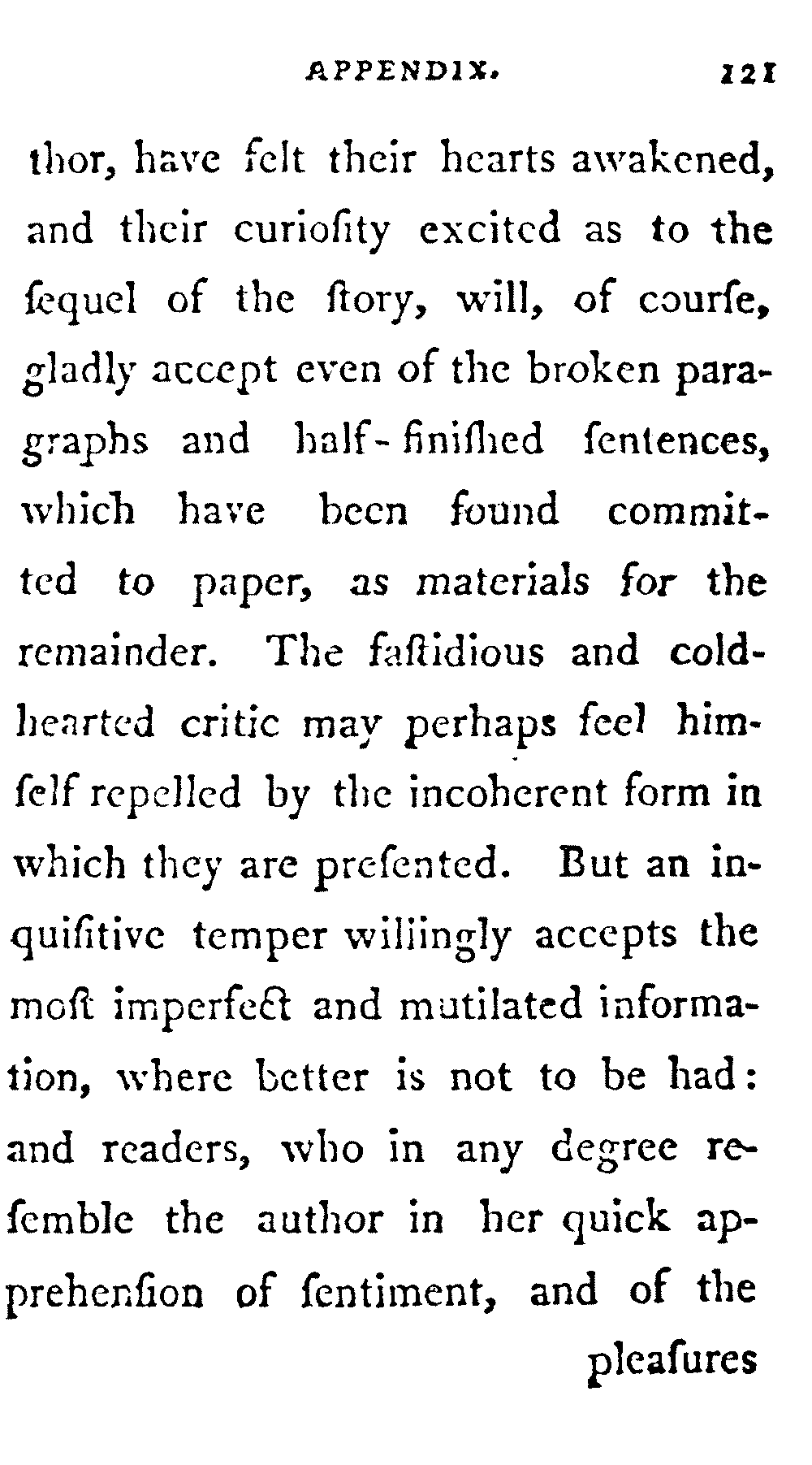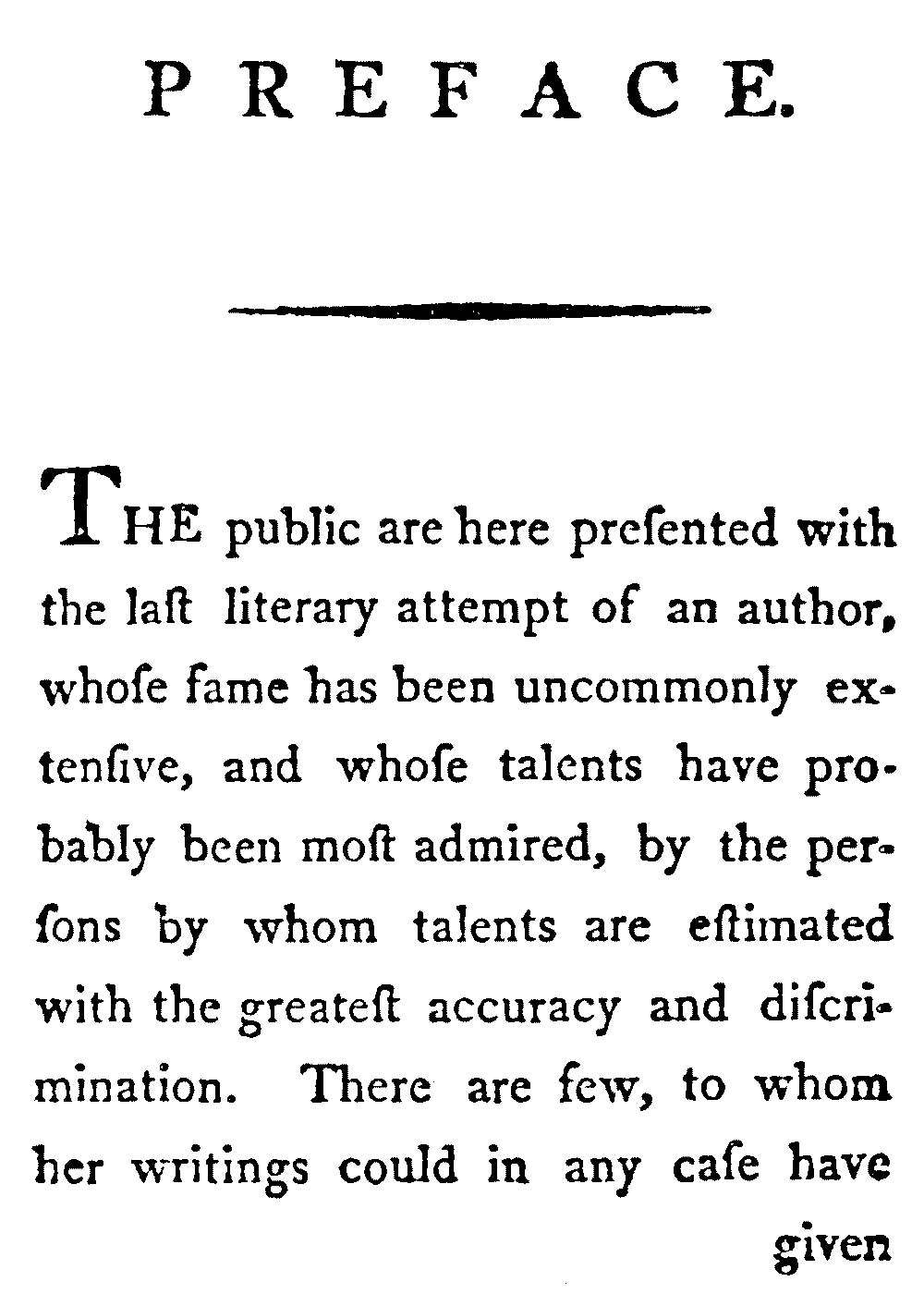 The public are here presented with the last literary attempt of an author, whose fame has been uncommonly extensive, and whose talents have probably been most admired, by the persons by whom talents are estimated with the greatest accuracy and discrimination. There are few, to whom her writings could in any case have[viii] given pleasure, that would have wished that this fragment should have been suppressed, because it is a fragment. There is a sentiment, very dear to minds of taste and imagination, that finds a melancholy delight in contemplating these unfinished productions of genius, these sketches of what, if they had been filled up in a manner adequate to the writer's conception, would perhaps have given a new impulse to the manners of a world.