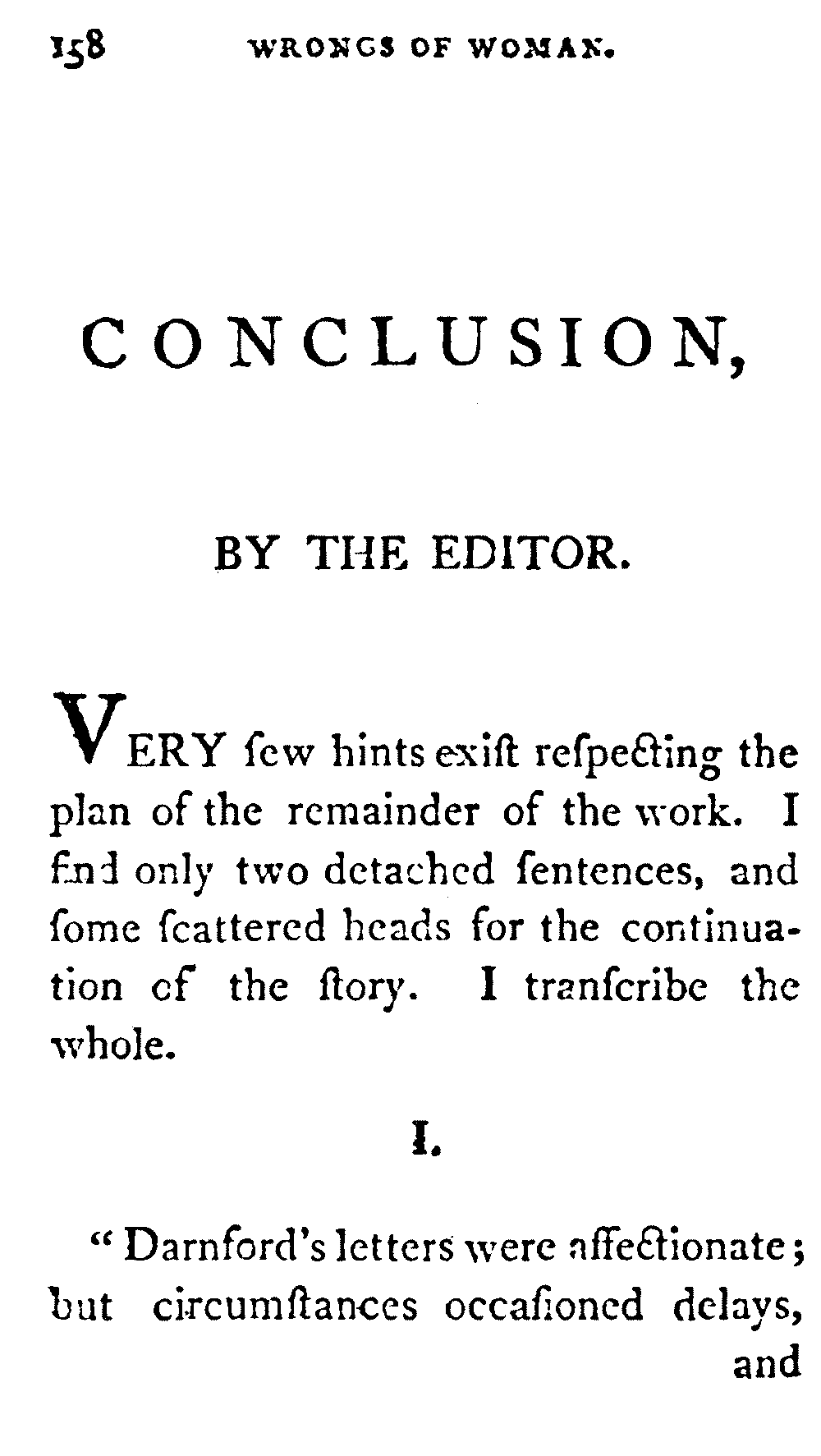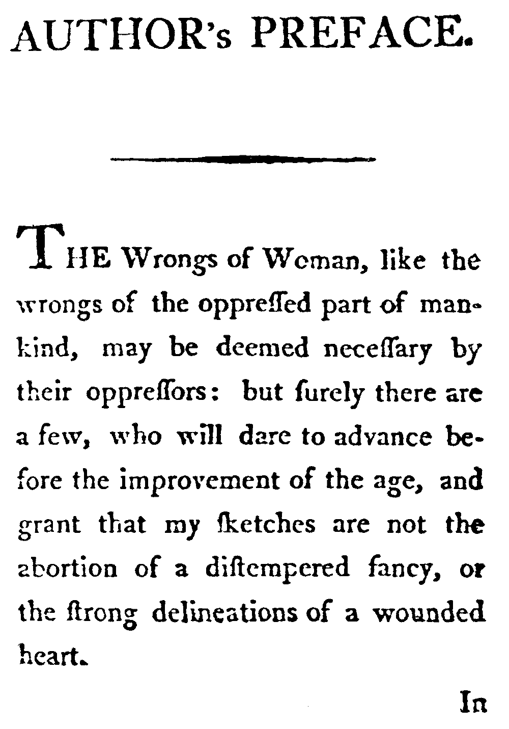 The Wrongs of Woman, like the wrongs of the oppressed part of mankind, may be deemed necessary by their oppressors: but surely there are a few, who will dare to advance before the improvement of the age, and grant that my sketches are not the abortion of a distempered fancy, or the strong delineations of a wounded heart.