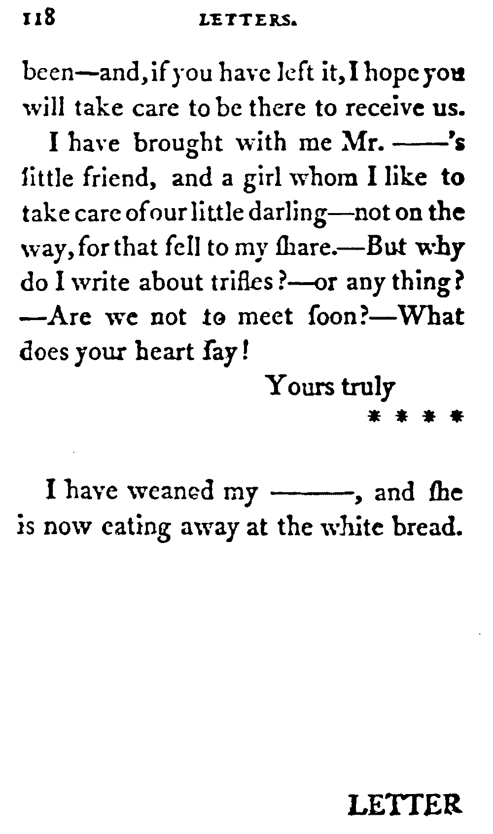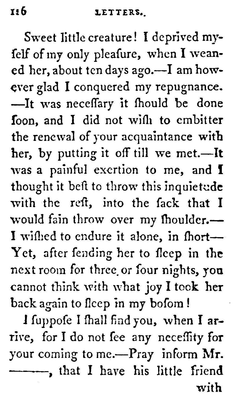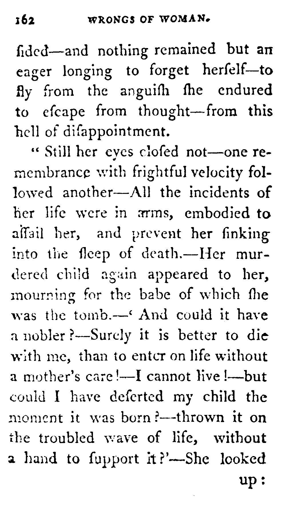 Her infant's image was continually floating on Maria's sight, and the first smile of intelligence remembered, as none but a mother, an unhappy mo[3]ther, can conceive. She heard her half speaking cooing, and felt the little twinkling fingers on her burning bosom—a bosom bursting with the nutriment for which this cherished child might now be pining in vain. From a stranger she could indeed receive the maternal aliment, Maria was grieved at the thought—but who would watch her with a mother's tenderness, a mother's self-denial?