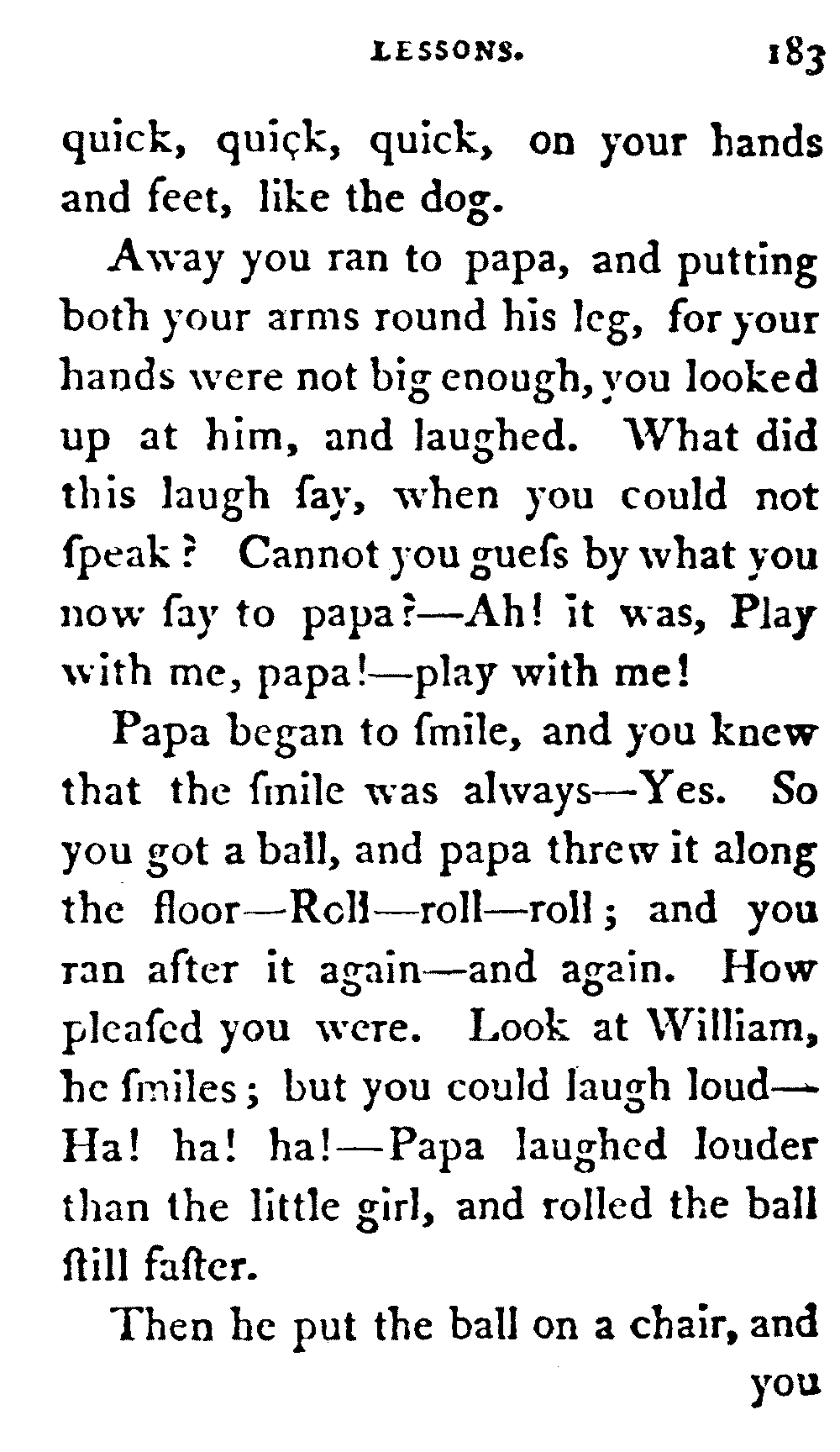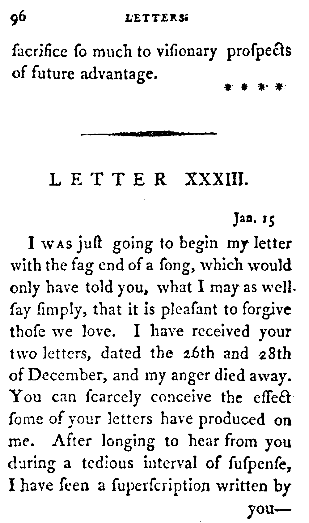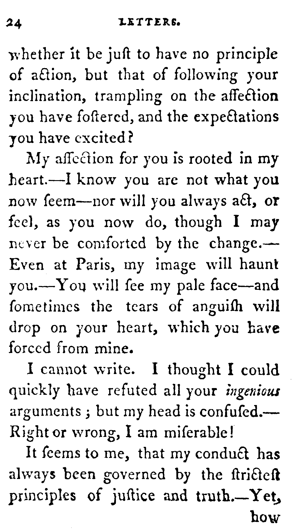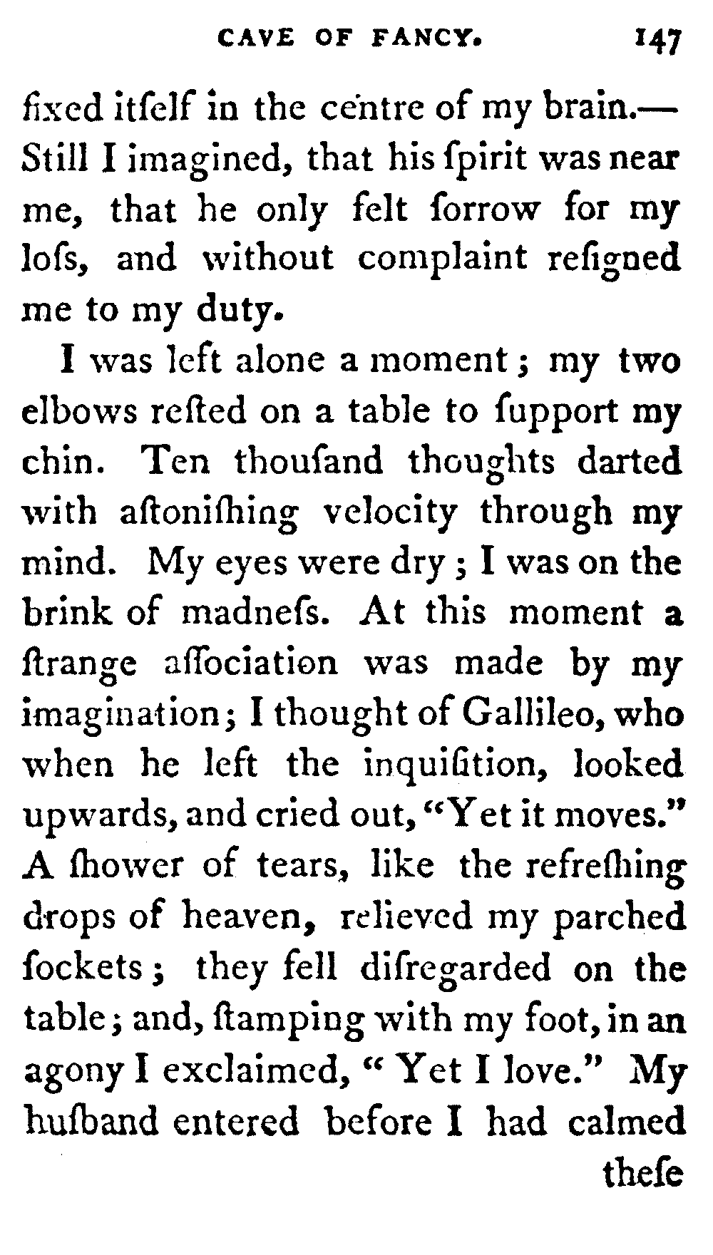 I was left alone a moment; my two elbows reſted on a table to ſupport my chin. Ten thouſand thoughts darted with aſtoniſhing velocity through my mind. My eyes were dry; I was on the brink of madneſs. At this moment a ſtrange aſſociation was made by my imagination; I thought of Gallileo, who when he left the inquiſition, looked upwards, and cried out, "Yet it moves." A ſhower of tears, like the refreſhing drops of heaven, relieved my parched ſockets; they fell diſregarded on the table; and, ſtamping with my foot, in an agony I exclaimed, "Yet I love." My huſband entered before I had calmed[148] theſe tumultuous emotions, and tenderly took my hand. I ſnatched it from him; grief and ſurpriſe were marked on his countenance; I haſtily ſtretched it out again. My heart ſmote me, and I removed the tranſient miſt by an unfeigned endeavour to pleaſe him.