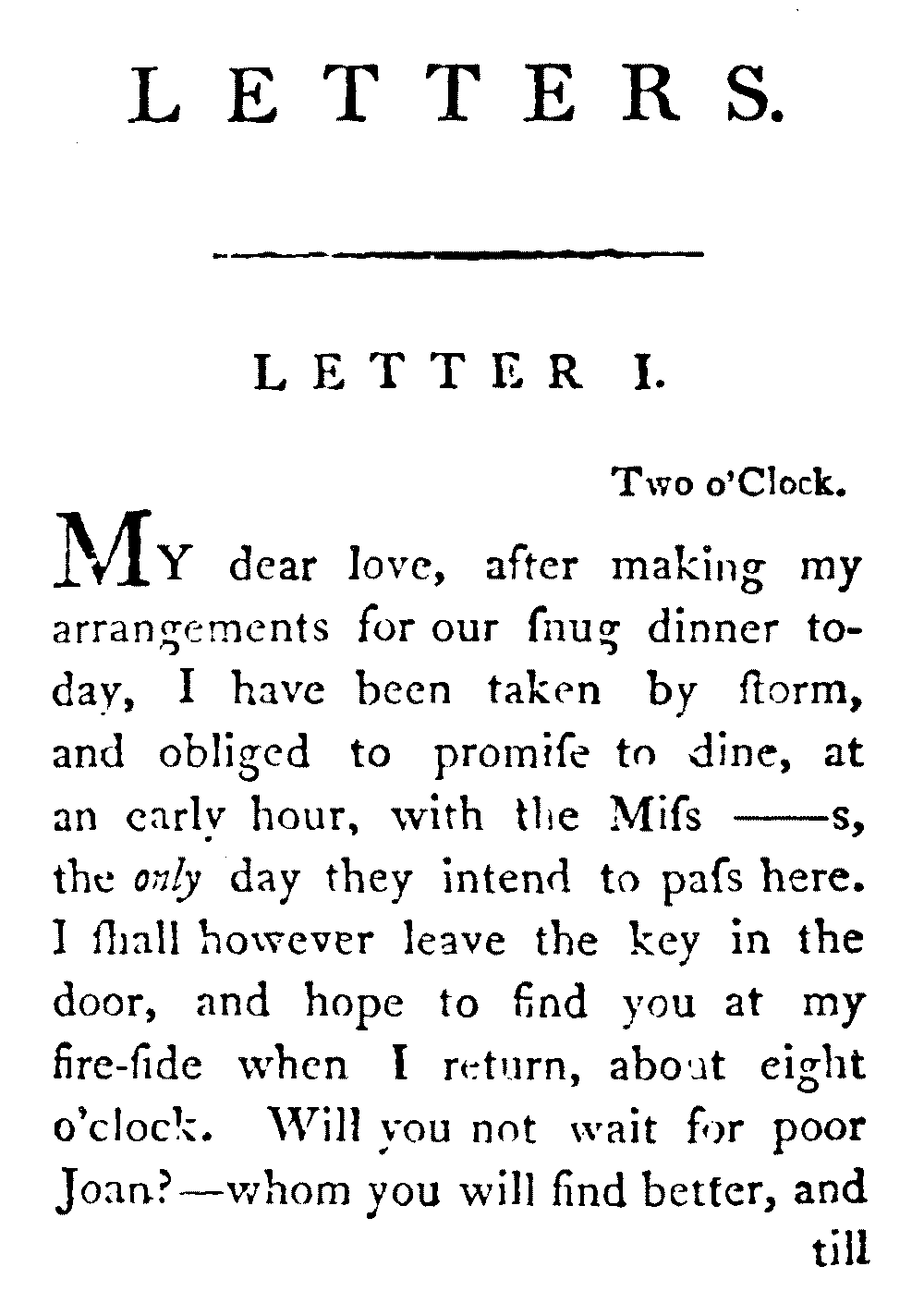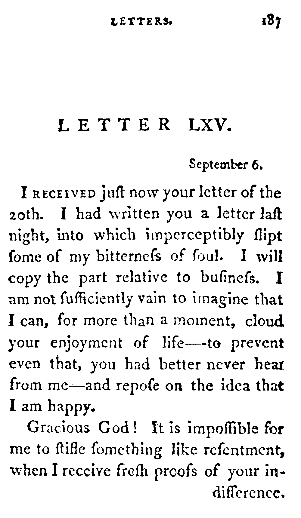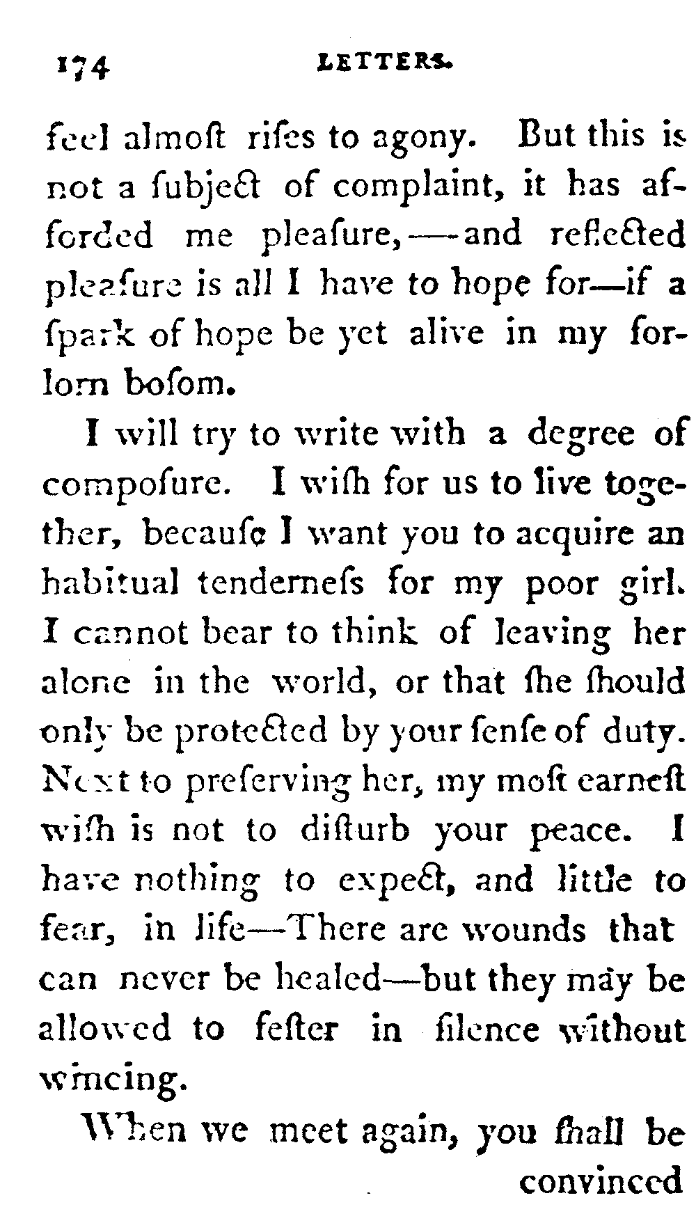 Actuated by the ſincereſt affection, I uſed to read to him, and he miſtook my tenderneſs for love. How could I undeceive him, when every circumſtance frowned on him! Too ſoon I found that I was his only comfort; I, who rejected his hand when fortune ſmiled, could not now ſecond her blow; and, in a moment of enthuſiaſtic gratitude and tender compaſſion, I offered him my hand.—It was received with pleaſure; tranſport was not made for his ſoul; nor did he diſcover that nature had ſeparated us, by making me alive to ſuch different ſenſations. My mother was to live with us, and I dwelt on this circumſtance to baniſh cruel recollections, when the bent bow returned to its former ſtate.