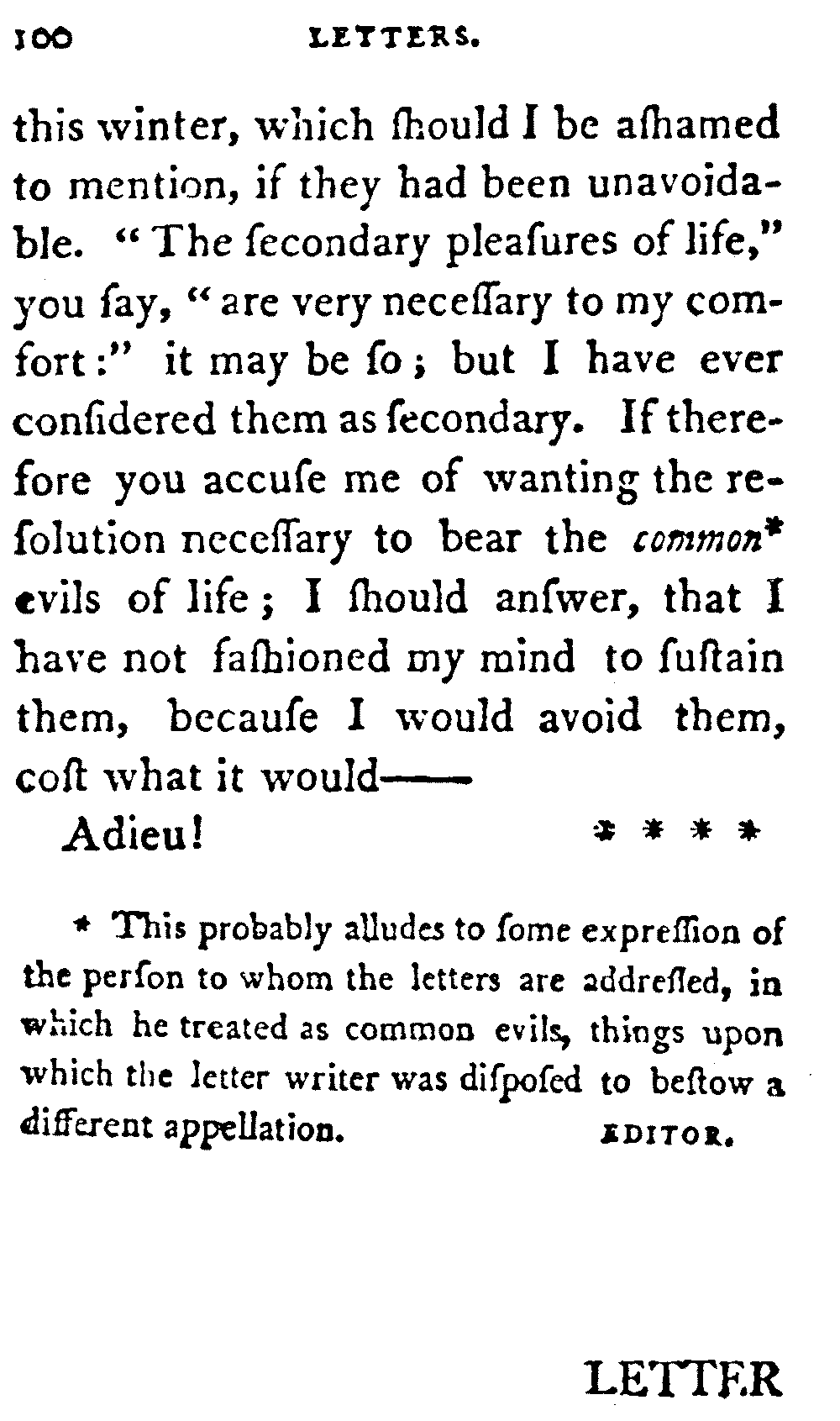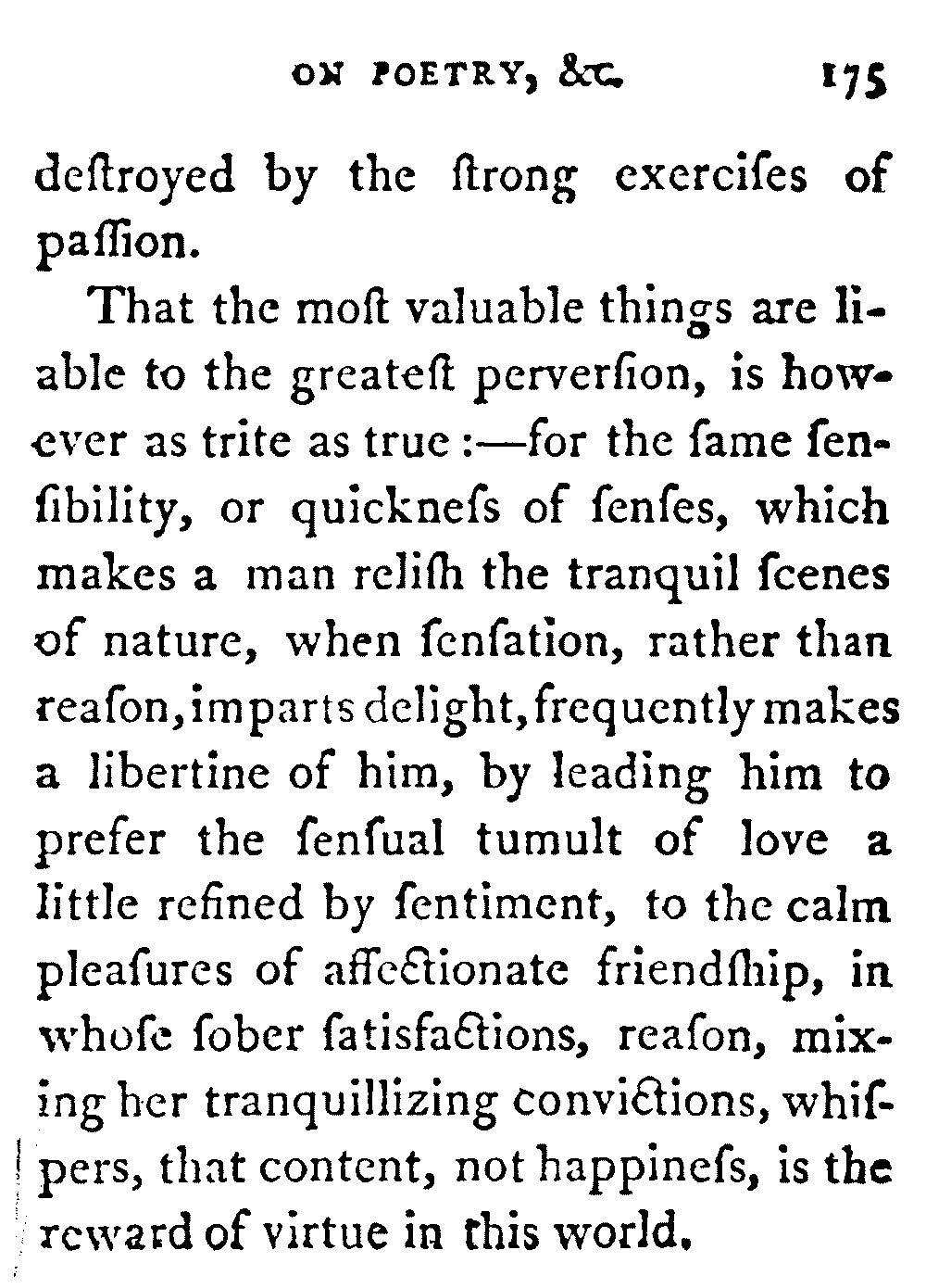 That the moſt valuable things are liable to the greateſt perverſion, is however as trite as true:—for the ſame ſenſibility, or quickneſs of ſenſes, which makes a man reliſh the tranquil ſcenes of nature, when ſenſation, rather than reaſon, imparts delight, frequently makes a libertine of him, by leading him to prefer the ſenſual tumult of love a little refined by ſentiment, to the calm pleaſures of affectionate friendſhip, in whoſe ſober ſatiſfactions, reaſon, mixing her tranquillizing convictions, whiſpers, that content, not happineſs, is the reward of virtue in this world.