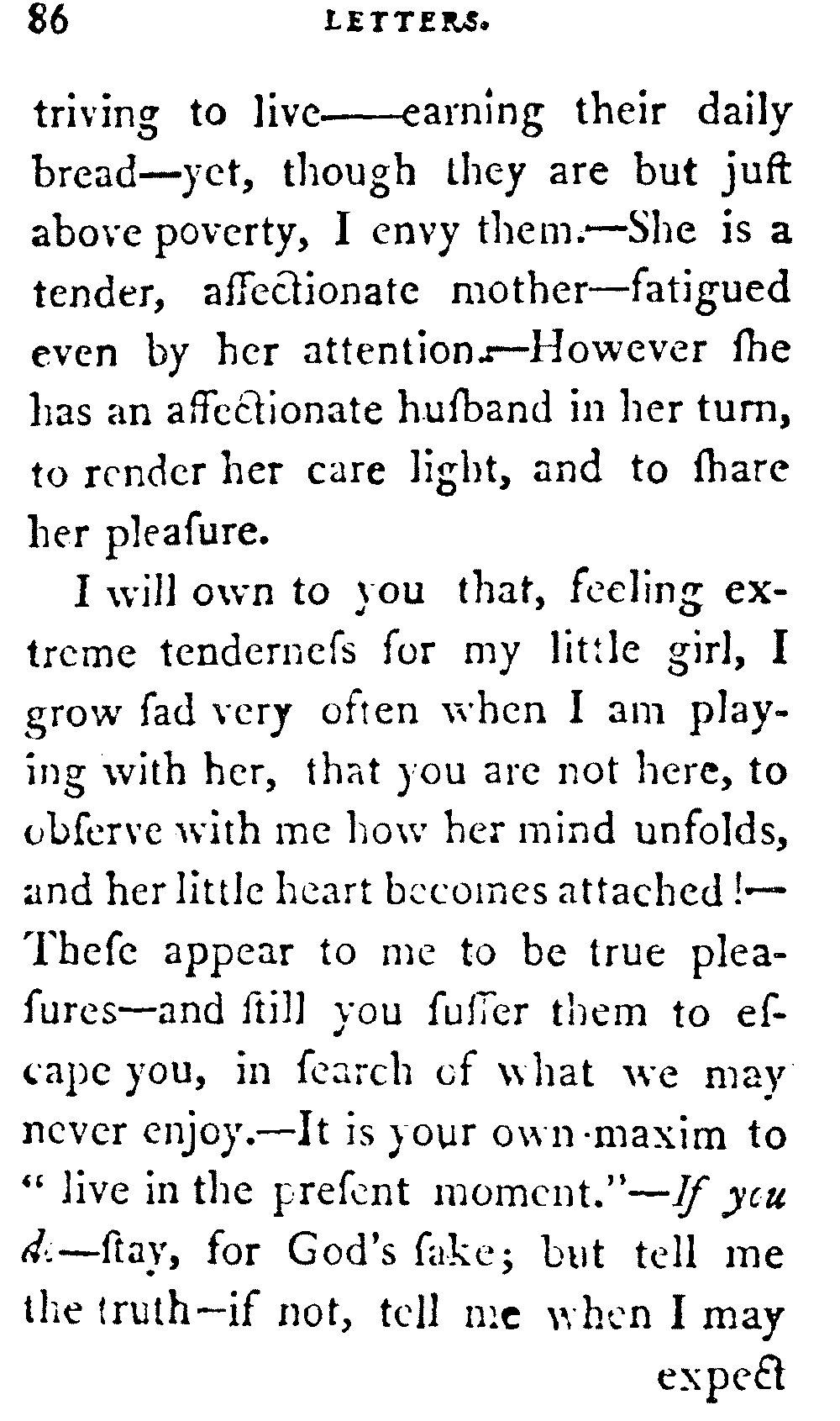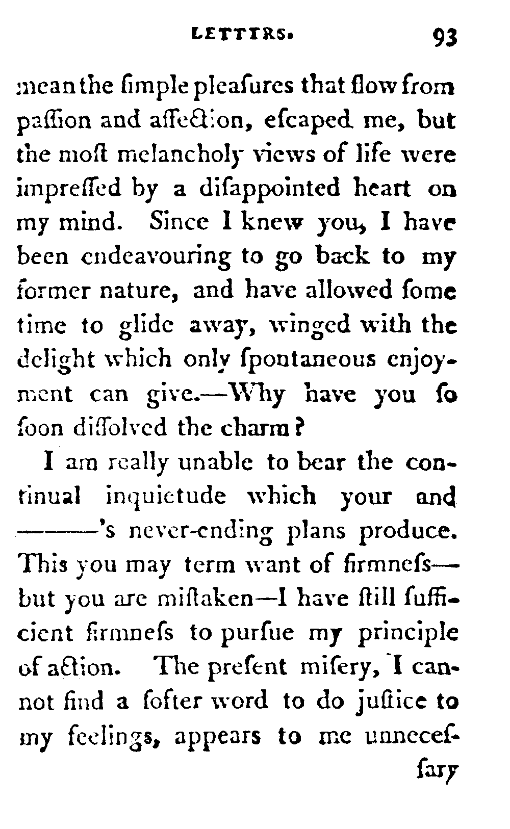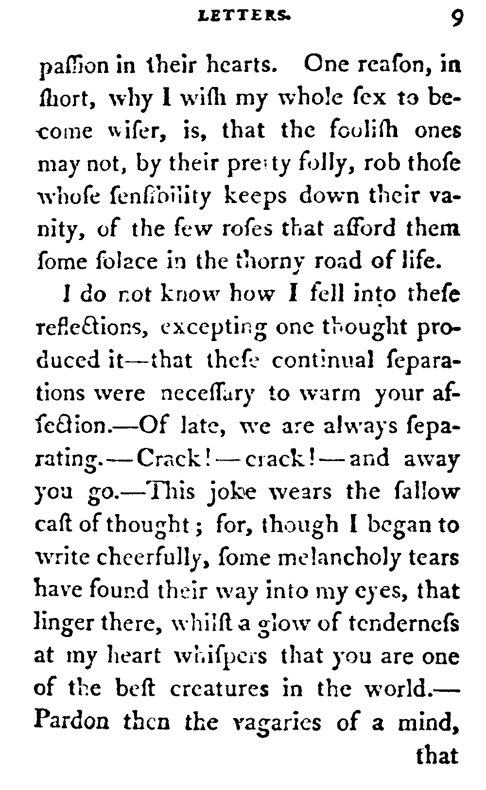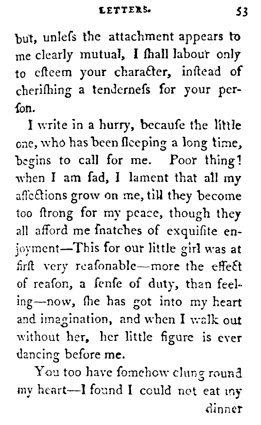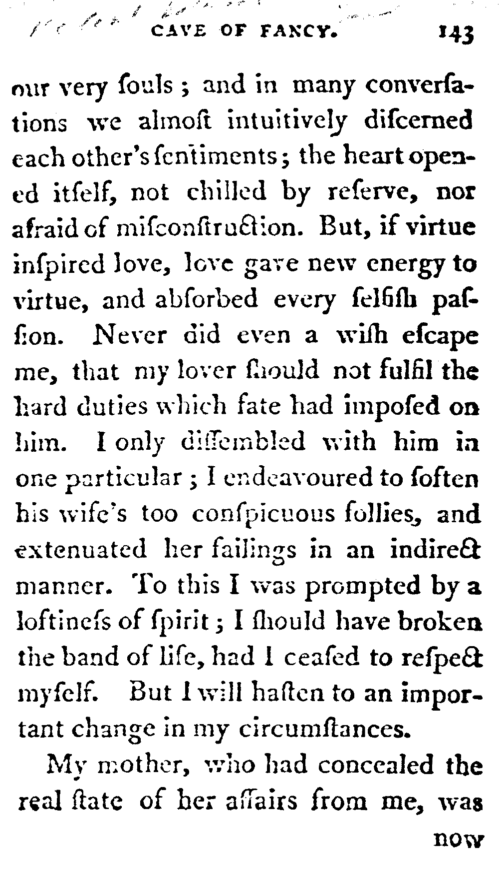 Feebly did I afterwards combat an[142] affection, which ſeemed twiſted in every fibre of my heart. The world ſtood ſtill when I thought of him; it moved heavily at beſt, with one whoſe very conſtitution ſeemed to mark her out for miſery. But I will not dwell on the paſſion I too fondly nurſed. One only refuge had I on earth; I could not reſolutely deſolate the ſcene my fancy flew to, when worldly cares, when a knowledge of mankind, which my circumſtances forced on me, rendered every other inſipid. I was afraid of the unmarked vacuity of common life; yet, though I ſupinely indulged myſelf in fairy-land, when I ought to have been more actively employed, virtue was ſtill the firſt mover of my actions; ſhe dreſſed my love in ſuch enchanting colours, and ſpread the net I could never break. Our correſponding feelings confounded[143] our very ſouls; and in many converſations we almoſt intuitively diſcerned each other's ſentiments; the heart opened itſelf, not chilled by reſerve, nor afraid of miſconſtruction. But, if virtue inſpired love, love gave new energy to virtue, and abſorbed every ſelfiſh paſſion. Never did even a wiſh eſcape me, that my lover ſhould not fulfil the hard duties which fate had impoſed on him. I only diſſembled with him in one particular; I endeavoured to ſoften his wife's too conſpicuous follies, and extenuated her failings in an indirect manner. To this I was prompted by a loftineſs of ſpirit; I ſhould have broken the band of life, had I ceaſed to reſpect myſelf. But I will haſten to an important change in my circumſtances.
