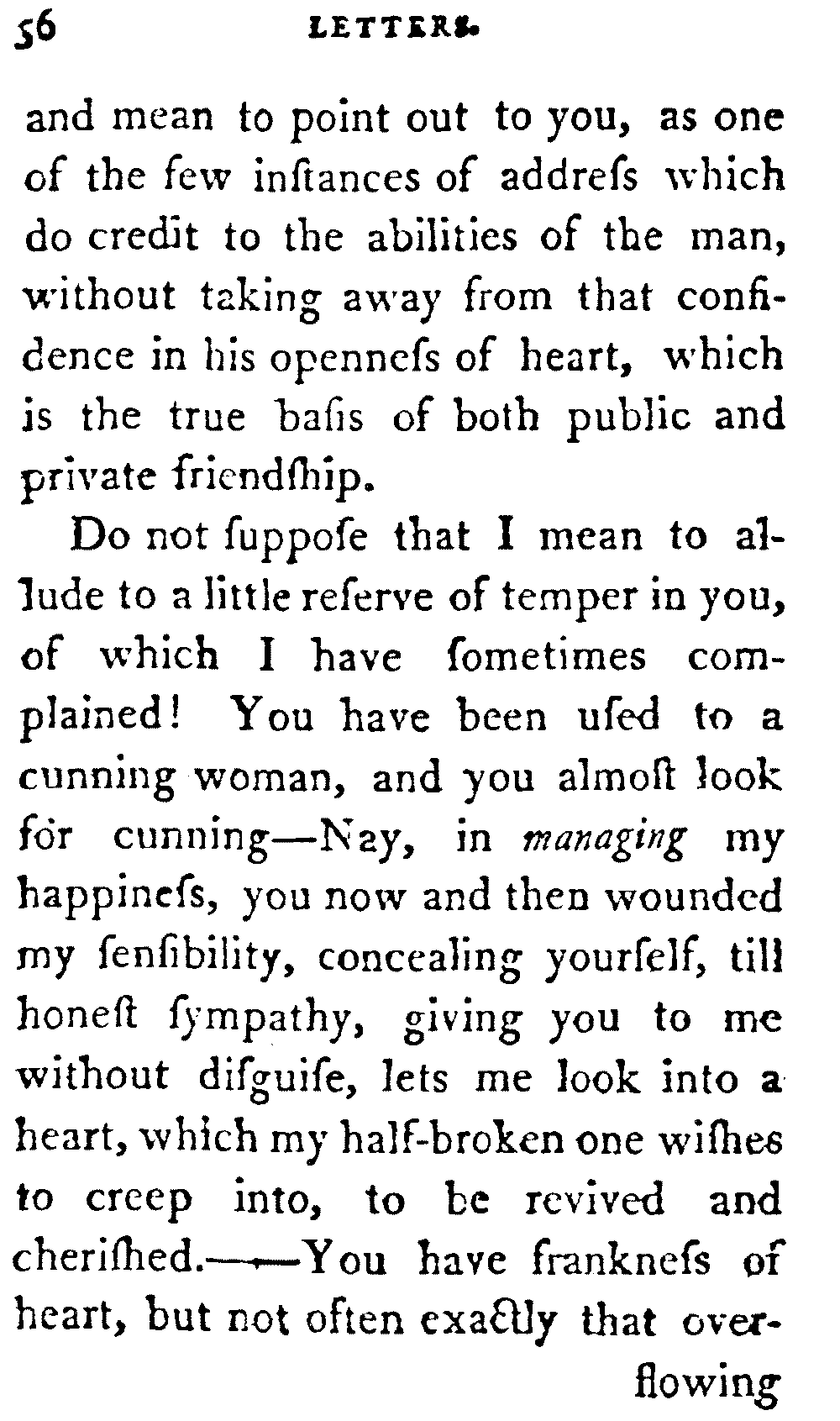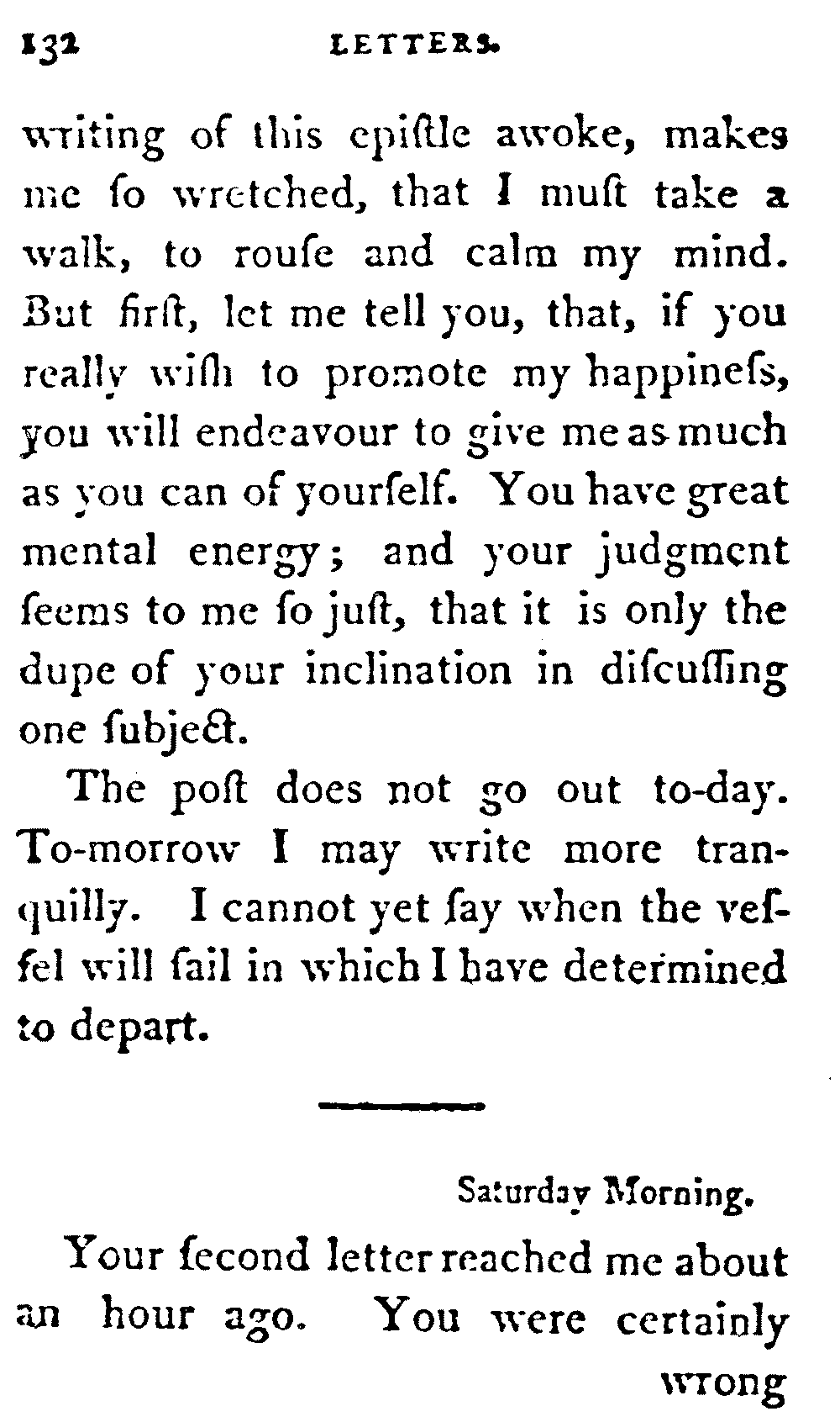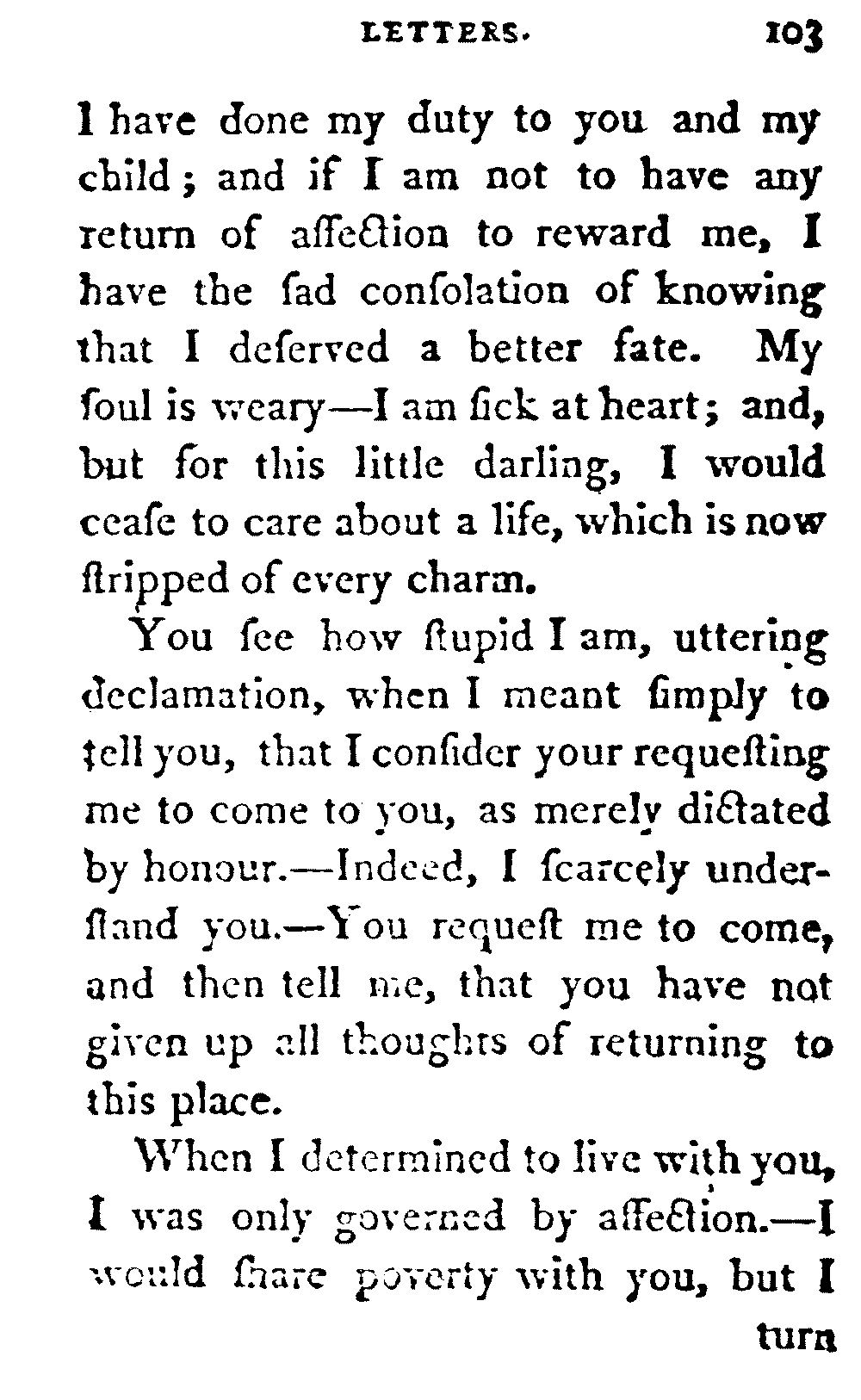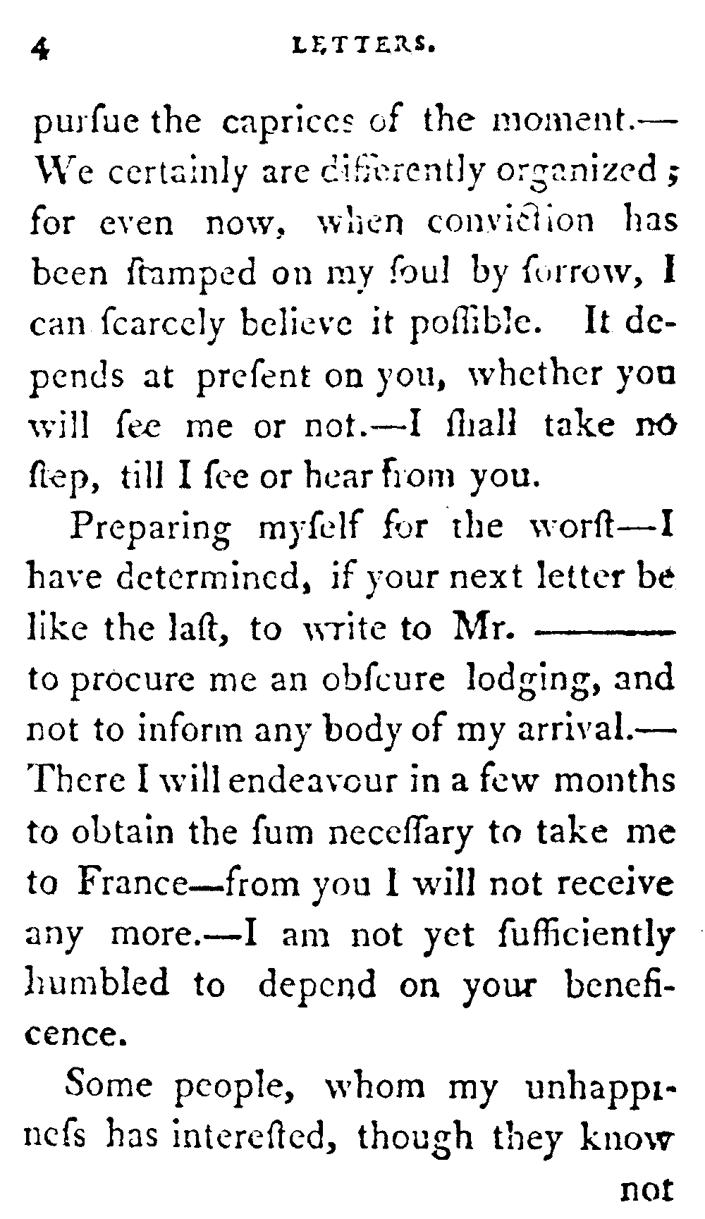 Feebly did I afterwards combat an[142] affection, which ſeemed twiſted in every fibre of my heart. The world ſtood ſtill when I thought of him; it moved heavily at beſt, with one whoſe very conſtitution ſeemed to mark her out for miſery. But I will not dwell on the paſſion I too fondly nurſed. One only refuge had I on earth; I could not reſolutely deſolate the ſcene my fancy flew to, when worldly cares, when a knowledge of mankind, which my circumſtances forced on me, rendered every other inſipid. I was afraid of the unmarked vacuity of common life; yet, though I ſupinely indulged myſelf in fairy-land, when I ought to have been more actively employed, virtue was ſtill the firſt mover of my actions; ſhe dreſſed my love in ſuch enchanting colours, and ſpread the net I could never break. Our correſponding feelings confounded[143] our very ſouls; and in many converſations we almoſt intuitively diſcerned each other's ſentiments; the heart opened itſelf, not chilled by reſerve, nor afraid of miſconſtruction. But, if virtue inſpired love, love gave new energy to virtue, and abſorbed every ſelfiſh paſſion. Never did even a wiſh eſcape me, that my lover ſhould not fulfil the hard duties which fate had impoſed on him. I only diſſembled with him in one particular; I endeavoured to ſoften his wife's too conſpicuous follies, and extenuated her failings in an indirect manner. To this I was prompted by a loftineſs of ſpirit; I ſhould have broken the band of life, had I ceaſed to reſpect myſelf. But I will haſten to an important change in my circumſtances.