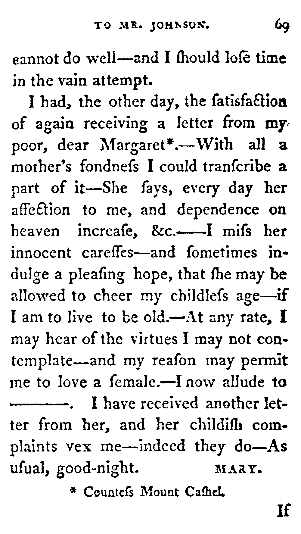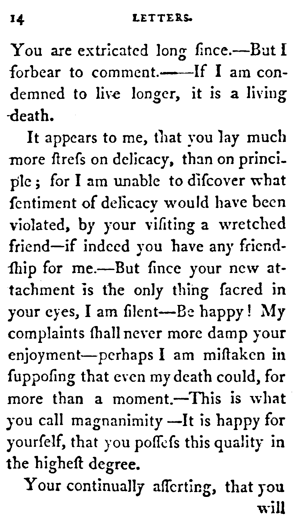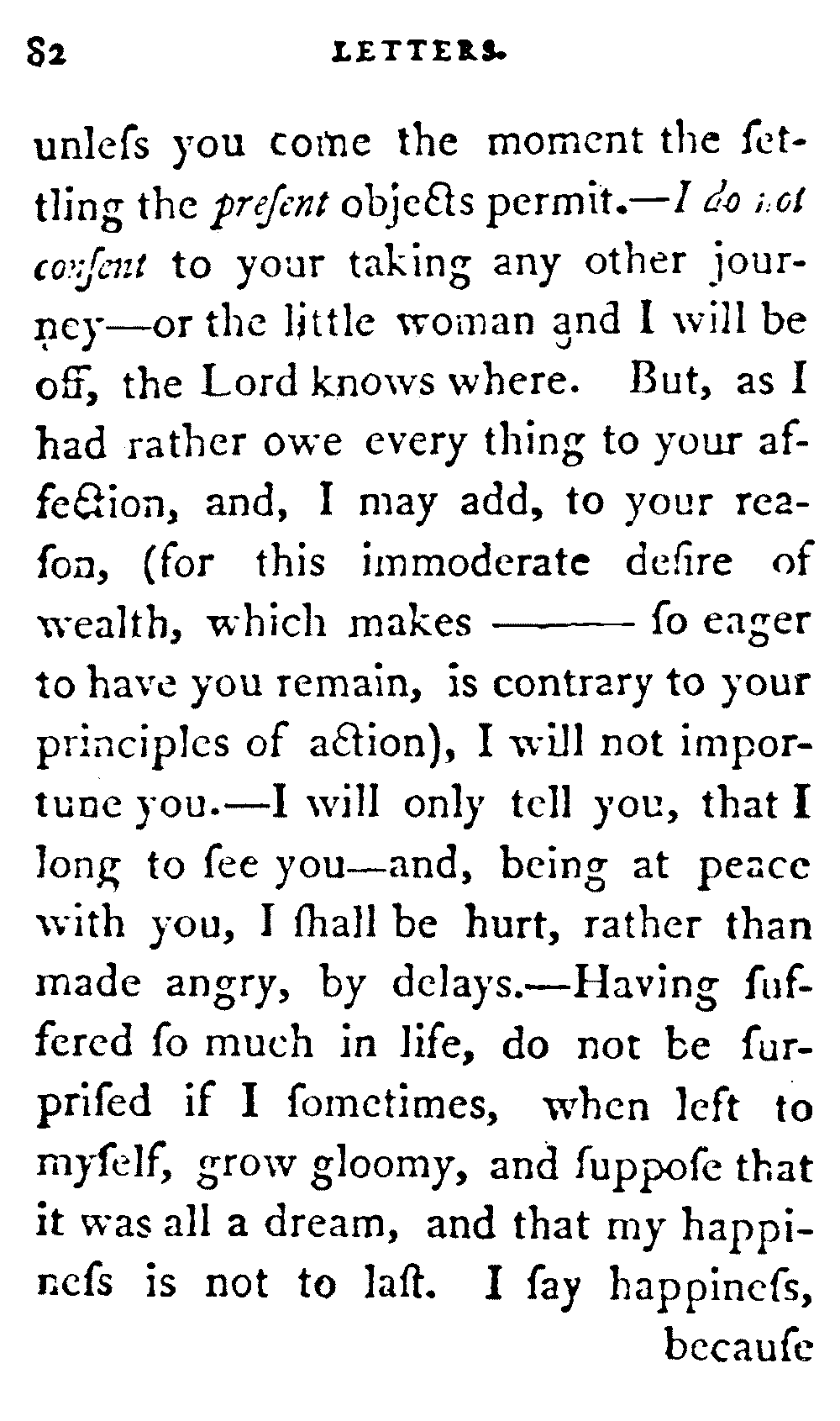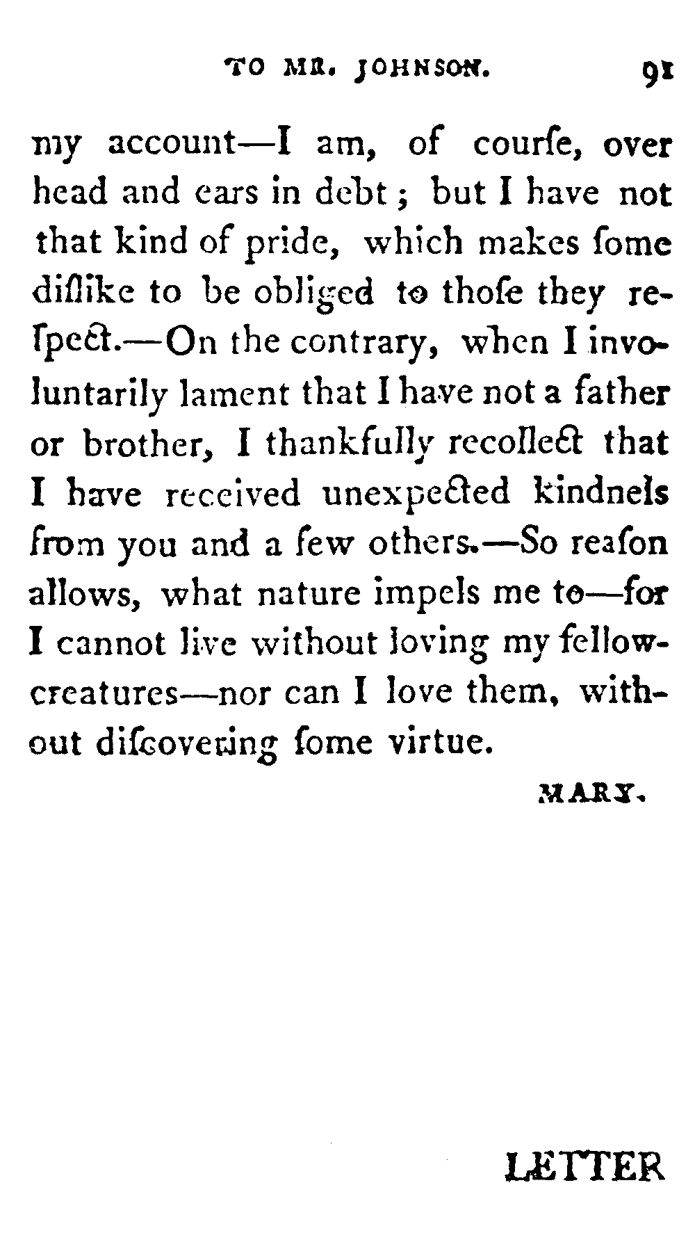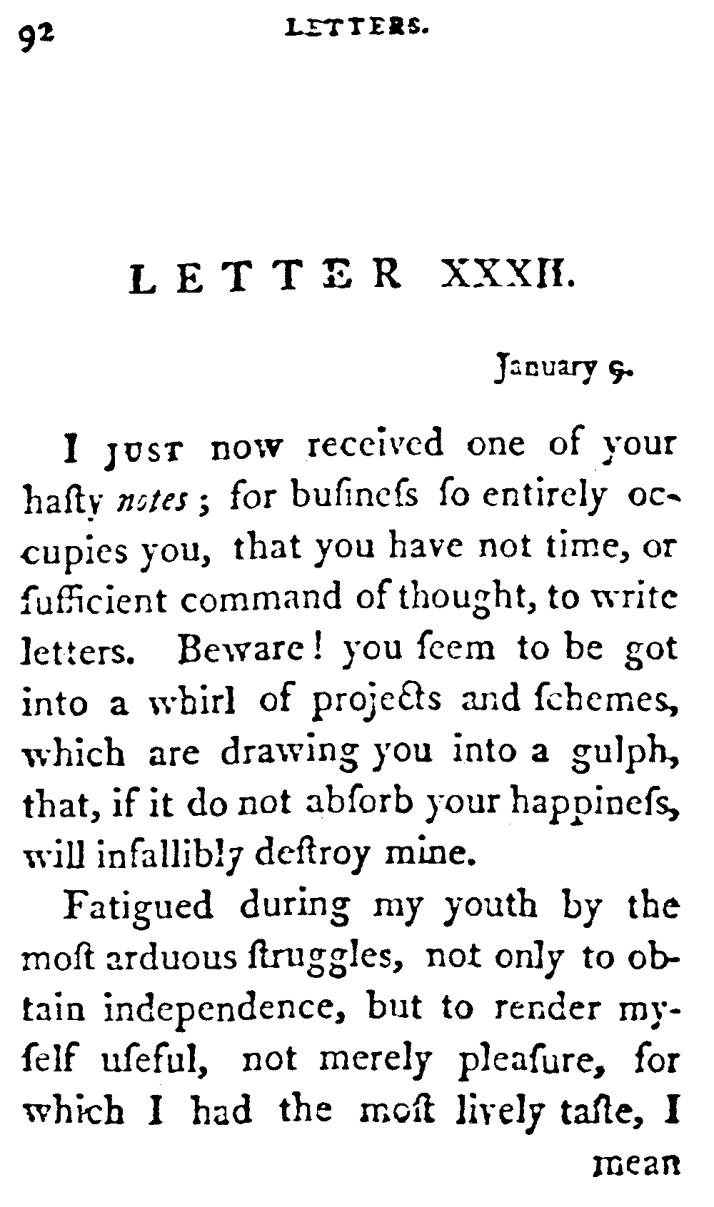 Feebly did I afterwards combat an[142] affection, which ſeemed twiſted in every fibre of my heart. The world ſtood ſtill when I thought of him; it moved heavily at beſt, with one whoſe very conſtitution ſeemed to mark her out for miſery. But I will not dwell on the paſſion I too fondly nurſed. One only refuge had I on earth; I could not reſolutely deſolate the ſcene my fancy flew to, when worldly cares, when a knowledge of mankind, which my circumſtances forced on me, rendered every other inſipid. I was afraid of the unmarked vacuity of common life; yet, though I ſupinely indulged myſelf in fairy-land, when I ought to have been more actively employed, virtue was ſtill the firſt mover of my actions; ſhe dreſſed my love in ſuch enchanting colours, and ſpread the net I could never break. Our correſponding feelings confounded[143] our very ſouls; and in many converſations we almoſt intuitively diſcerned each other's ſentiments; the heart opened itſelf, not chilled by reſerve, nor afraid of miſconſtruction. But, if virtue inſpired love, love gave new energy to virtue, and abſorbed every ſelfiſh paſſion. Never did even a wiſh eſcape me, that my lover ſhould not fulfil the hard duties which fate had impoſed on him. I only diſſembled with him in one particular; I endeavoured to ſoften his wife's too conſpicuous follies, and extenuated her failings in an indirect manner. To this I was prompted by a loftineſs of ſpirit; I ſhould have broken the band of life, had I ceaſed to reſpect myſelf. But I will haſten to an important change in my circumſtances.