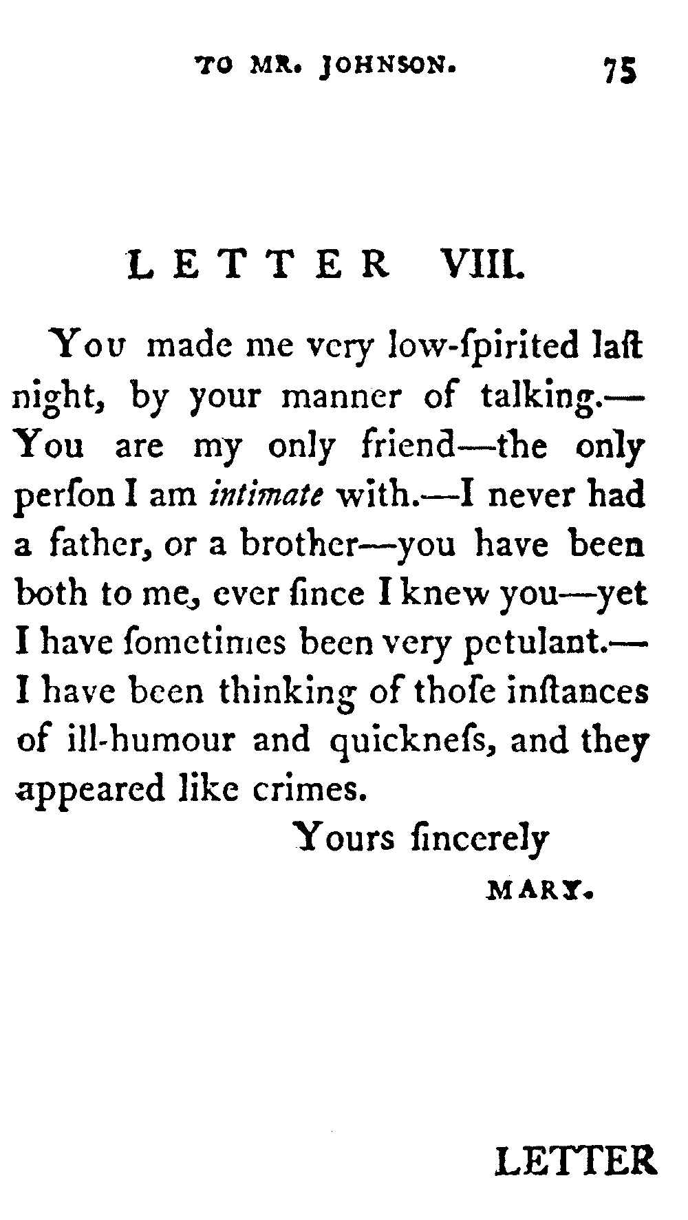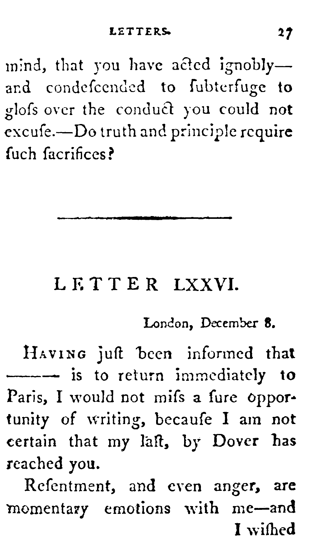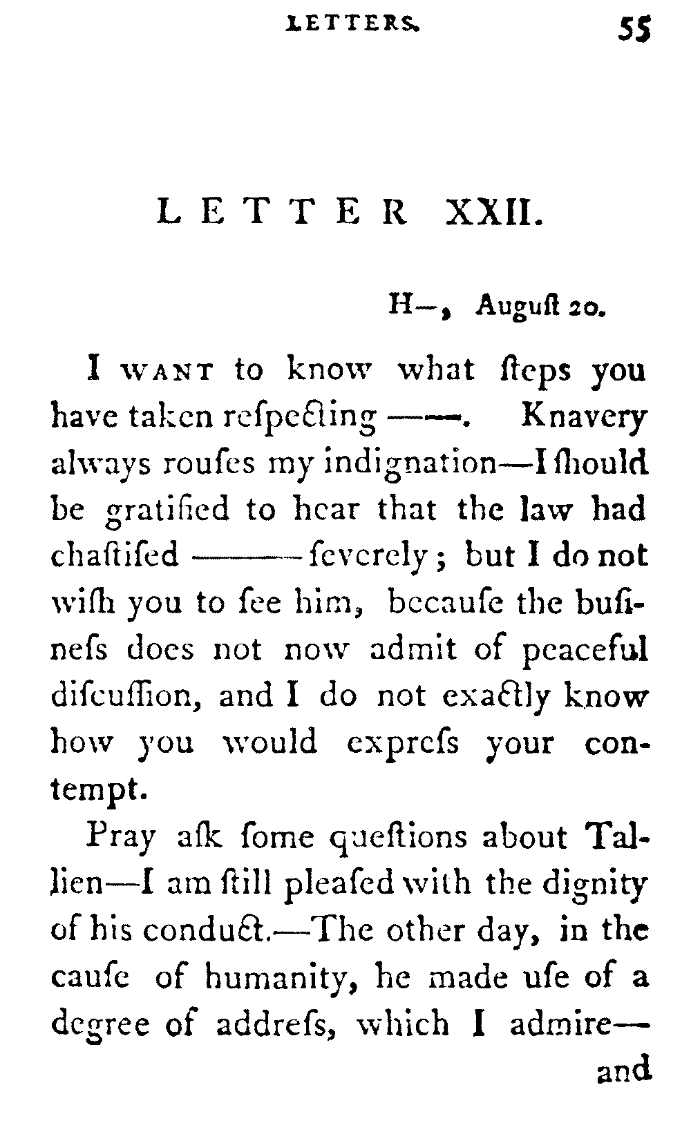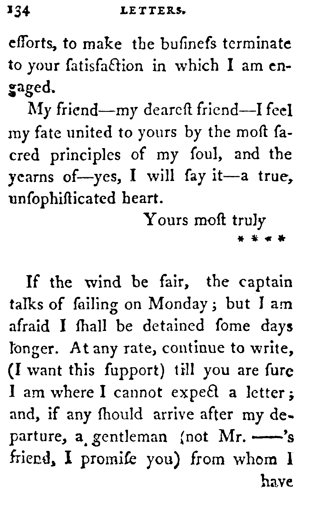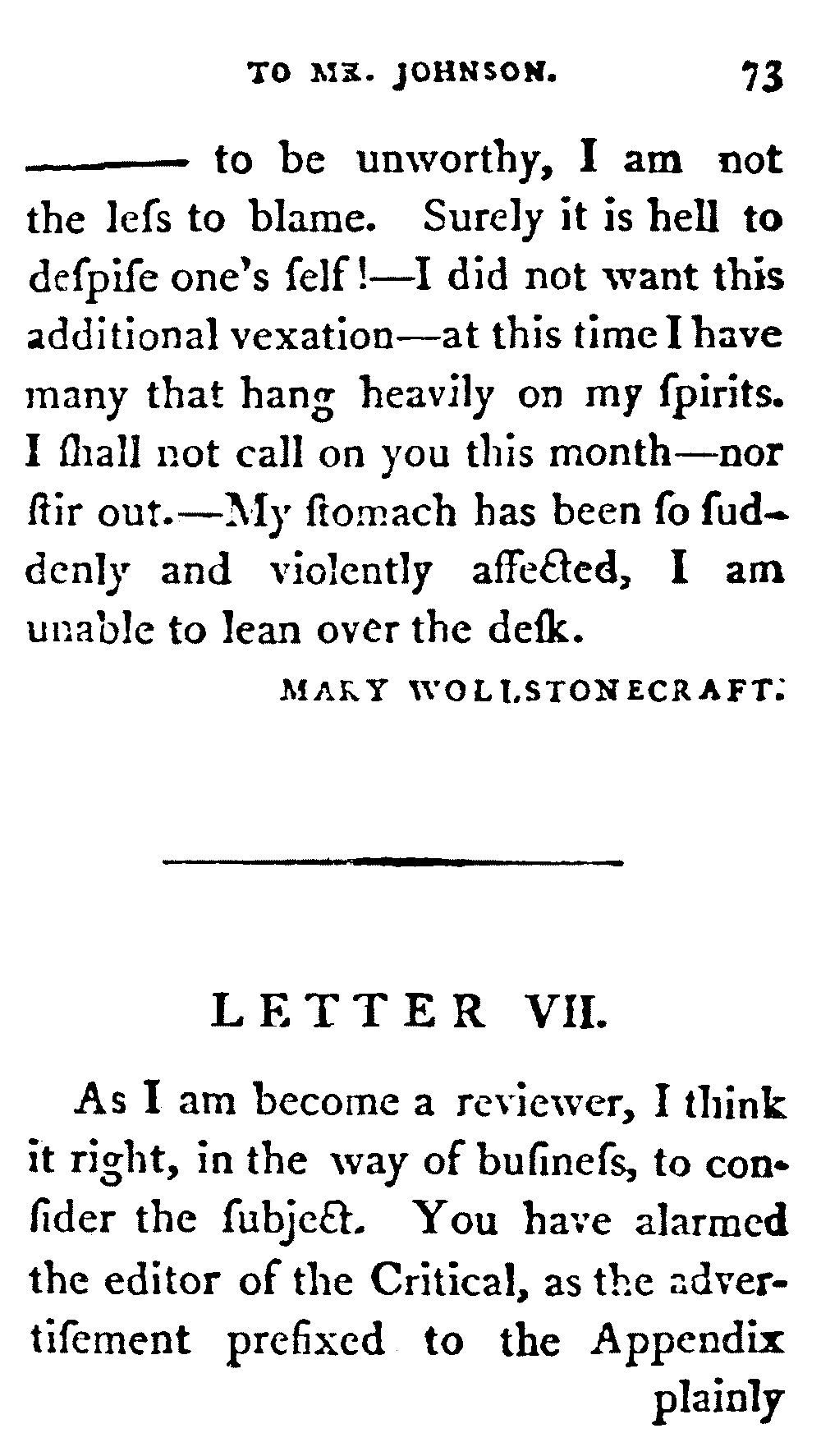 Feebly did I afterwards combat an[142] affection, which ſeemed twiſted in every fibre of my heart. The world ſtood ſtill when I thought of him; it moved heavily at beſt, with one whoſe very conſtitution ſeemed to mark her out for miſery. But I will not dwell on the paſſion I too fondly nurſed. One only refuge had I on earth; I could not reſolutely deſolate the ſcene my fancy flew to, when worldly cares, when a knowledge of mankind, which my circumſtances forced on me, rendered every other inſipid. I was afraid of the unmarked vacuity of common life; yet, though I ſupinely indulged myſelf in fairy-land, when I ought to have been more actively employed, virtue was ſtill the firſt mover of my actions; ſhe dreſſed my love in ſuch enchanting colours, and ſpread the net I could never break. Our correſponding feelings confounded[143] our very ſouls; and in many converſations we almoſt intuitively diſcerned each other's ſentiments; the heart opened itſelf, not chilled by reſerve, nor afraid of miſconſtruction. But, if virtue inſpired love, love gave new energy to virtue, and abſorbed every ſelfiſh paſſion. Never did even a wiſh eſcape me, that my lover ſhould not fulfil the hard duties which fate had impoſed on him. I only diſſembled with him in one particular; I endeavoured to ſoften his wife's too conſpicuous follies, and extenuated her failings in an indirect manner. To this I was prompted by a loftineſs of ſpirit; I ſhould have broken the band of life, had I ceaſed to reſpect myſelf. But I will haſten to an important change in my circumſtances.