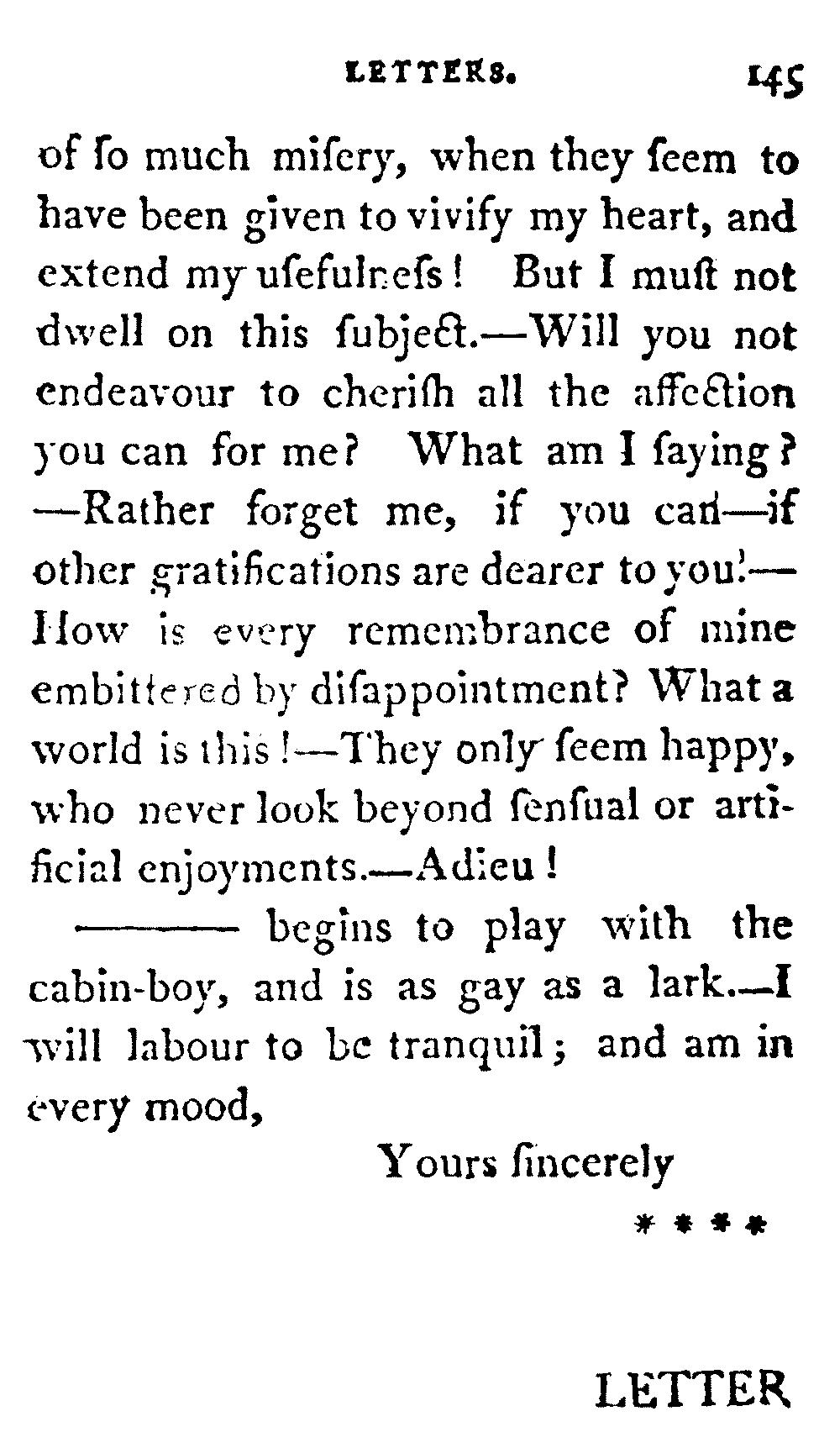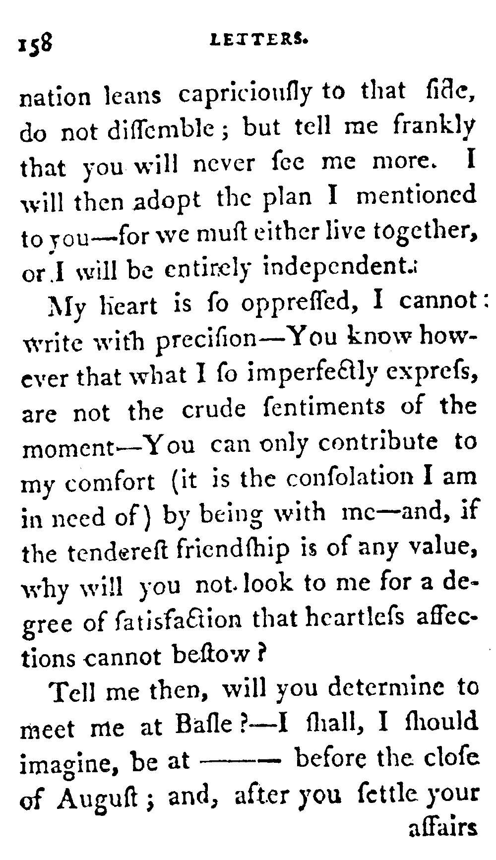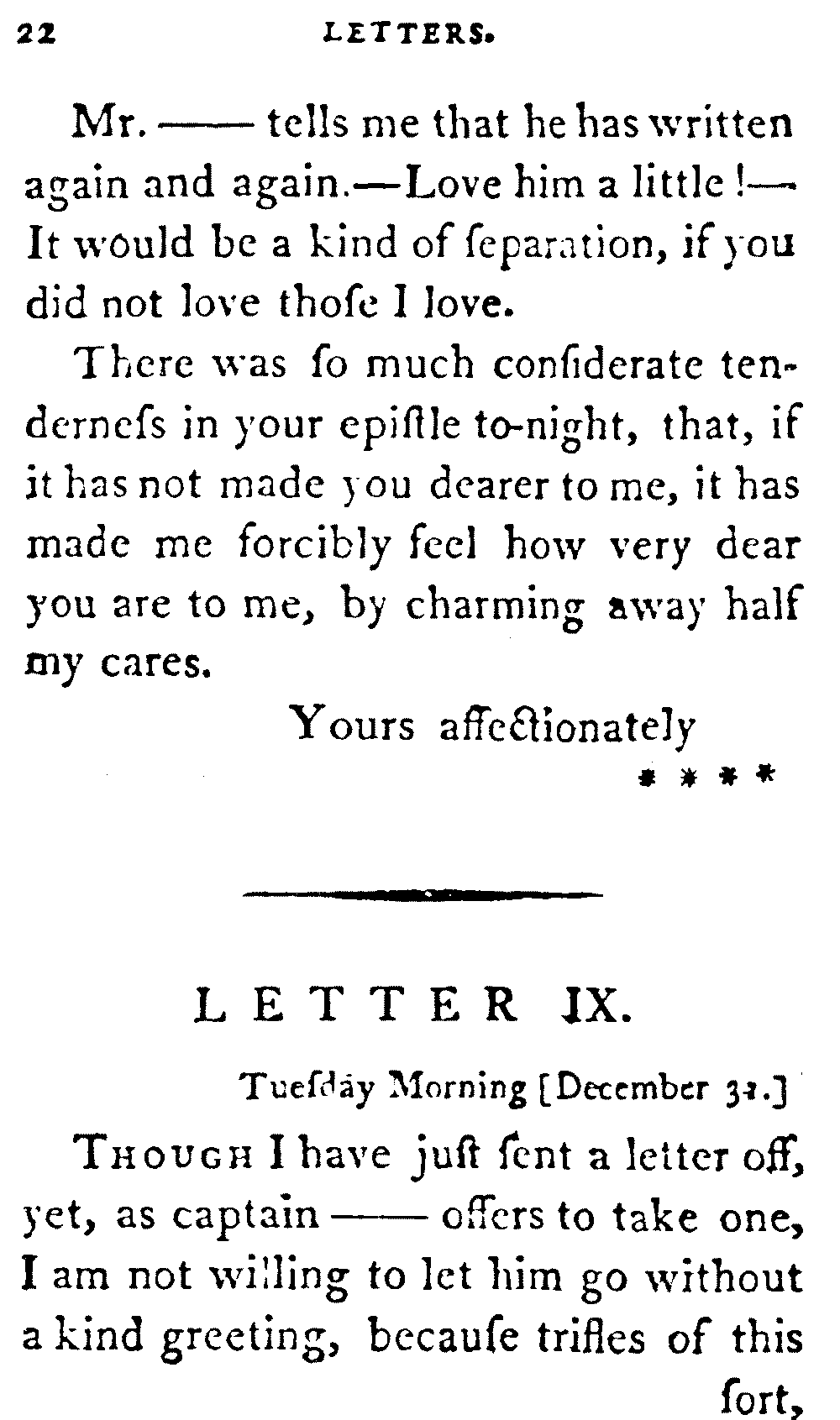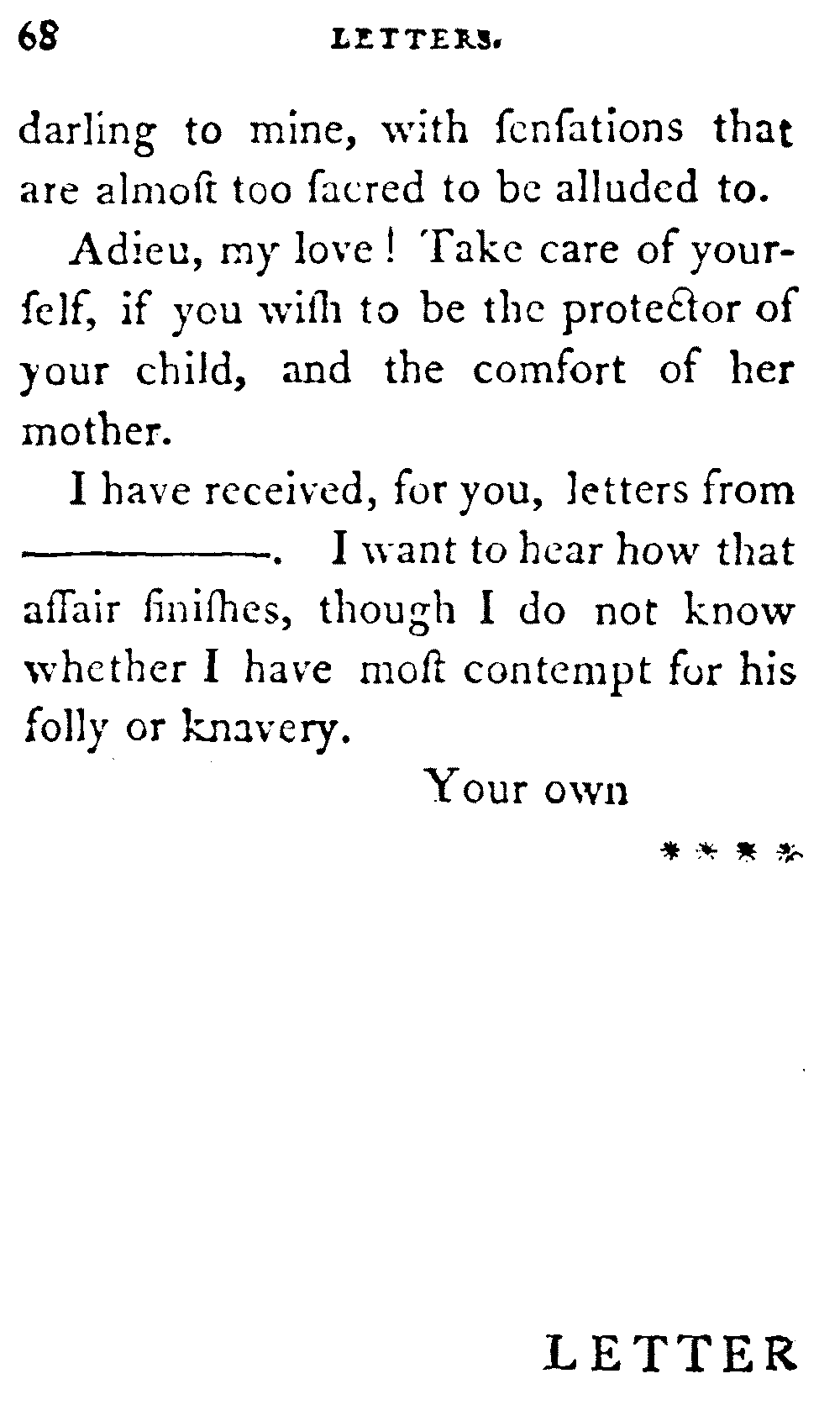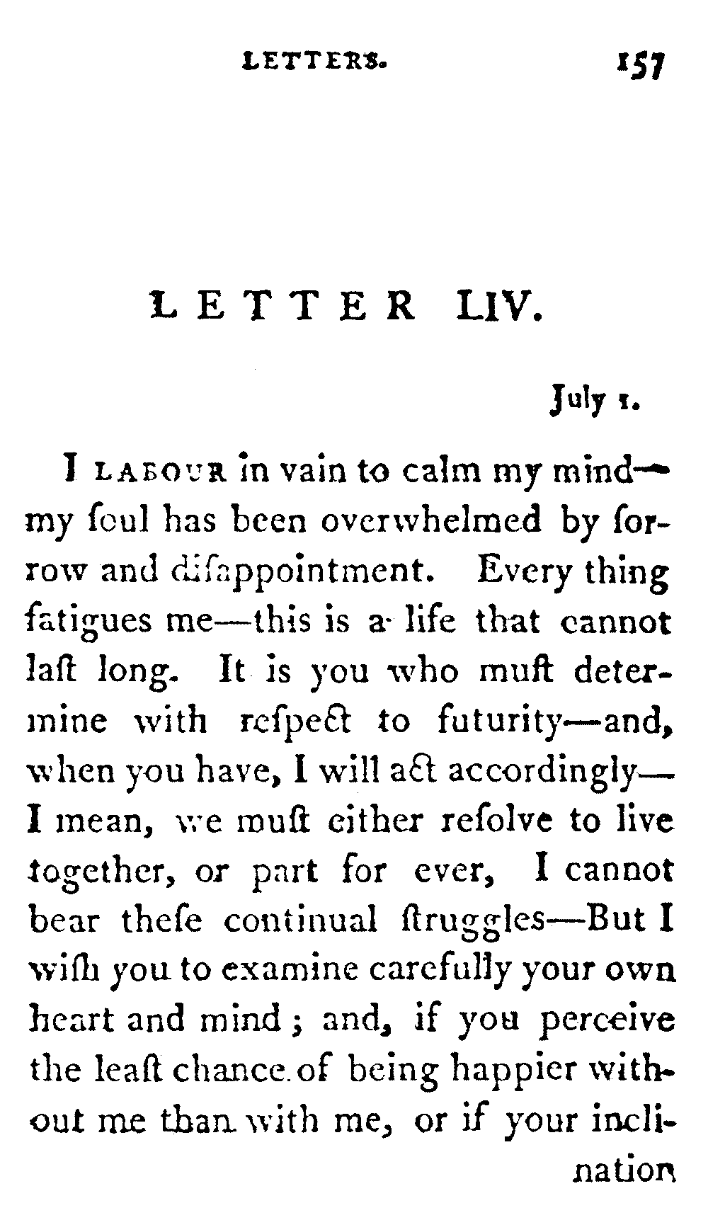 Feebly did I afterwards combat an[142] affection, which ſeemed twiſted in every fibre of my heart. The world ſtood ſtill when I thought of him; it moved heavily at beſt, with one whoſe very conſtitution ſeemed to mark her out for miſery. But I will not dwell on the paſſion I too fondly nurſed. One only refuge had I on earth; I could not reſolutely deſolate the ſcene my fancy flew to, when worldly cares, when a knowledge of mankind, which my circumſtances forced on me, rendered every other inſipid. I was afraid of the unmarked vacuity of common life; yet, though I ſupinely indulged myſelf in fairy-land, when I ought to have been more actively employed, virtue was ſtill the firſt mover of my actions; ſhe dreſſed my love in ſuch enchanting colours, and ſpread the net I could never break. Our correſponding feelings confounded[143] our very ſouls; and in many converſations we almoſt intuitively diſcerned each other's ſentiments; the heart opened itſelf, not chilled by reſerve, nor afraid of miſconſtruction. But, if virtue inſpired love, love gave new energy to virtue, and abſorbed every ſelfiſh paſſion. Never did even a wiſh eſcape me, that my lover ſhould not fulfil the hard duties which fate had impoſed on him. I only diſſembled with him in one particular; I endeavoured to ſoften his wife's too conſpicuous follies, and extenuated her failings in an indirect manner. To this I was prompted by a loftineſs of ſpirit; I ſhould have broken the band of life, had I ceaſed to reſpect myſelf. But I will haſten to an important change in my circumſtances.