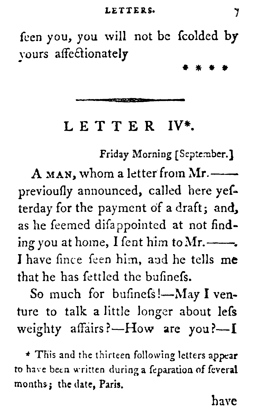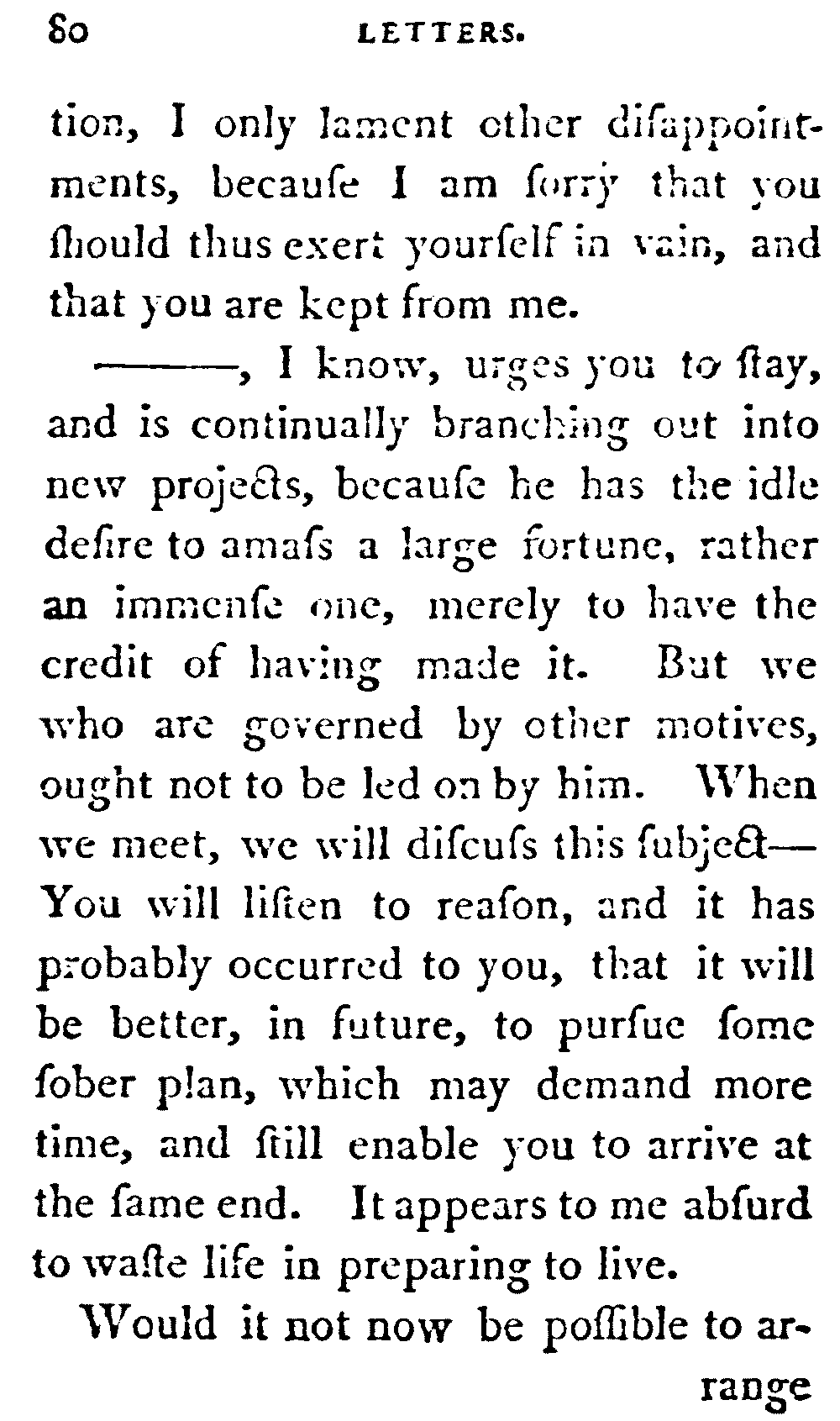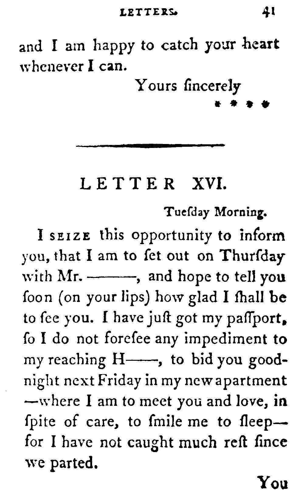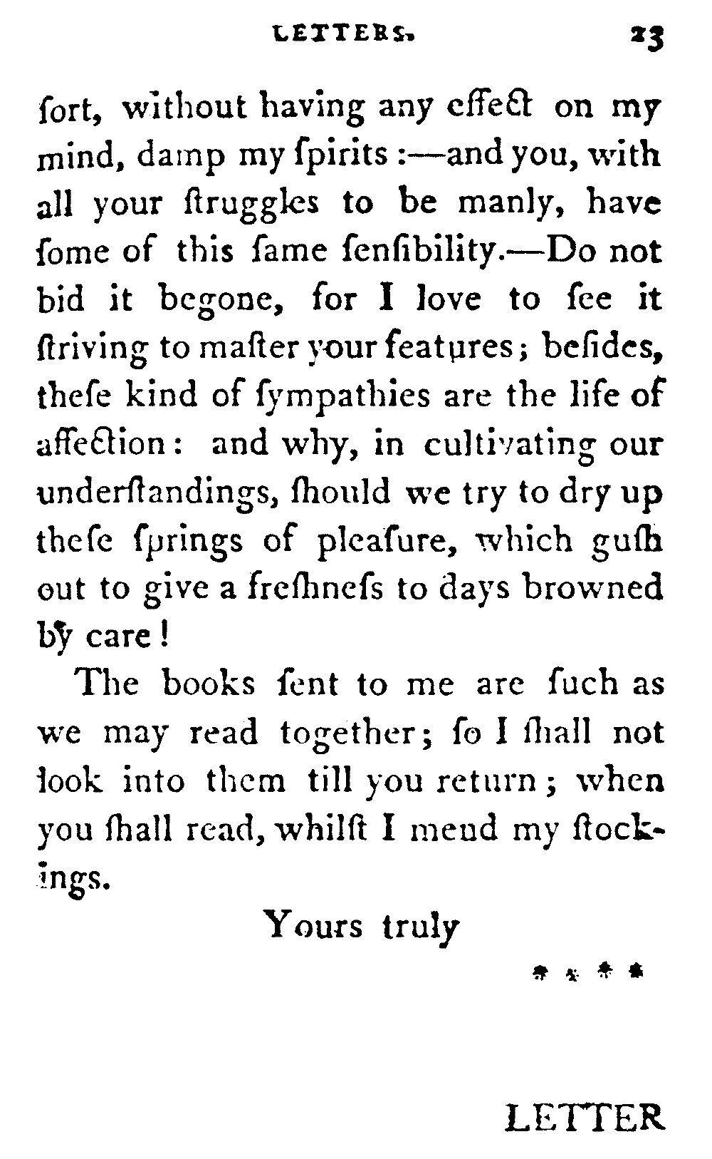 Feebly did I afterwards combat an[142] affection, which ſeemed twiſted in every fibre of my heart. The world ſtood ſtill when I thought of him; it moved heavily at beſt, with one whoſe very conſtitution ſeemed to mark her out for miſery. But I will not dwell on the paſſion I too fondly nurſed. One only refuge had I on earth; I could not reſolutely deſolate the ſcene my fancy flew to, when worldly cares, when a knowledge of mankind, which my circumſtances forced on me, rendered every other inſipid. I was afraid of the unmarked vacuity of common life; yet, though I ſupinely indulged myſelf in fairy-land, when I ought to have been more actively employed, virtue was ſtill the firſt mover of my actions; ſhe dreſſed my love in ſuch enchanting colours, and ſpread the net I could never break. Our correſponding feelings confounded[143] our very ſouls; and in many converſations we almoſt intuitively diſcerned each other's ſentiments; the heart opened itſelf, not chilled by reſerve, nor afraid of miſconſtruction. But, if virtue inſpired love, love gave new energy to virtue, and abſorbed every ſelfiſh paſſion. Never did even a wiſh eſcape me, that my lover ſhould not fulfil the hard duties which fate had impoſed on him. I only diſſembled with him in one particular; I endeavoured to ſoften his wife's too conſpicuous follies, and extenuated her failings in an indirect manner. To this I was prompted by a loftineſs of ſpirit; I ſhould have broken the band of life, had I ceaſed to reſpect myſelf. But I will haſten to an important change in my circumſtances.