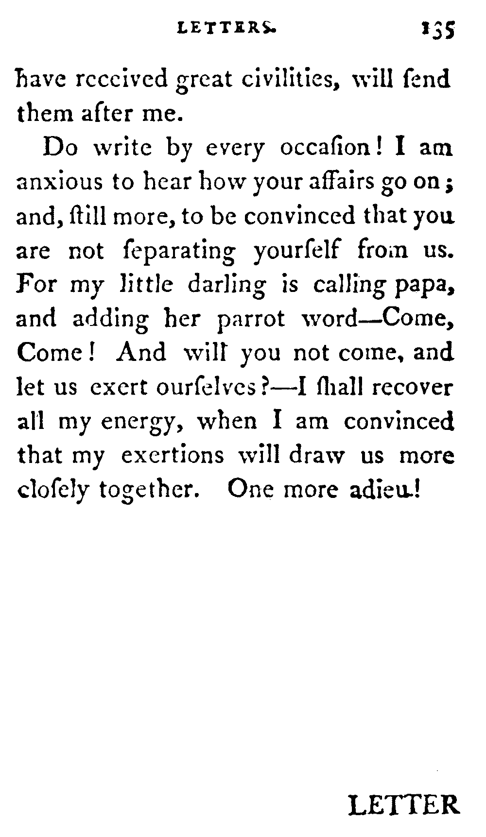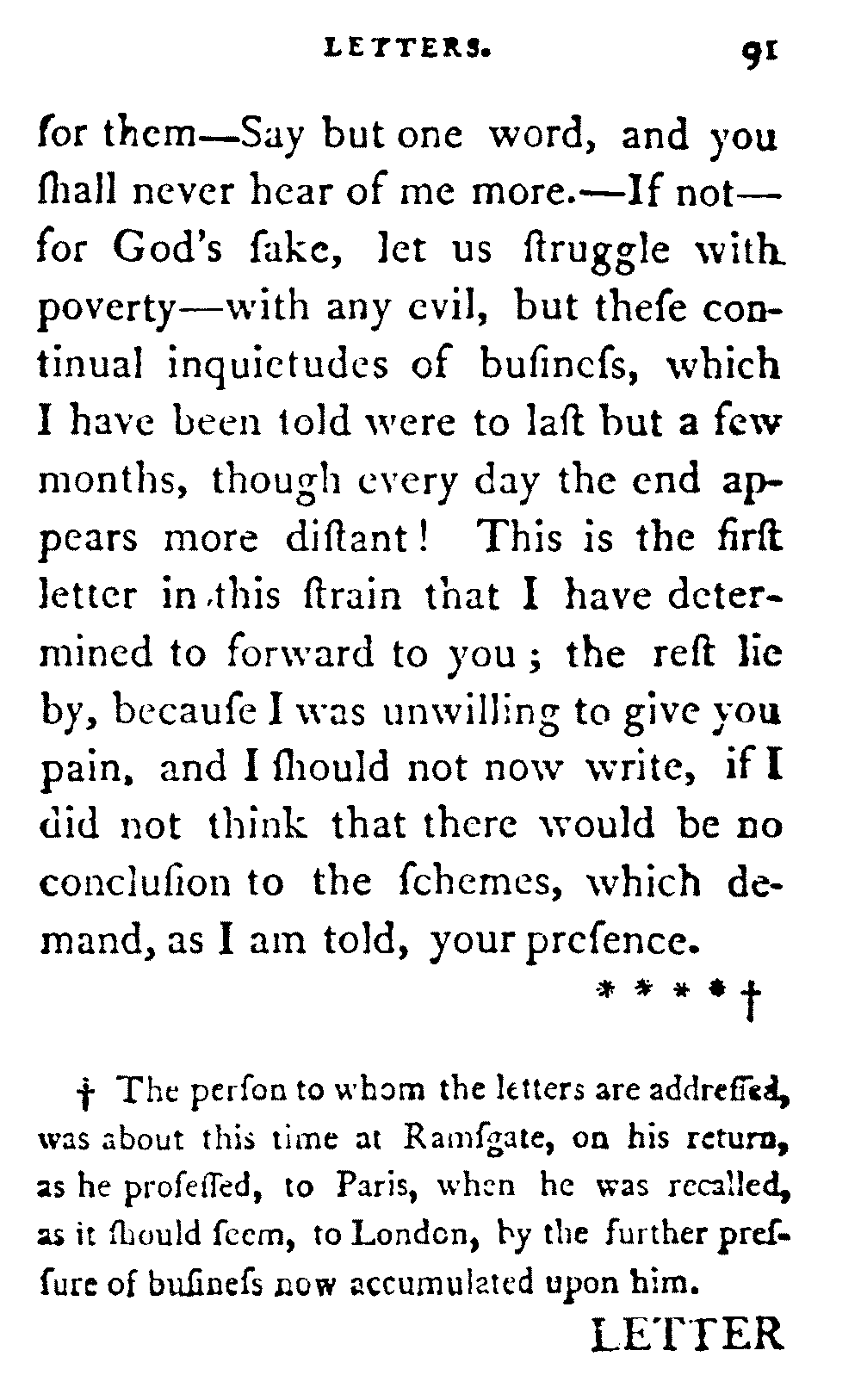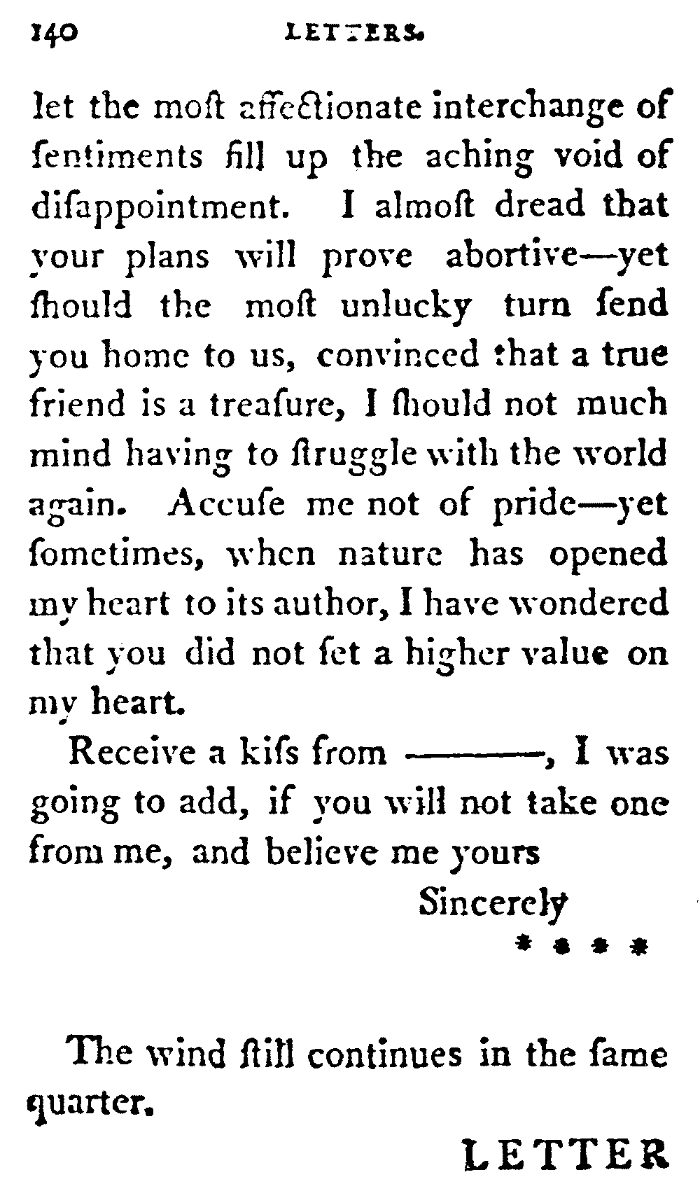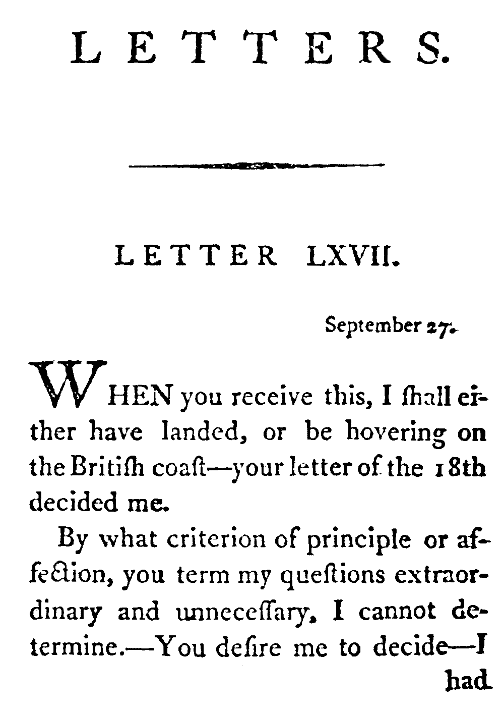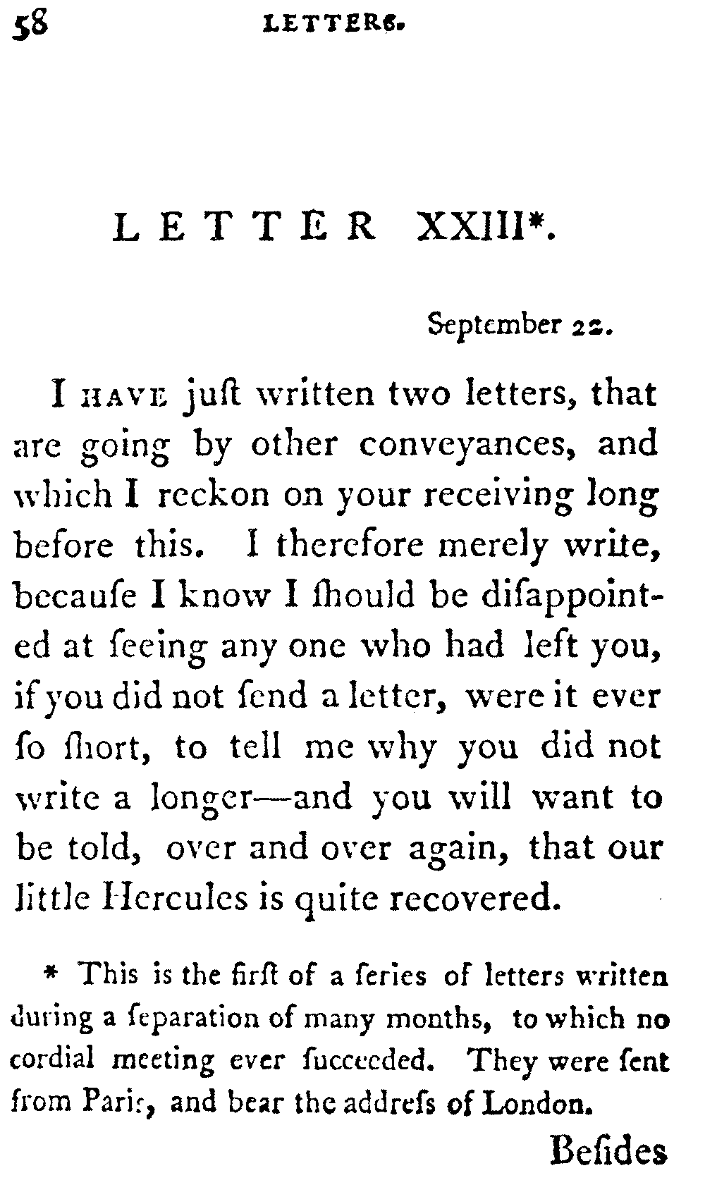 Feebly did I afterwards combat an[142] affection, which ſeemed twiſted in every fibre of my heart. The world ſtood ſtill when I thought of him; it moved heavily at beſt, with one whoſe very conſtitution ſeemed to mark her out for miſery. But I will not dwell on the paſſion I too fondly nurſed. One only refuge had I on earth; I could not reſolutely deſolate the ſcene my fancy flew to, when worldly cares, when a knowledge of mankind, which my circumſtances forced on me, rendered every other inſipid. I was afraid of the unmarked vacuity of common life; yet, though I ſupinely indulged myſelf in fairy-land, when I ought to have been more actively employed, virtue was ſtill the firſt mover of my actions; ſhe dreſſed my love in ſuch enchanting colours, and ſpread the net I could never break. Our correſponding feelings confounded[143] our very ſouls; and in many converſations we almoſt intuitively diſcerned each other's ſentiments; the heart opened itſelf, not chilled by reſerve, nor afraid of miſconſtruction. But, if virtue inſpired love, love gave new energy to virtue, and abſorbed every ſelfiſh paſſion. Never did even a wiſh eſcape me, that my lover ſhould not fulfil the hard duties which fate had impoſed on him. I only diſſembled with him in one particular; I endeavoured to ſoften his wife's too conſpicuous follies, and extenuated her failings in an indirect manner. To this I was prompted by a loftineſs of ſpirit; I ſhould have broken the band of life, had I ceaſed to reſpect myſelf. But I will haſten to an important change in my circumſtances.