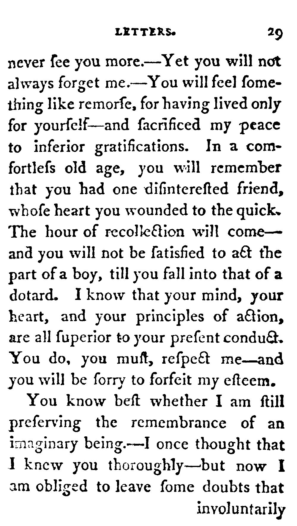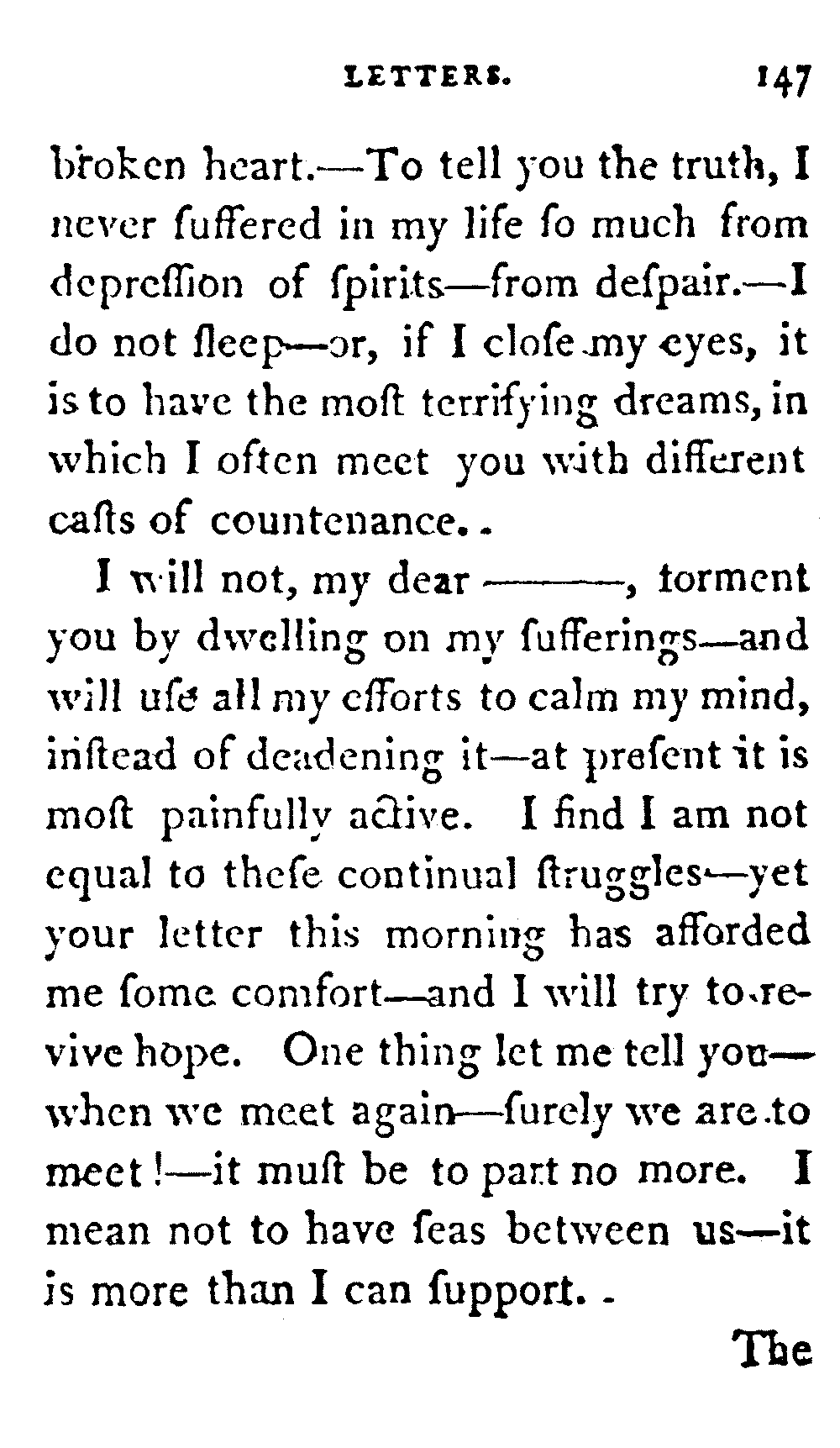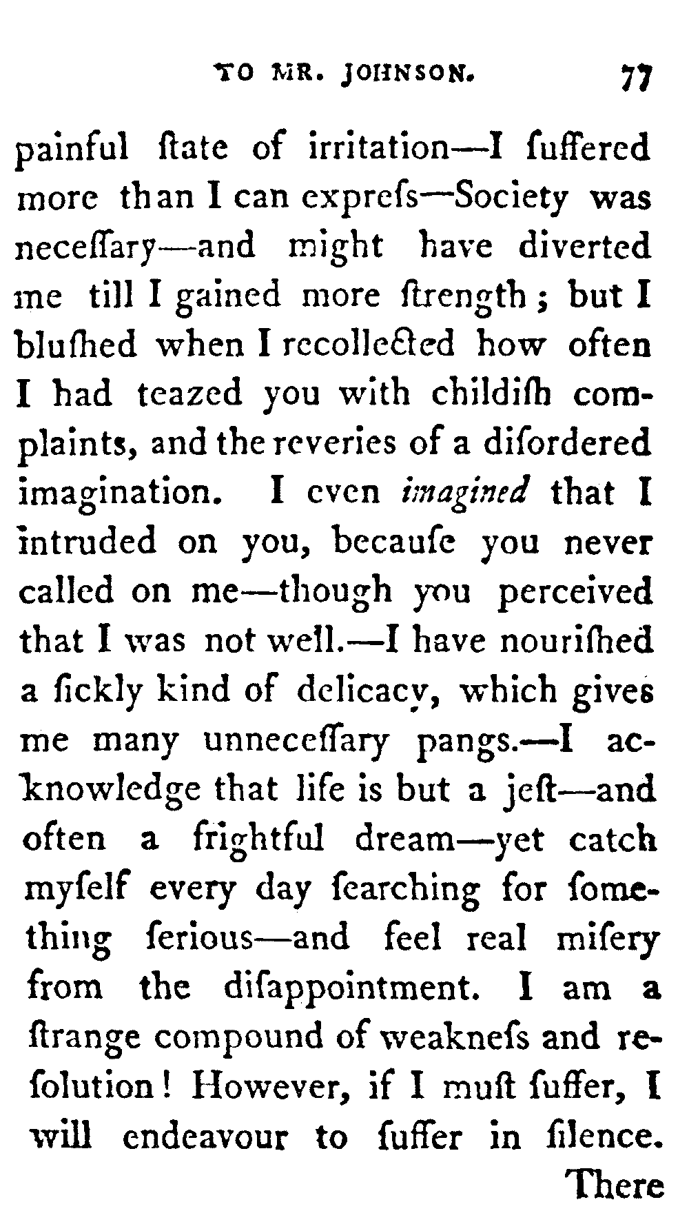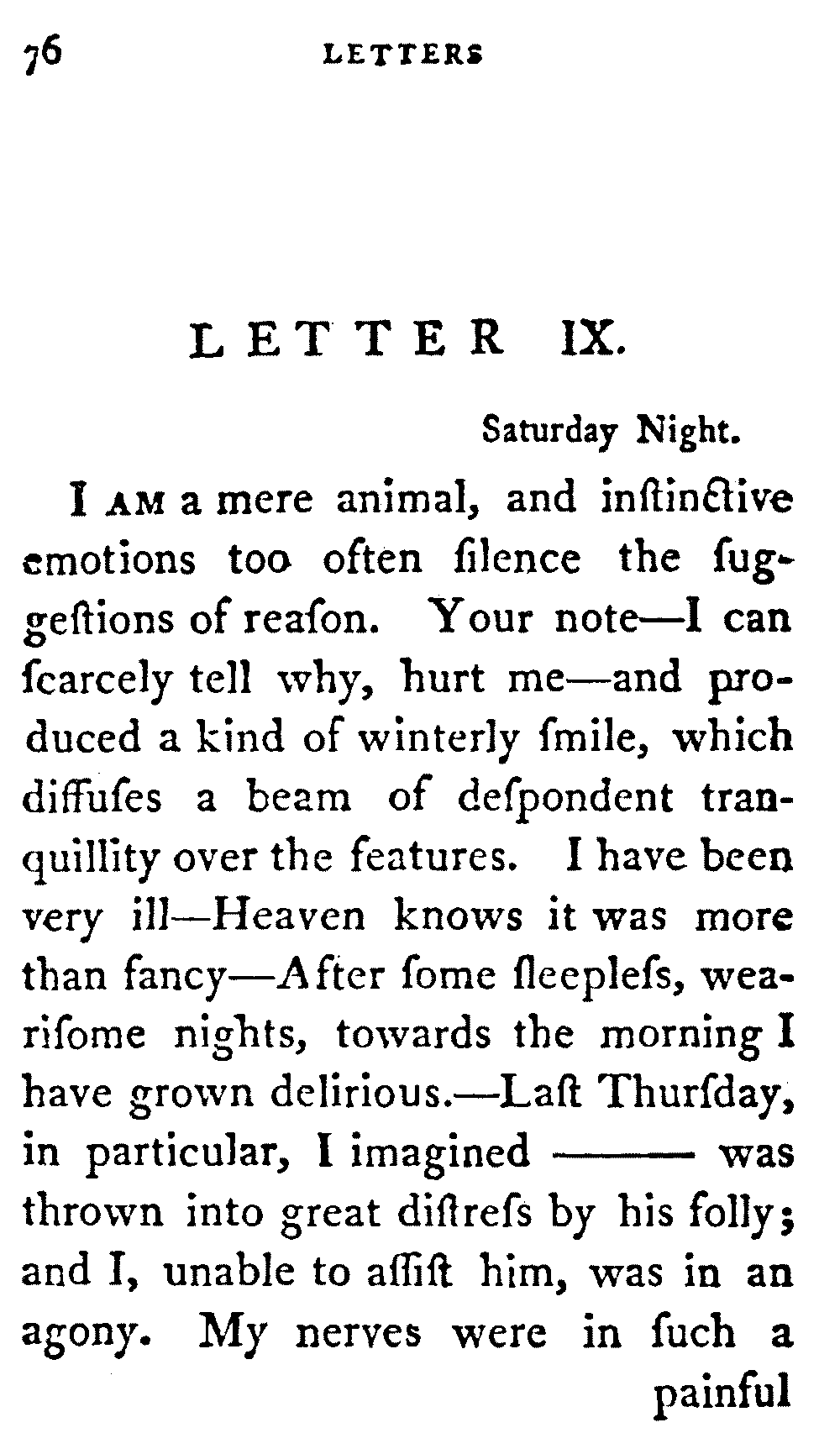 Two years paſſed in this manner, ſilently rooting my affection; and it might have continued calm, if a fever had not brought him to the very verge of the grave. Though ſtill deceived, I was miſerable that the cuſtoms of the world did not allow me to watch by him; when ſleep forſook his pillow, my wearied eyes were not cloſed, and my anxious ſpirit hovered round his bed. I ſaw him, before he had recovered his ſtrength; and, when his hand touched[141] mine, life almoſt retired, or flew to meet the touch. The firſt look found a ready way to my heart, and thrilled through every vein. We were left alone, and inſenſibly began to talk of the immortality of the ſoul; I declared that I could not live without this conviction. In the ardour of converſation he preſſed my hand to his heart; it reſted there a moment, and my emotions gave weight to my opinion, for the affection we felt was not of a periſhable nature.—A ſilence enſued, I know not how long; he then threw my hand from him, as if it had been a ſerpent; formally complained of the weather, and adverted to twenty other unintereſting ſubjects. Vain efforts! Our hearts had already ſpoken to each other.