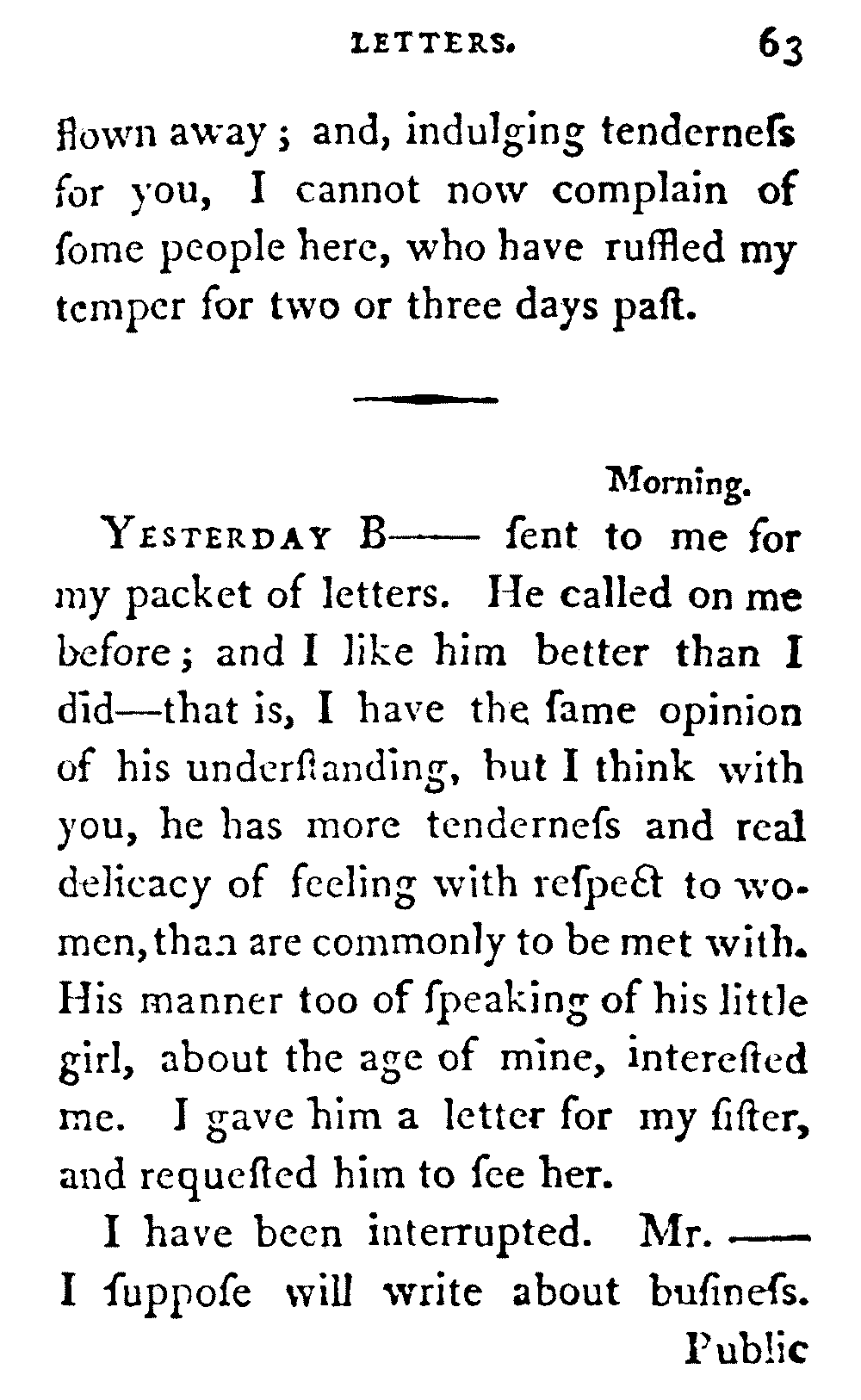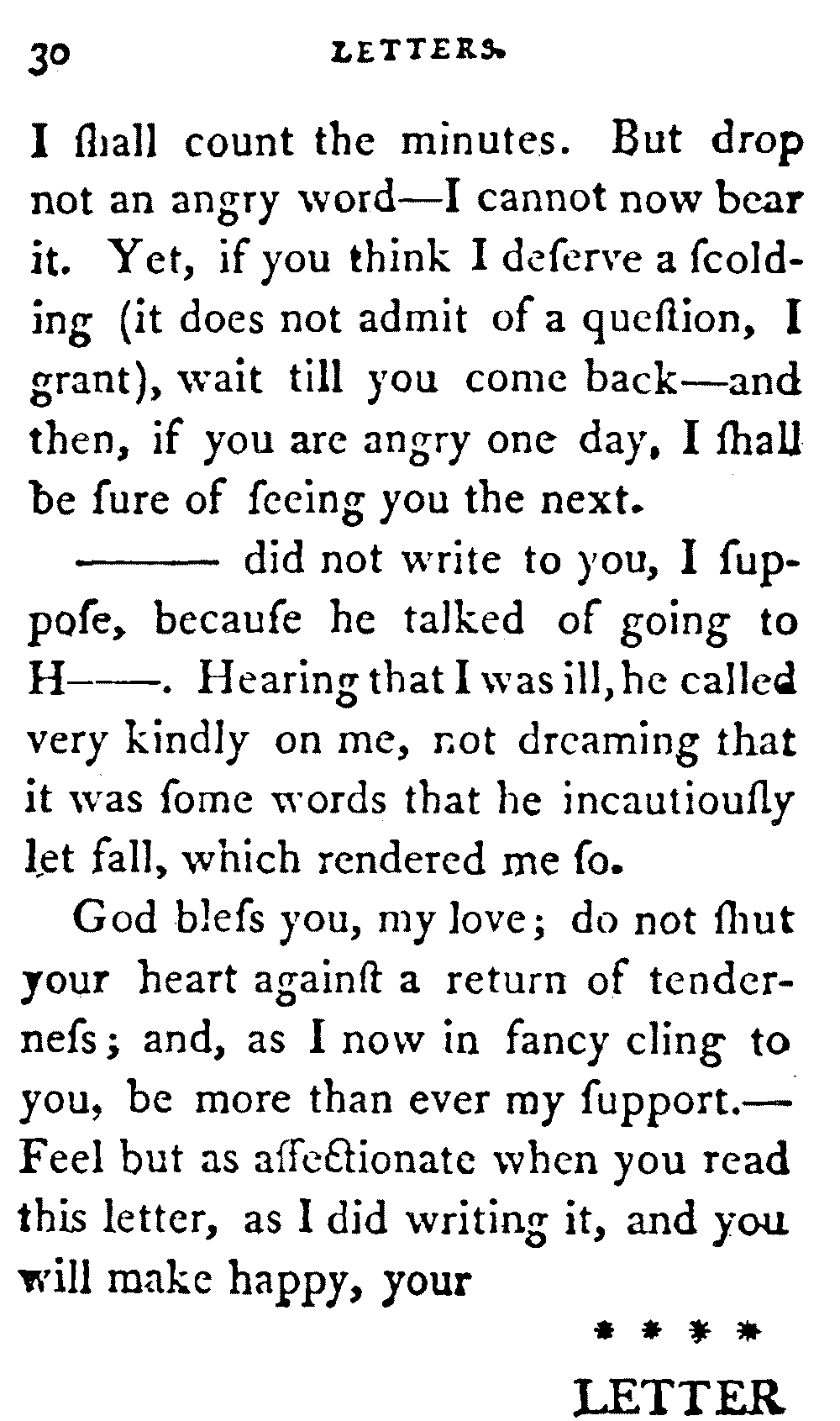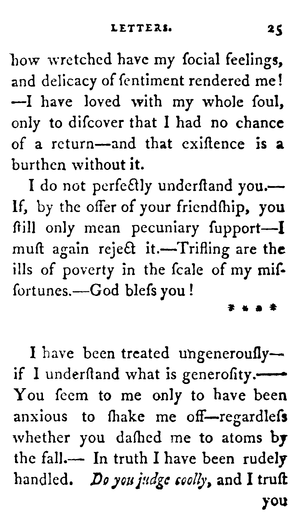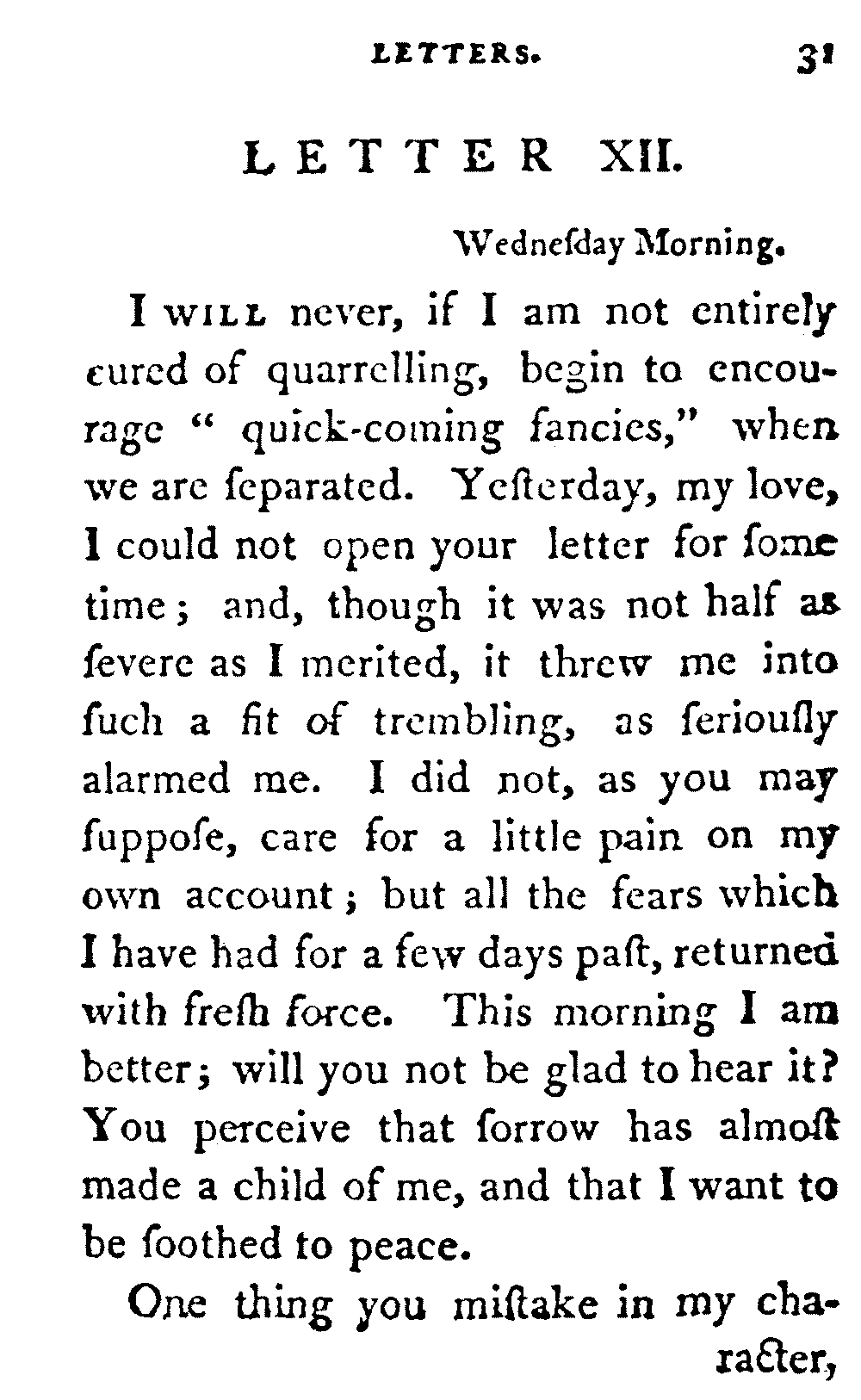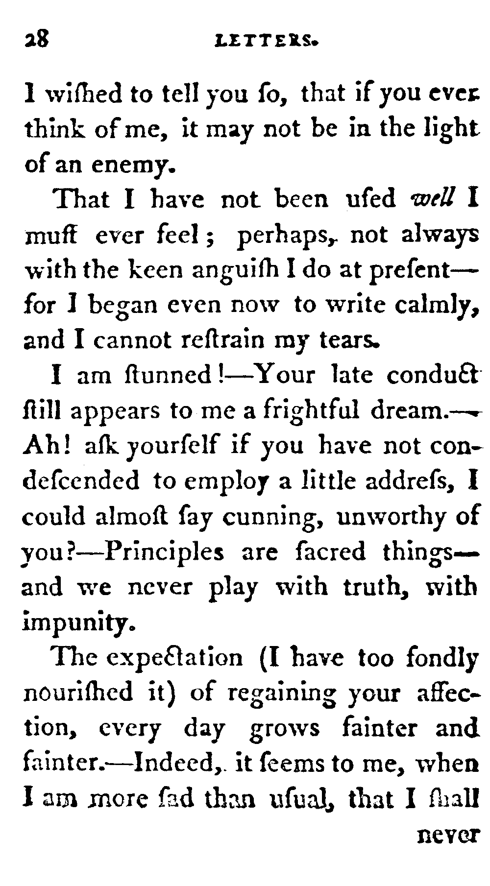 Two years paſſed in this manner, ſilently rooting my affection; and it might have continued calm, if a fever had not brought him to the very verge of the grave. Though ſtill deceived, I was miſerable that the cuſtoms of the world did not allow me to watch by him; when ſleep forſook his pillow, my wearied eyes were not cloſed, and my anxious ſpirit hovered round his bed. I ſaw him, before he had recovered his ſtrength; and, when his hand touched[141] mine, life almoſt retired, or flew to meet the touch. The firſt look found a ready way to my heart, and thrilled through every vein. We were left alone, and inſenſibly began to talk of the immortality of the ſoul; I declared that I could not live without this conviction. In the ardour of converſation he preſſed my hand to his heart; it reſted there a moment, and my emotions gave weight to my opinion, for the affection we felt was not of a periſhable nature.—A ſilence enſued, I know not how long; he then threw my hand from him, as if it had been a ſerpent; formally complained of the weather, and adverted to twenty other unintereſting ſubjects. Vain efforts! Our hearts had already ſpoken to each other.
