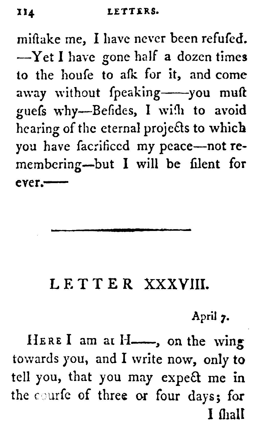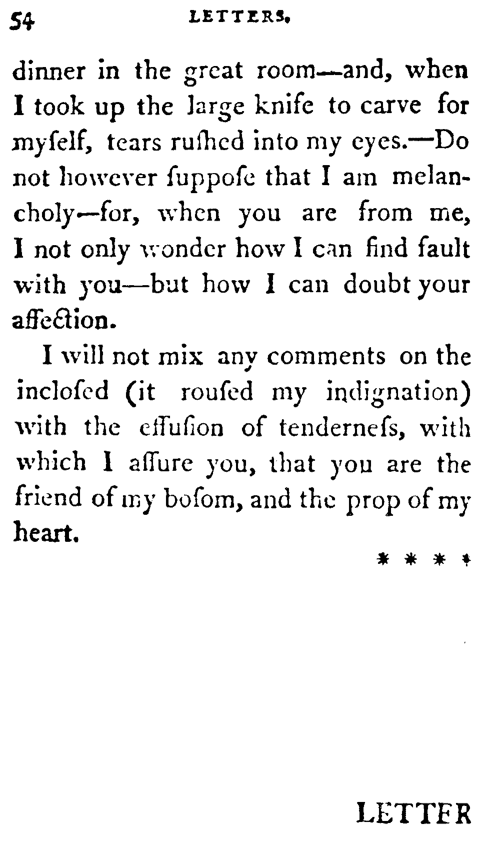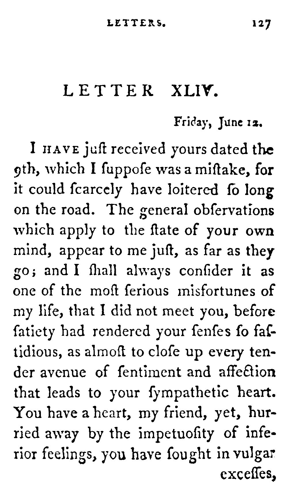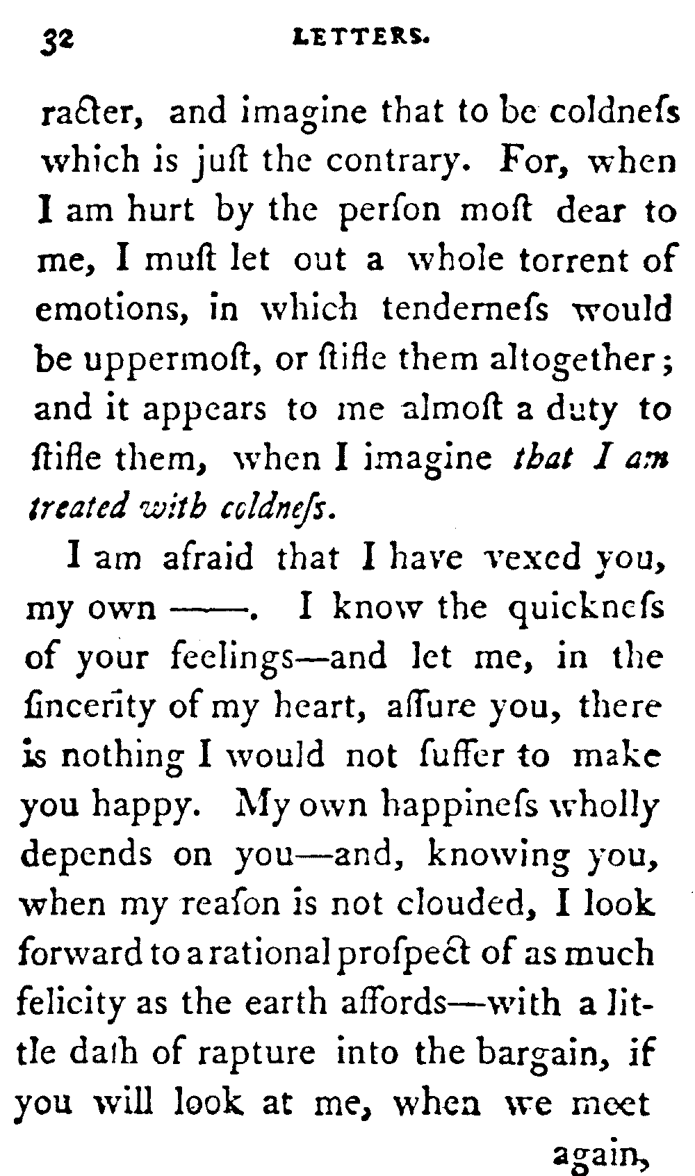 Two years paſſed in this manner, ſilently rooting my affection; and it might have continued calm, if a fever had not brought him to the very verge of the grave. Though ſtill deceived, I was miſerable that the cuſtoms of the world did not allow me to watch by him; when ſleep forſook his pillow, my wearied eyes were not cloſed, and my anxious ſpirit hovered round his bed. I ſaw him, before he had recovered his ſtrength; and, when his hand touched[141] mine, life almoſt retired, or flew to meet the touch. The firſt look found a ready way to my heart, and thrilled through every vein. We were left alone, and inſenſibly began to talk of the immortality of the ſoul; I declared that I could not live without this conviction. In the ardour of converſation he preſſed my hand to his heart; it reſted there a moment, and my emotions gave weight to my opinion, for the affection we felt was not of a periſhable nature.—A ſilence enſued, I know not how long; he then threw my hand from him, as if it had been a ſerpent; formally complained of the weather, and adverted to twenty other unintereſting ſubjects. Vain efforts! Our hearts had already ſpoken to each other.