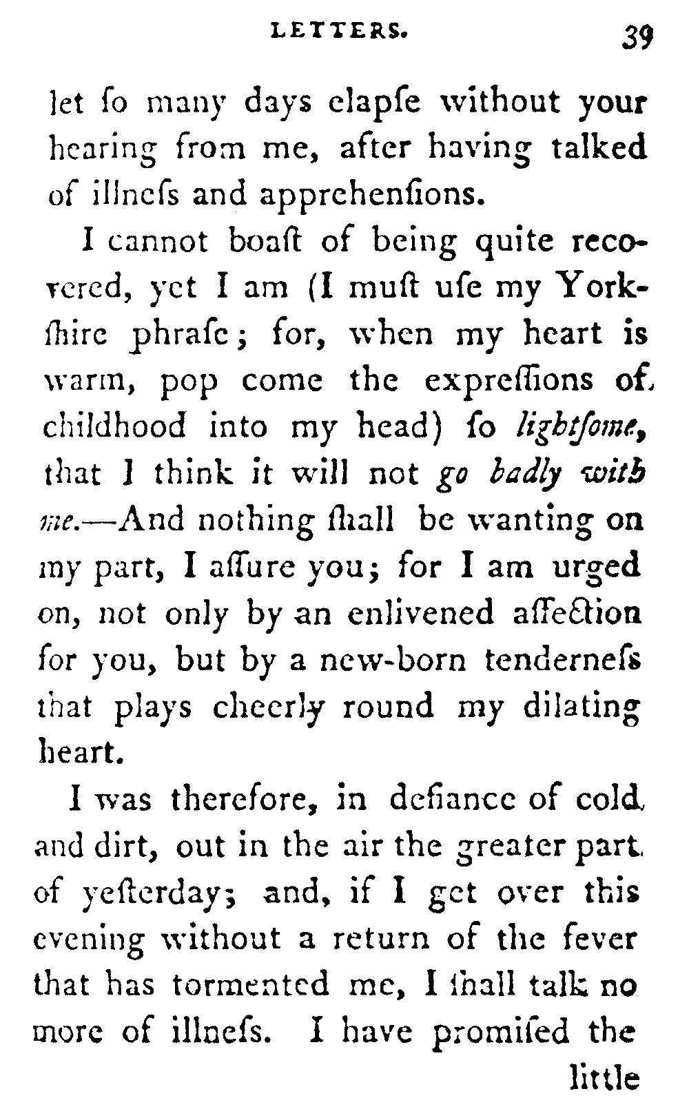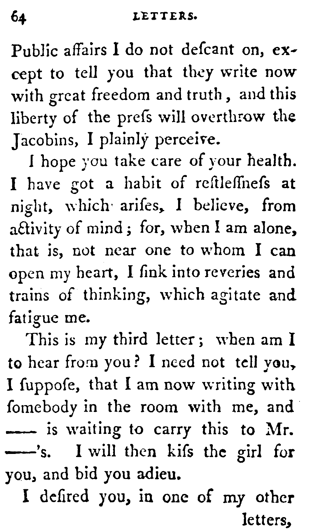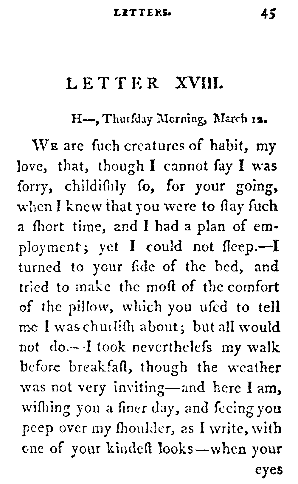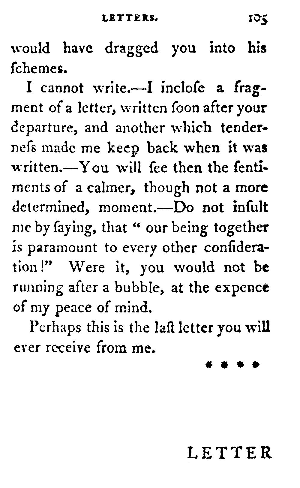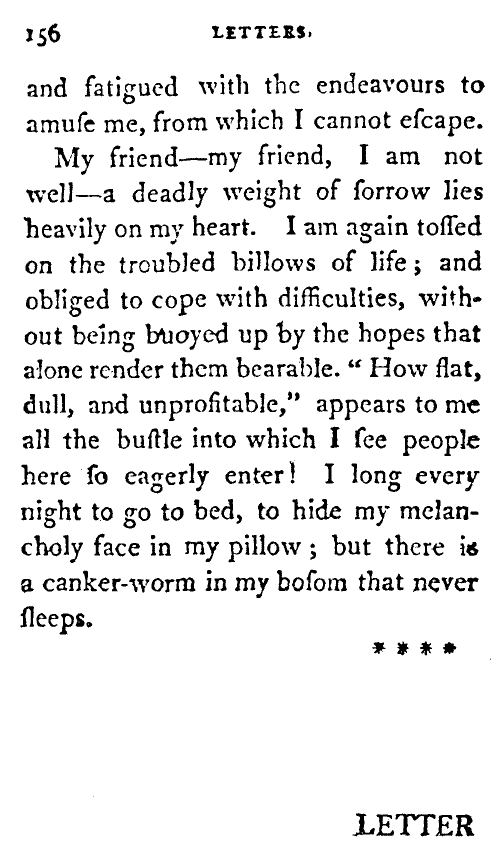 Two years paſſed in this manner, ſilently rooting my affection; and it might have continued calm, if a fever had not brought him to the very verge of the grave. Though ſtill deceived, I was miſerable that the cuſtoms of the world did not allow me to watch by him; when ſleep forſook his pillow, my wearied eyes were not cloſed, and my anxious ſpirit hovered round his bed. I ſaw him, before he had recovered his ſtrength; and, when his hand touched[141] mine, life almoſt retired, or flew to meet the touch. The firſt look found a ready way to my heart, and thrilled through every vein. We were left alone, and inſenſibly began to talk of the immortality of the ſoul; I declared that I could not live without this conviction. In the ardour of converſation he preſſed my hand to his heart; it reſted there a moment, and my emotions gave weight to my opinion, for the affection we felt was not of a periſhable nature.—A ſilence enſued, I know not how long; he then threw my hand from him, as if it had been a ſerpent; formally complained of the weather, and adverted to twenty other unintereſting ſubjects. Vain efforts! Our hearts had already ſpoken to each other.