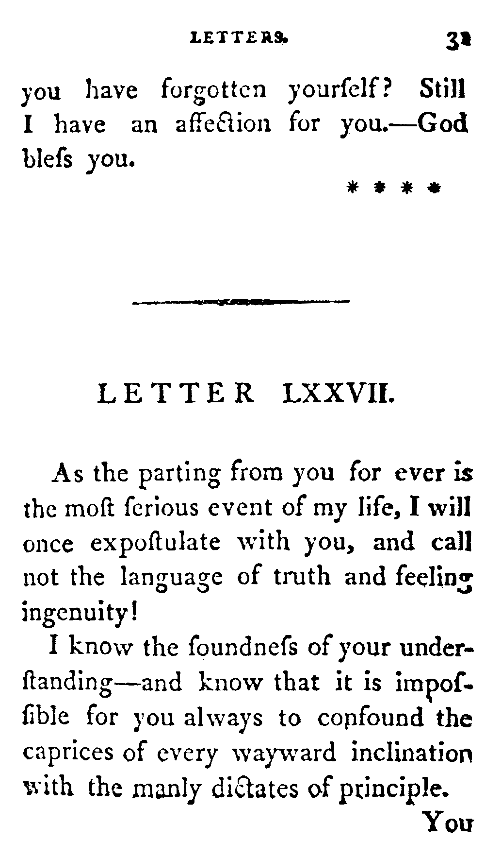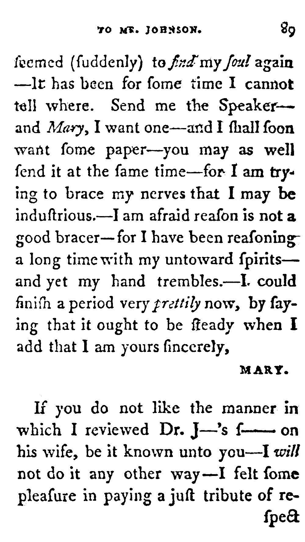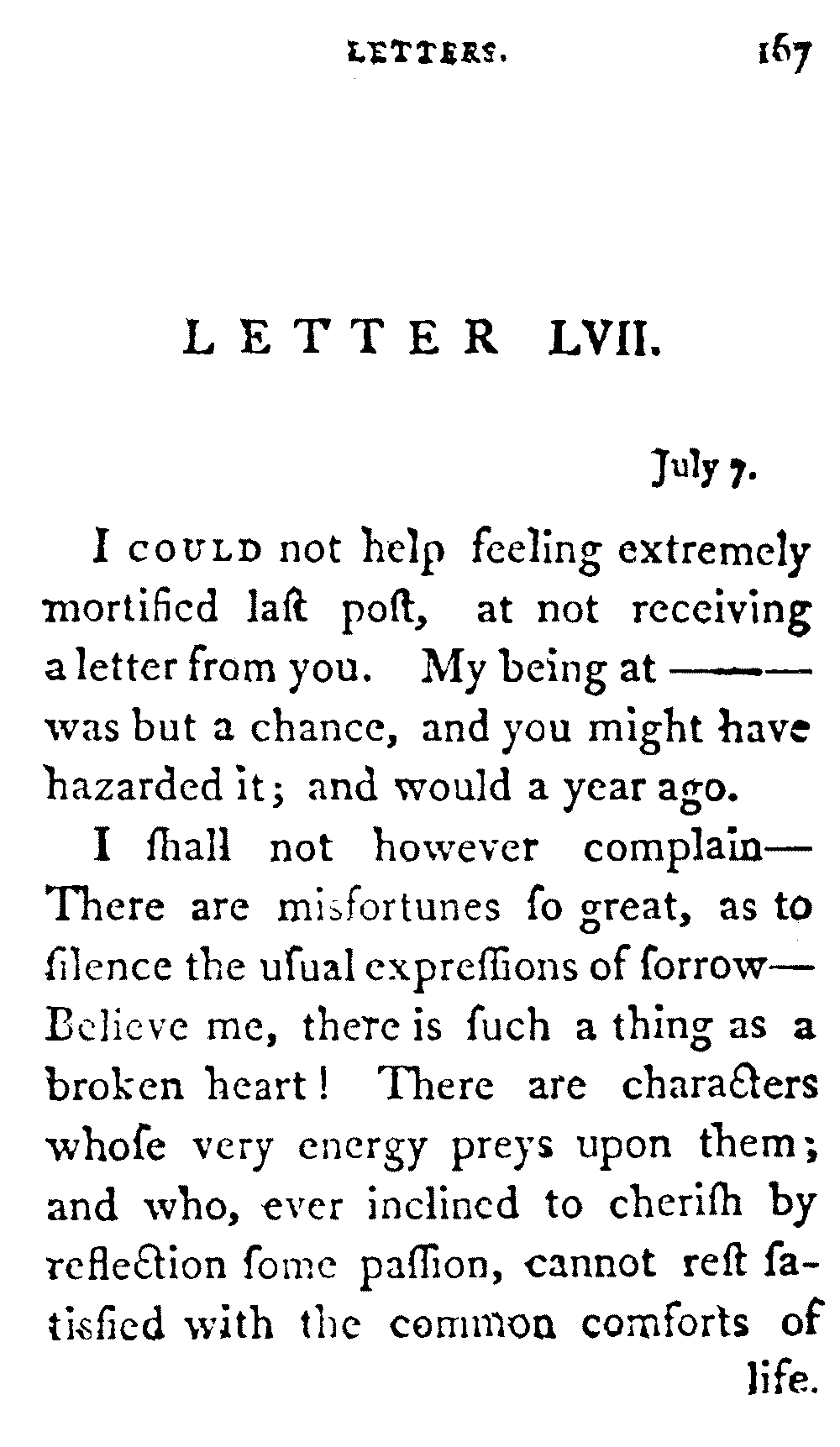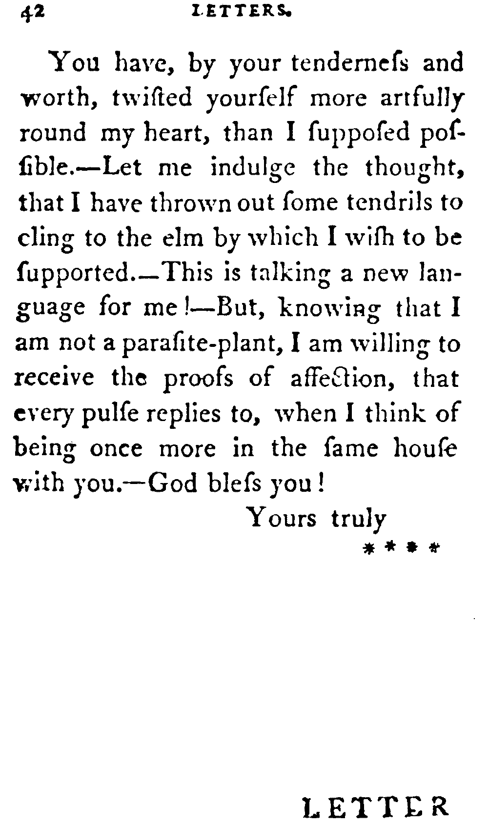 Two years paſſed in this manner, ſilently rooting my affection; and it might have continued calm, if a fever had not brought him to the very verge of the grave. Though ſtill deceived, I was miſerable that the cuſtoms of the world did not allow me to watch by him; when ſleep forſook his pillow, my wearied eyes were not cloſed, and my anxious ſpirit hovered round his bed. I ſaw him, before he had recovered his ſtrength; and, when his hand touched[141] mine, life almoſt retired, or flew to meet the touch. The firſt look found a ready way to my heart, and thrilled through every vein. We were left alone, and inſenſibly began to talk of the immortality of the ſoul; I declared that I could not live without this conviction. In the ardour of converſation he preſſed my hand to his heart; it reſted there a moment, and my emotions gave weight to my opinion, for the affection we felt was not of a periſhable nature.—A ſilence enſued, I know not how long; he then threw my hand from him, as if it had been a ſerpent; formally complained of the weather, and adverted to twenty other unintereſting ſubjects. Vain efforts! Our hearts had already ſpoken to each other.