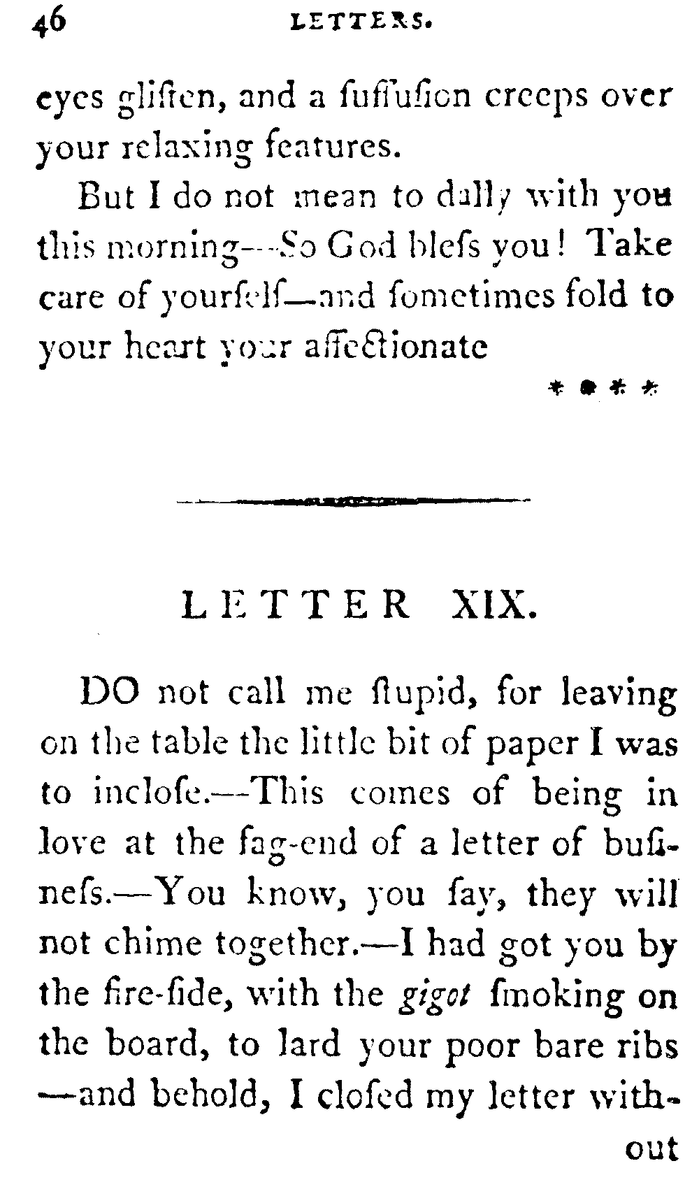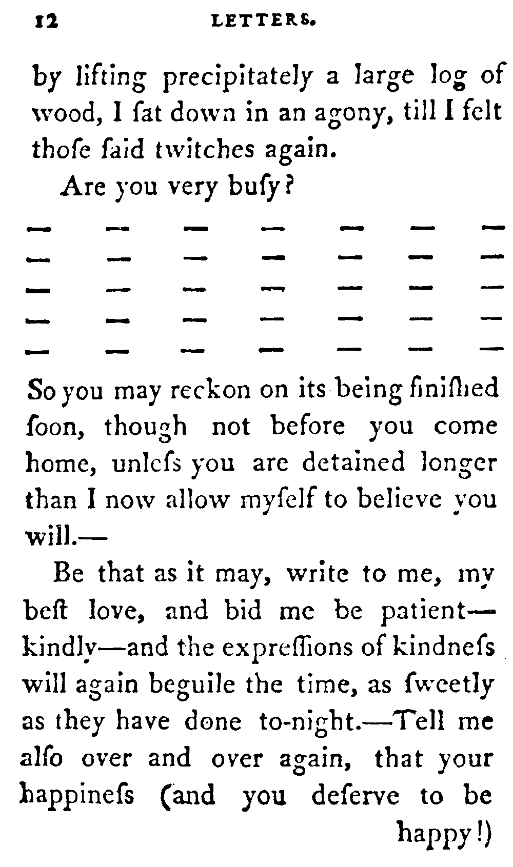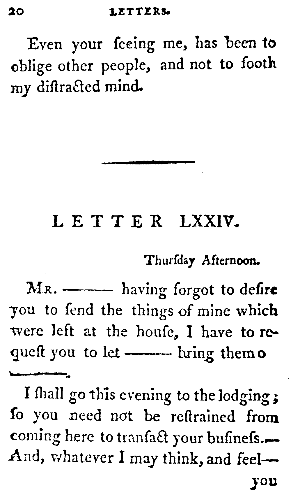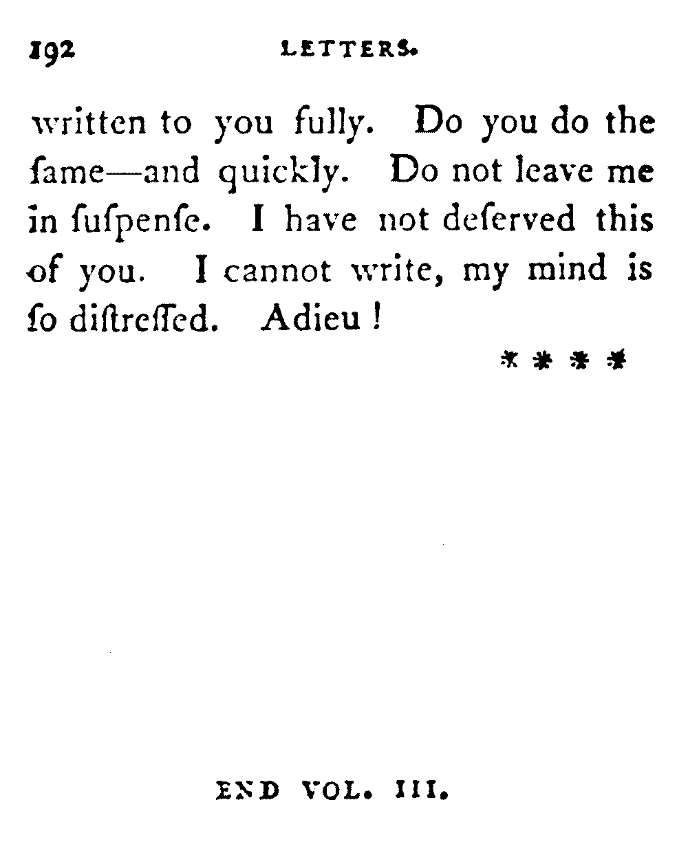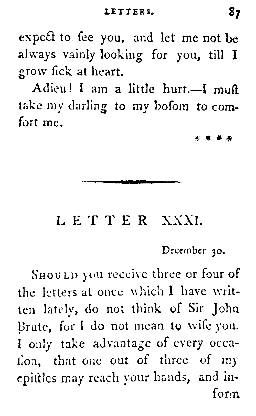 Two years paſſed in this manner, ſilently rooting my affection; and it might have continued calm, if a fever had not brought him to the very verge of the grave. Though ſtill deceived, I was miſerable that the cuſtoms of the world did not allow me to watch by him; when ſleep forſook his pillow, my wearied eyes were not cloſed, and my anxious ſpirit hovered round his bed. I ſaw him, before he had recovered his ſtrength; and, when his hand touched[141] mine, life almoſt retired, or flew to meet the touch. The firſt look found a ready way to my heart, and thrilled through every vein. We were left alone, and inſenſibly began to talk of the immortality of the ſoul; I declared that I could not live without this conviction. In the ardour of converſation he preſſed my hand to his heart; it reſted there a moment, and my emotions gave weight to my opinion, for the affection we felt was not of a periſhable nature.—A ſilence enſued, I know not how long; he then threw my hand from him, as if it had been a ſerpent; formally complained of the weather, and adverted to twenty other unintereſting ſubjects. Vain efforts! Our hearts had already ſpoken to each other.