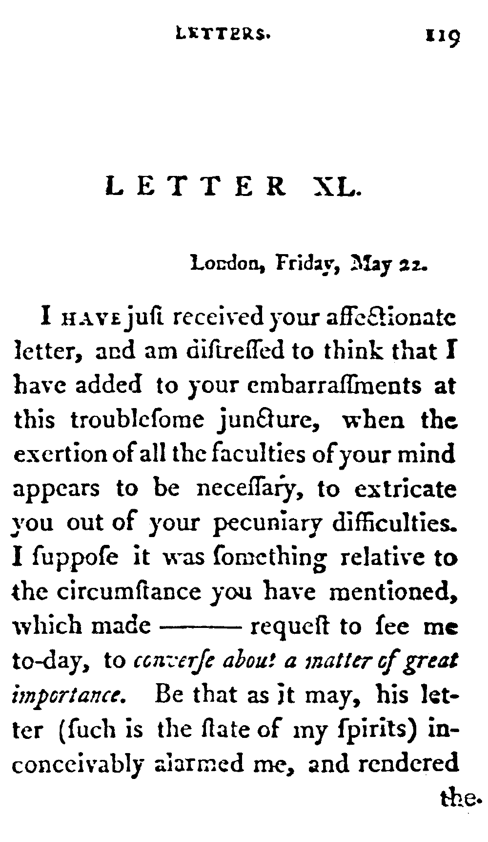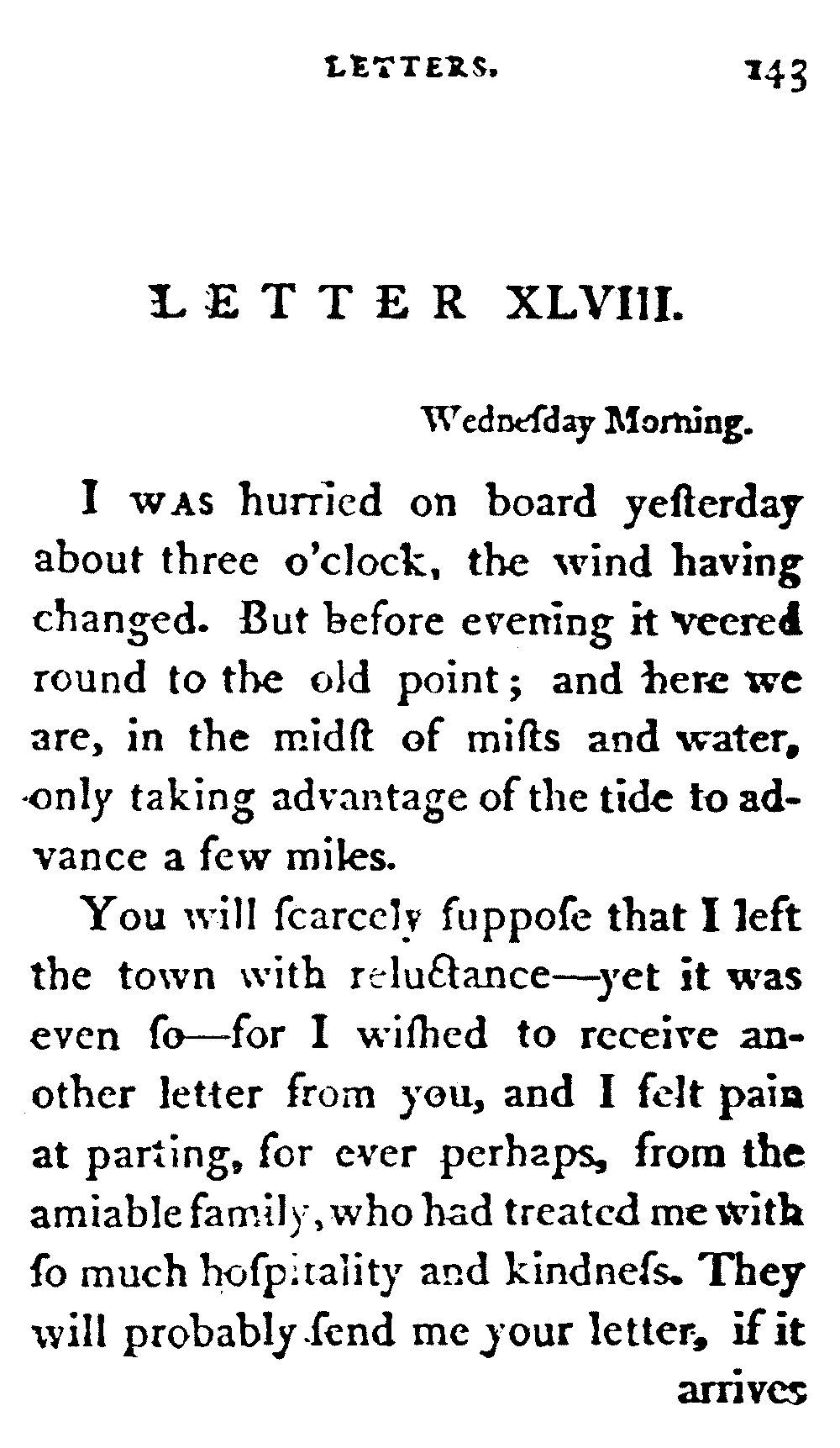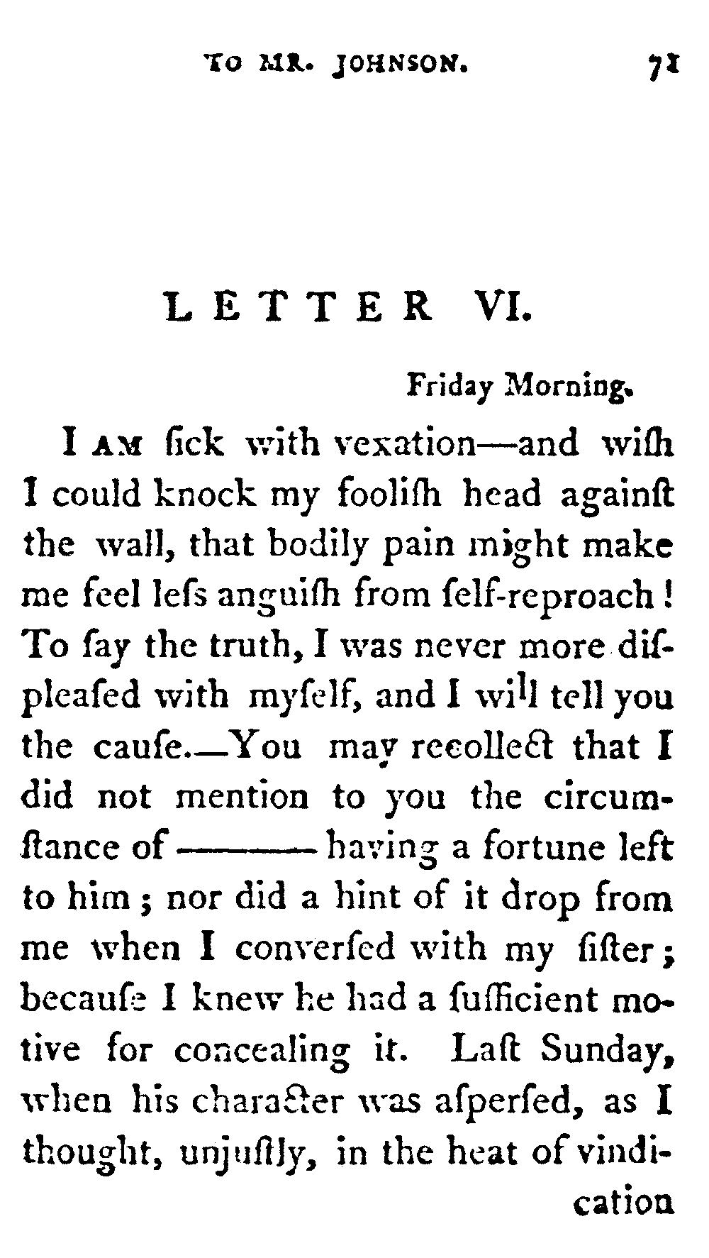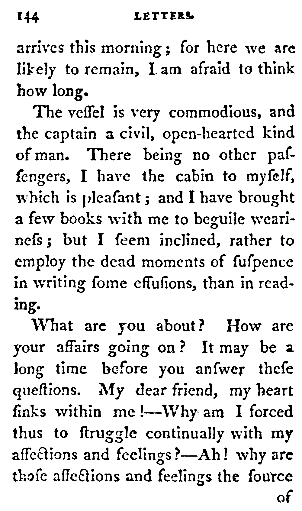 My mother, who had concealed the real ſtate of her affairs from me, was[144] now impelled to make me her confident, that I might aſſiſt to diſcharge her mighty debt of gratitude. The merchant, my more than father, had privately aſſiſted her: but a fatal civil-war reduced his large property to a bare competency; and an inflammation in his eyes, that aroſe from a cold he had caught at a wreck, which he watched during a ſtormy night to keep off the lawleſs colliers, almoſt deprived him of ſight. His life had been ſpent in ſociety, and he ſcarcely knew how to fill the void; for his ſpirit would not allow him to mix with his former equals as an humble companion; he who had been treated with uncommon reſpect, could not brook their inſulting pity. From the reſource of ſolitude, reading, the complaint in his eyes cut[145] him off, and he became our conſtant viſitor.