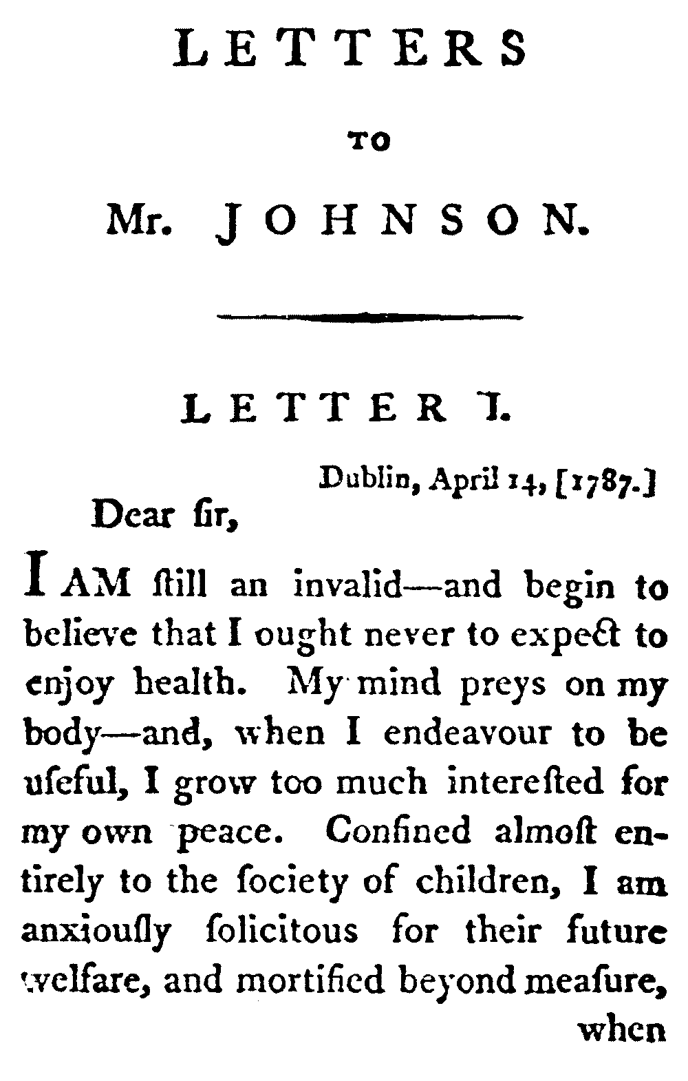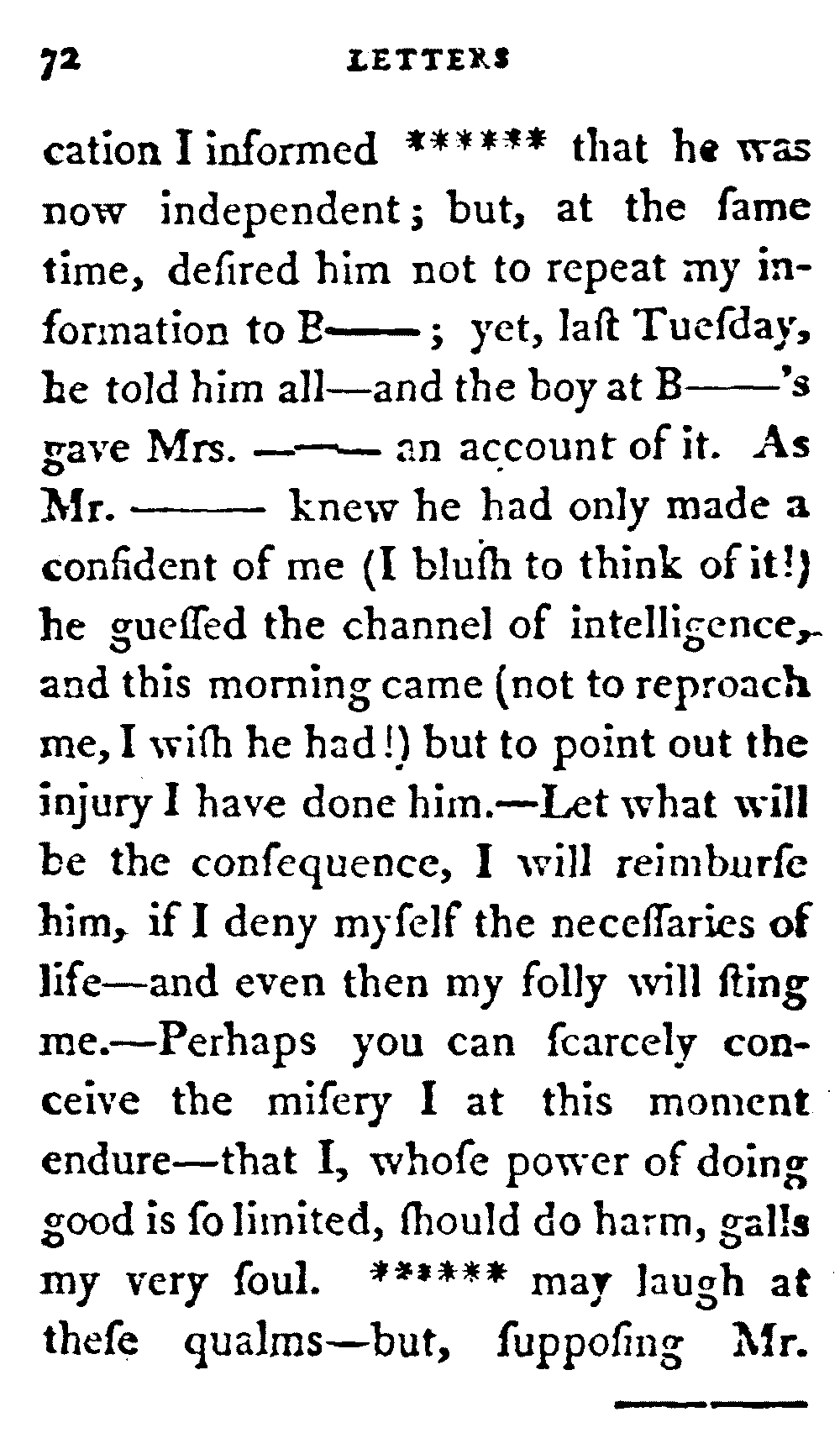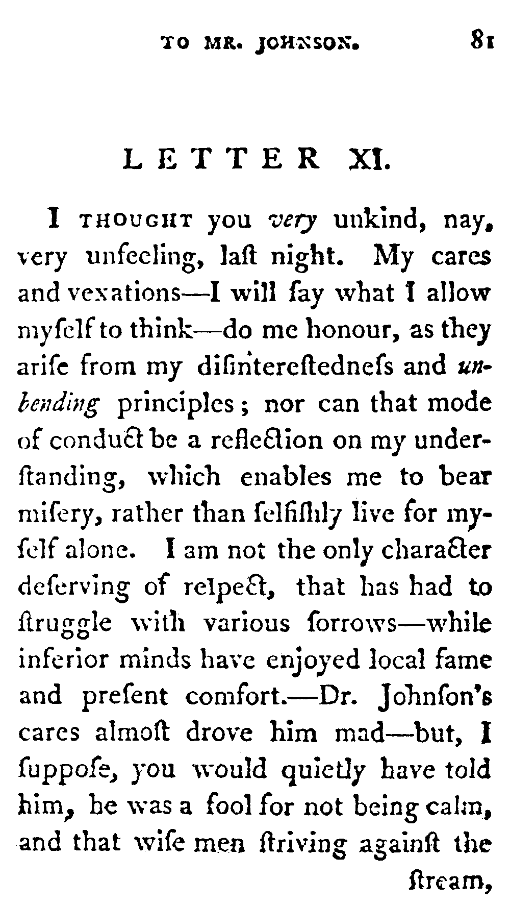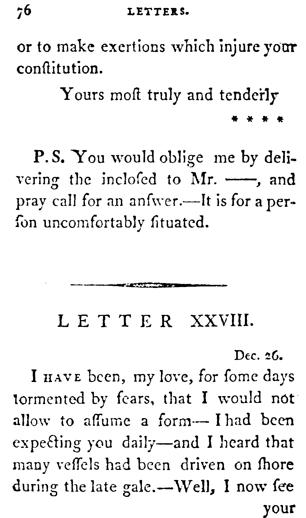 My mother, who had concealed the real ſtate of her affairs from me, was[144] now impelled to make me her confident, that I might aſſiſt to diſcharge her mighty debt of gratitude. The merchant, my more than father, had privately aſſiſted her: but a fatal civil-war reduced his large property to a bare competency; and an inflammation in his eyes, that aroſe from a cold he had caught at a wreck, which he watched during a ſtormy night to keep off the lawleſs colliers, almoſt deprived him of ſight. His life had been ſpent in ſociety, and he ſcarcely knew how to fill the void; for his ſpirit would not allow him to mix with his former equals as an humble companion; he who had been treated with uncommon reſpect, could not brook their inſulting pity. From the reſource of ſolitude, reading, the complaint in his eyes cut[145] him off, and he became our conſtant viſitor.