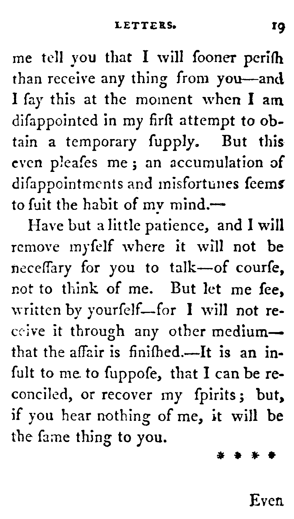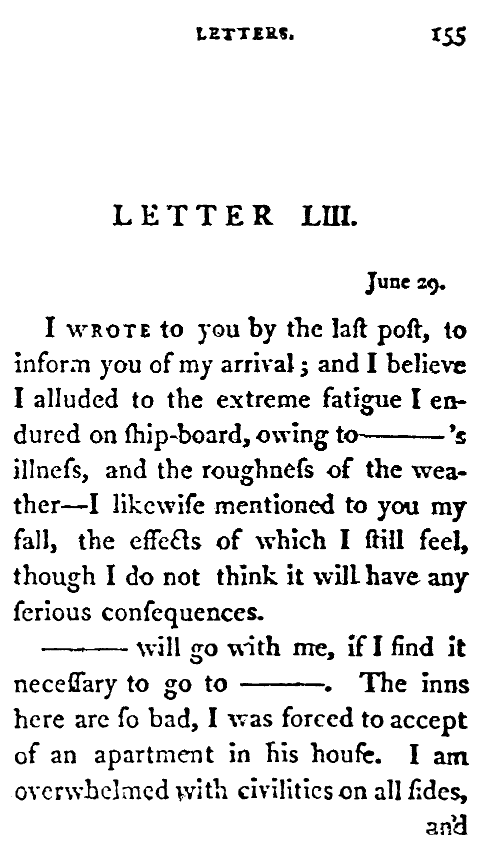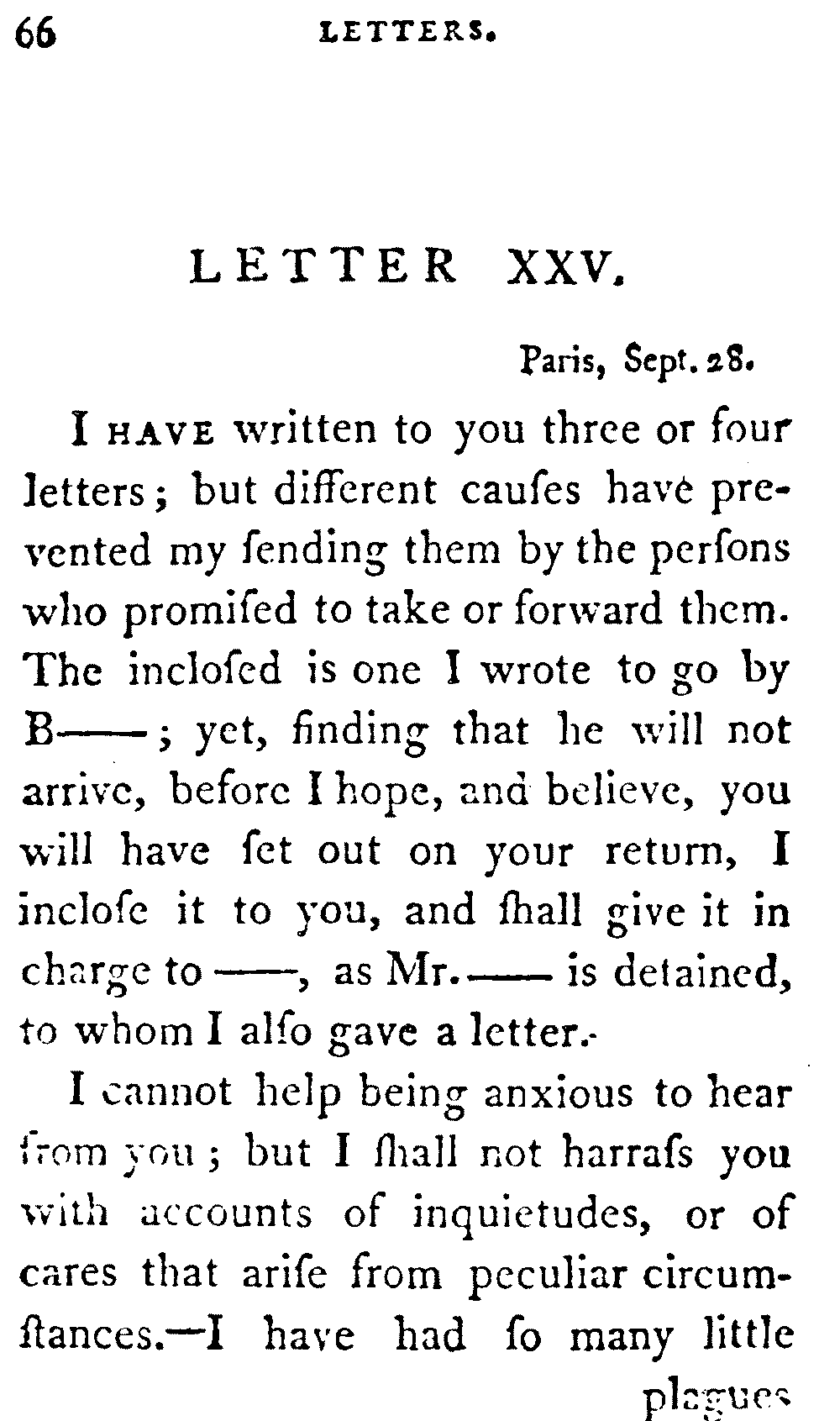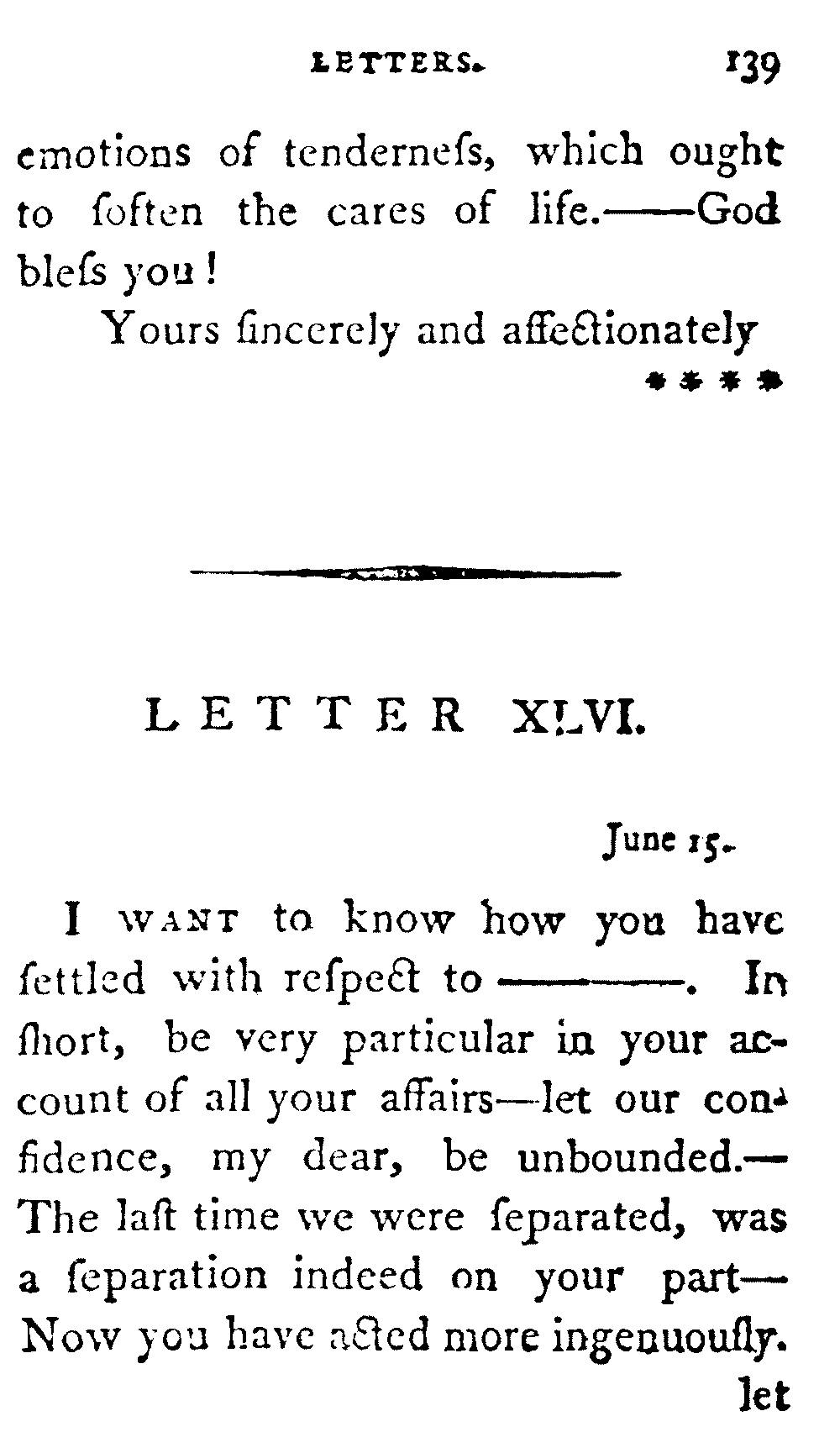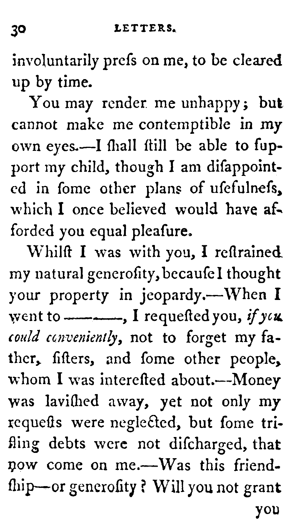 My mother, who had concealed the real ſtate of her affairs from me, was[144] now impelled to make me her confident, that I might aſſiſt to diſcharge her mighty debt of gratitude. The merchant, my more than father, had privately aſſiſted her: but a fatal civil-war reduced his large property to a bare competency; and an inflammation in his eyes, that aroſe from a cold he had caught at a wreck, which he watched during a ſtormy night to keep off the lawleſs colliers, almoſt deprived him of ſight. His life had been ſpent in ſociety, and he ſcarcely knew how to fill the void; for his ſpirit would not allow him to mix with his former equals as an humble companion; he who had been treated with uncommon reſpect, could not brook their inſulting pity. From the reſource of ſolitude, reading, the complaint in his eyes cut[145] him off, and he became our conſtant viſitor.