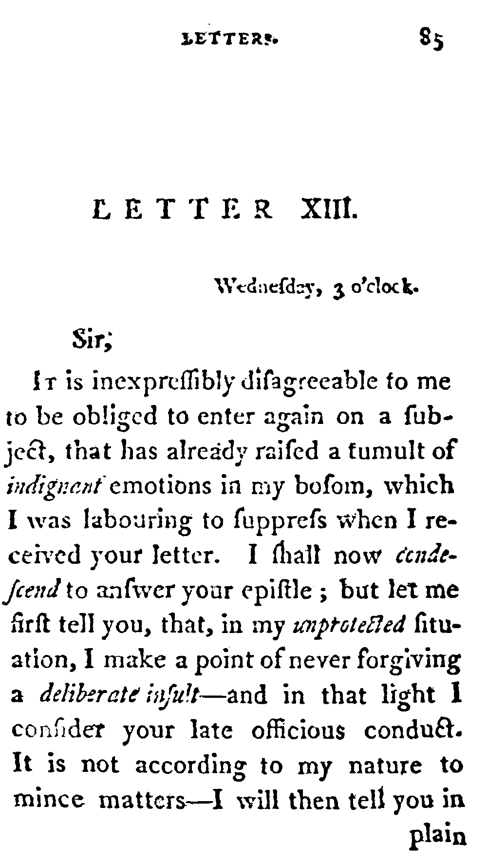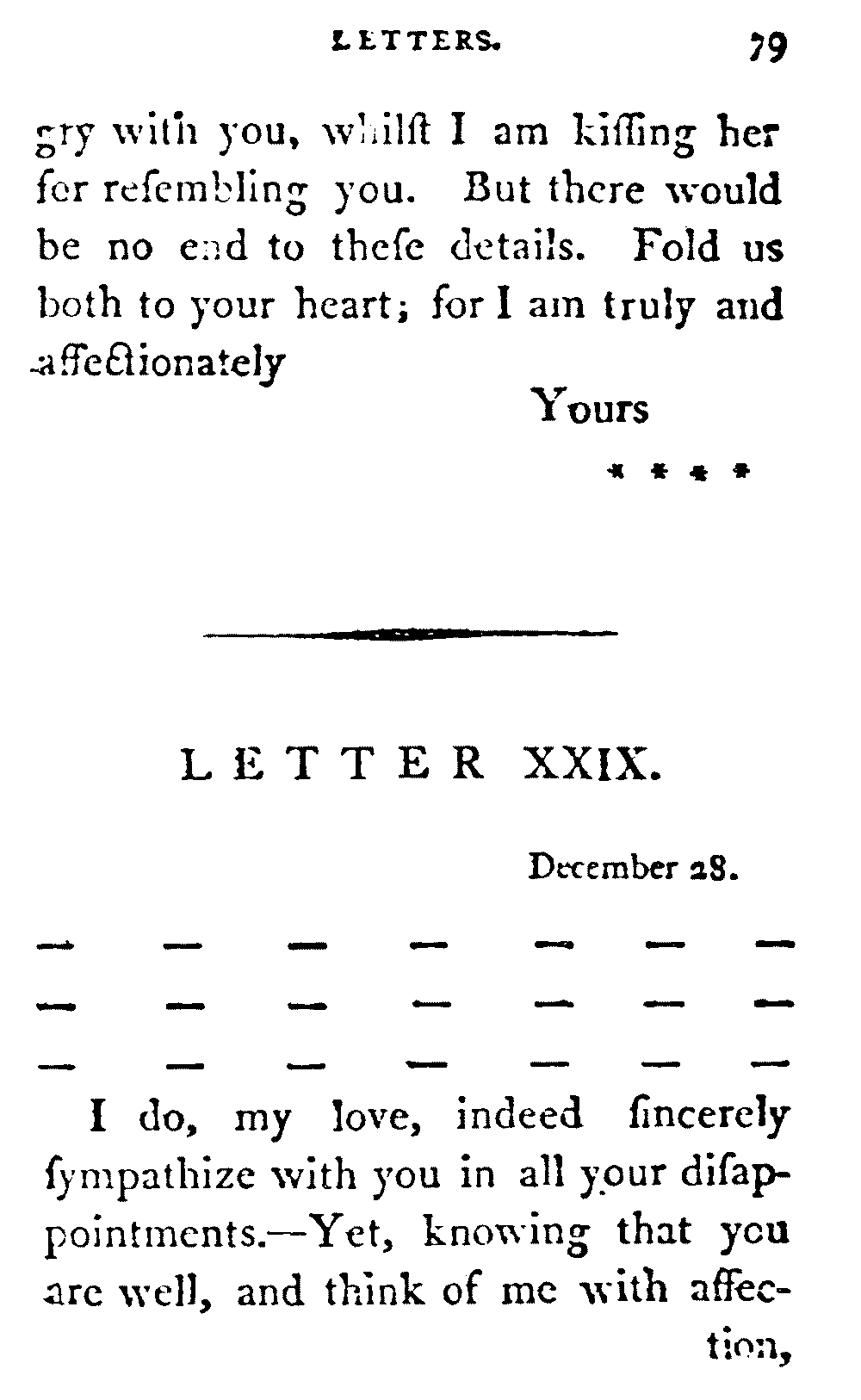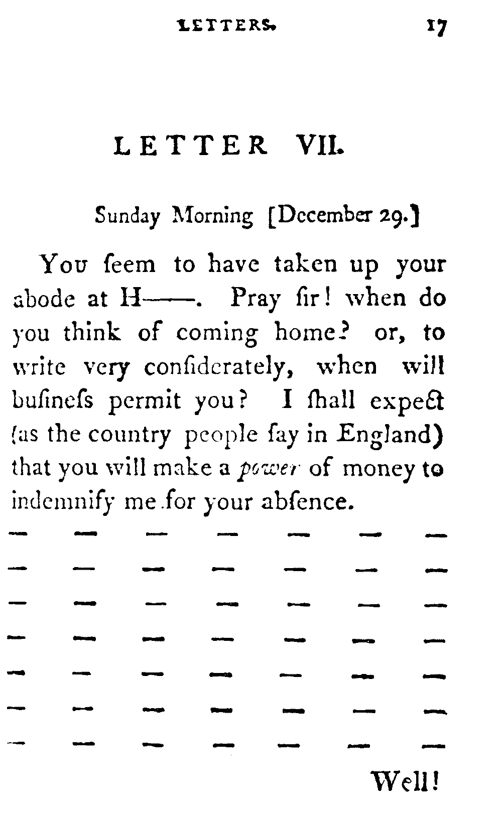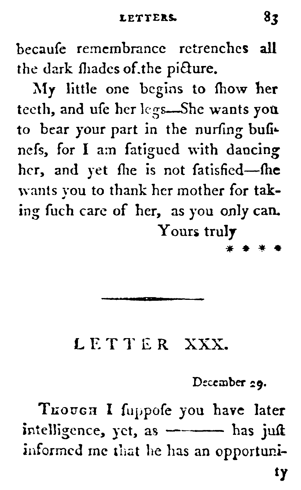 My mother, who had concealed the real ſtate of her affairs from me, was[144] now impelled to make me her confident, that I might aſſiſt to diſcharge her mighty debt of gratitude. The merchant, my more than father, had privately aſſiſted her: but a fatal civil-war reduced his large property to a bare competency; and an inflammation in his eyes, that aroſe from a cold he had caught at a wreck, which he watched during a ſtormy night to keep off the lawleſs colliers, almoſt deprived him of ſight. His life had been ſpent in ſociety, and he ſcarcely knew how to fill the void; for his ſpirit would not allow him to mix with his former equals as an humble companion; he who had been treated with uncommon reſpect, could not brook their inſulting pity. From the reſource of ſolitude, reading, the complaint in his eyes cut[145] him off, and he became our conſtant viſitor.
