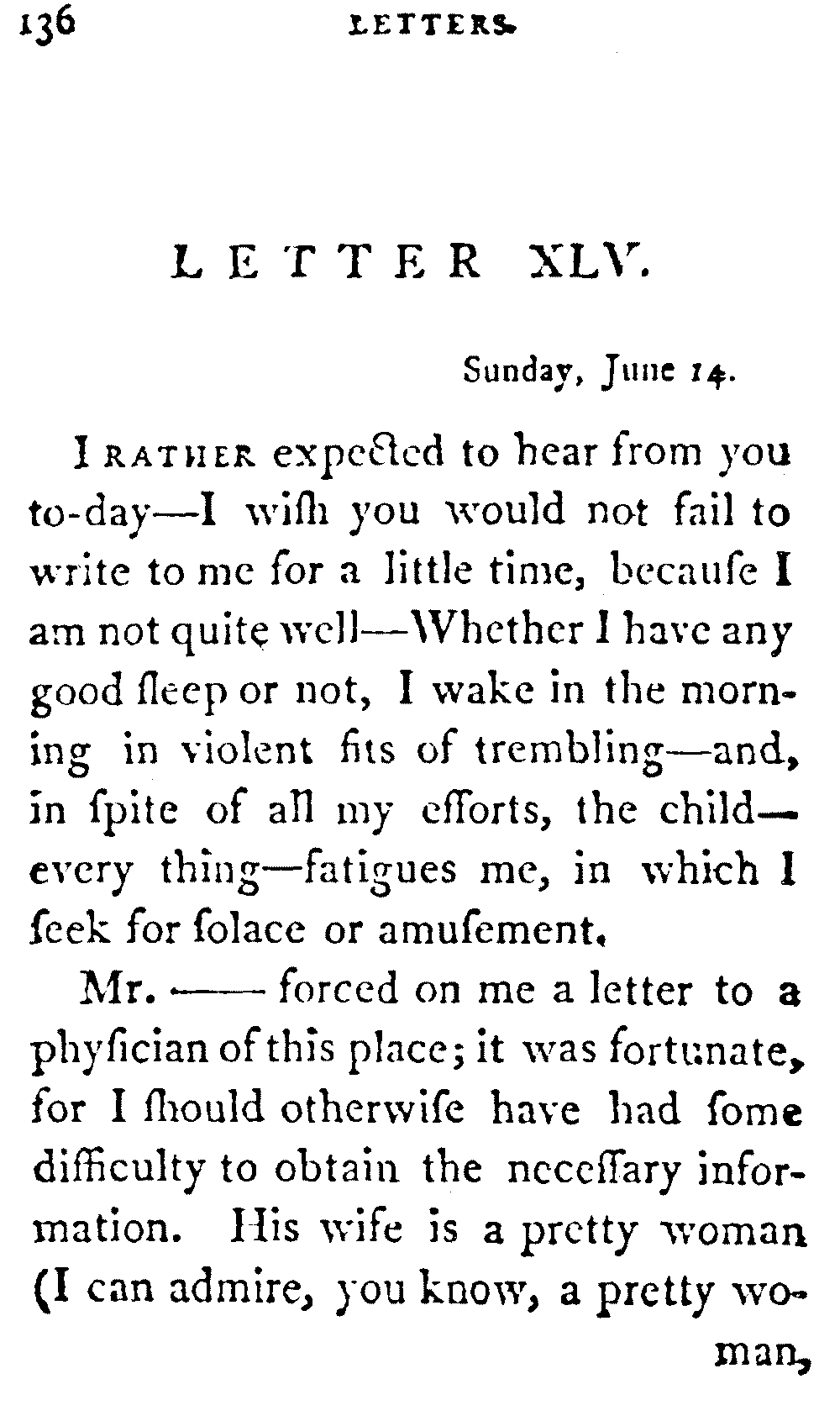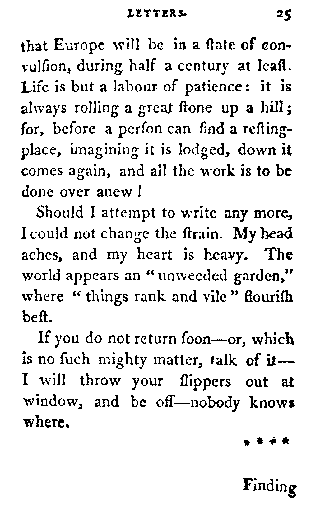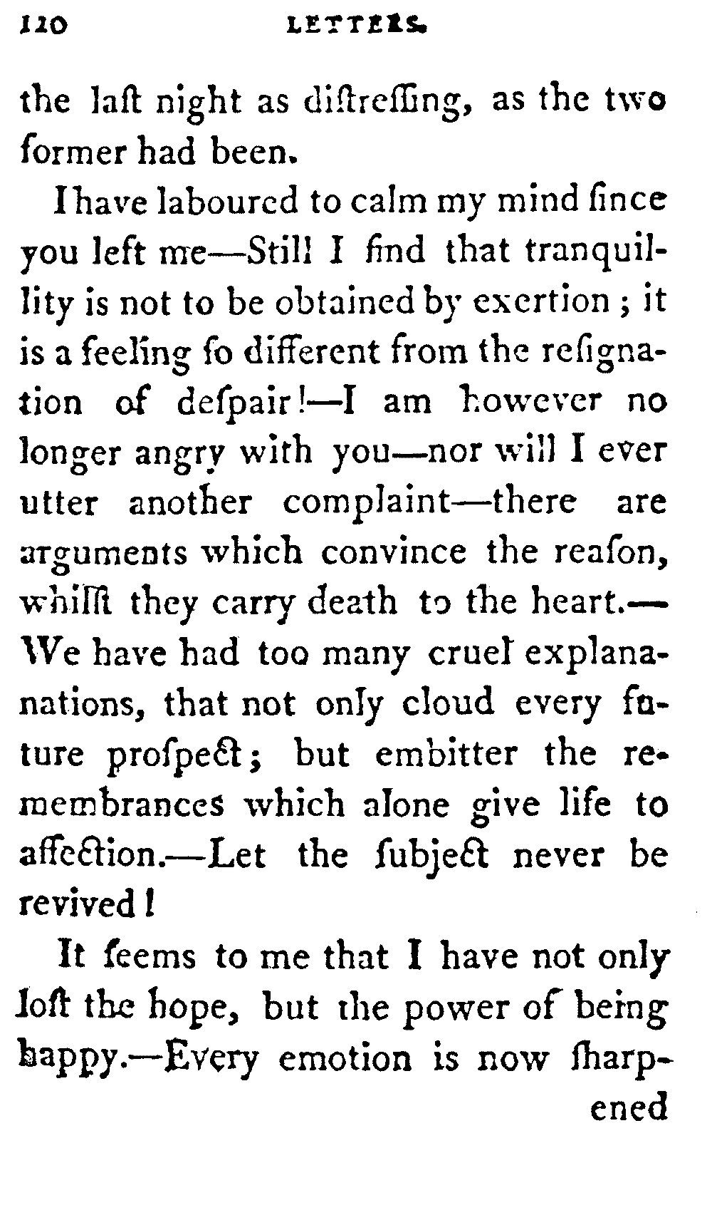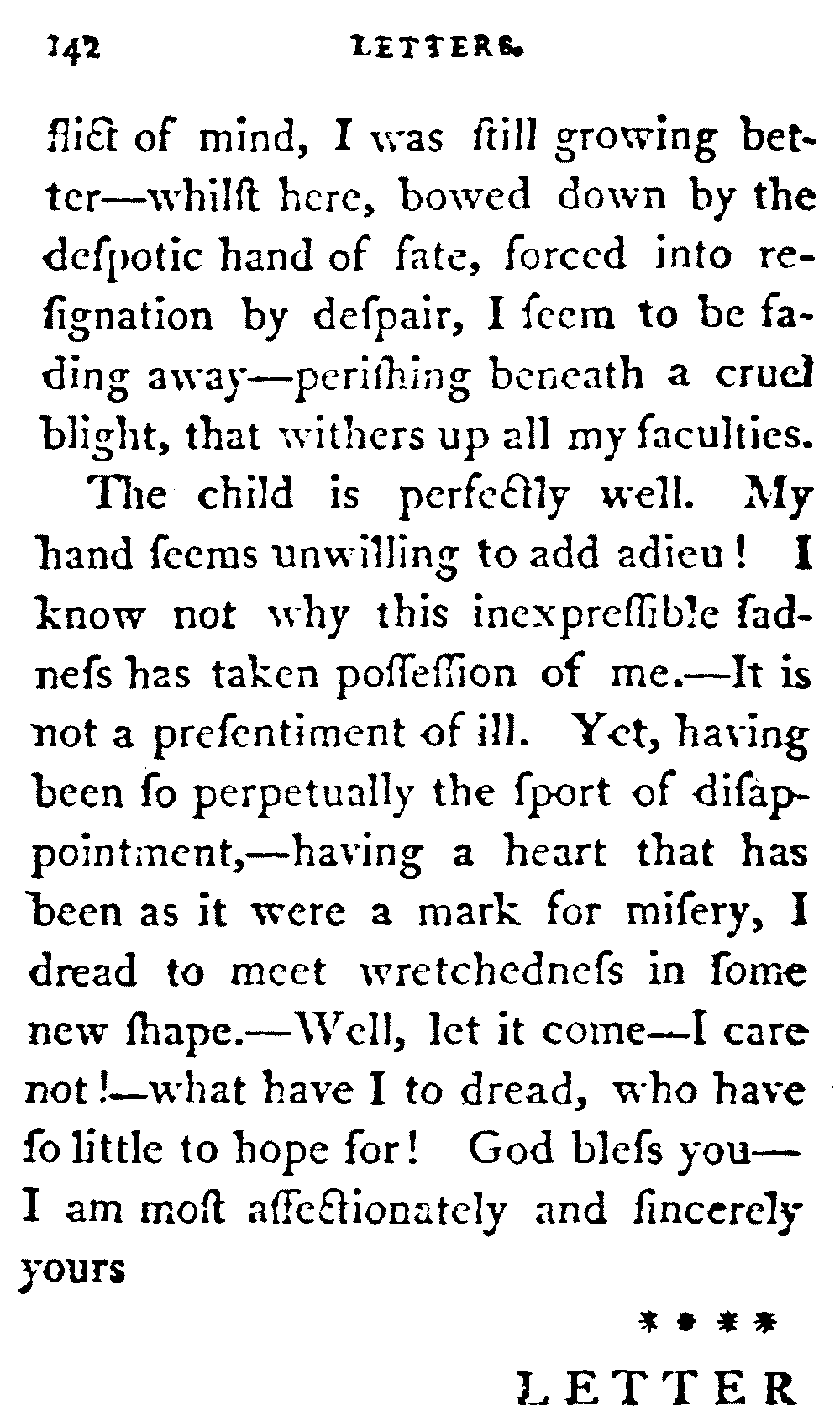 Earnestly as Maria endeavoured to soothe, by reading, the anguish of her wounded mind, her thoughts would often wander from the subject she was led to discuss, and tears of maternal tenderness obscured the reasoning page. She descanted on "the ills which flesh is heir to," with bitterness, when the recollection of her babe was revived by a tale of fictitious woe, that bore any resemblance to her own; and her imagination was continually employed, to conjure up and embody the various phantoms of misery, which folly and vice had let loose on the world. The loss of her babe was the tender string; against other cruel remembrances she laboured to[20] steel her bosom; and even a ray of hope, in the midst of her gloomy reveries, would sometimes gleam on the dark horizon of futurity, while persuading herself that she ought to cease to hope, since happiness was no where to be found.—But of her child, debilitated by the grief with which its mother had been assailed before it saw the light, she could not think without an impatient struggle.