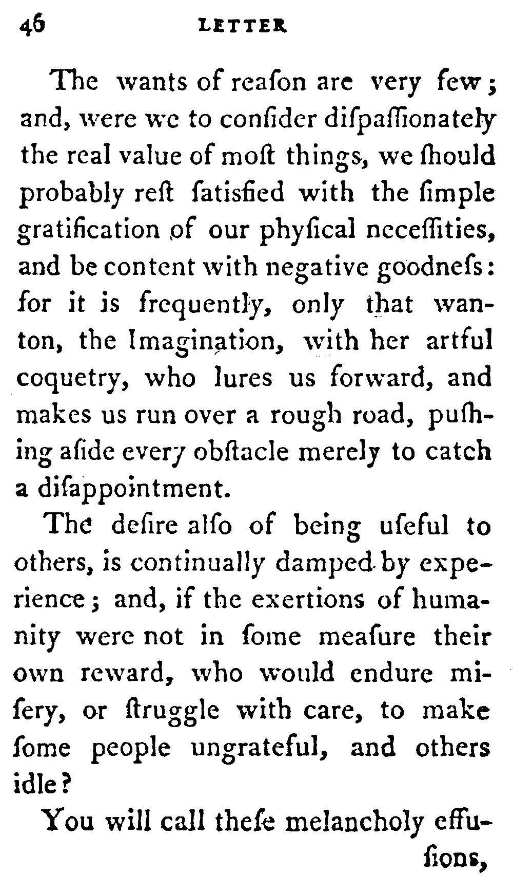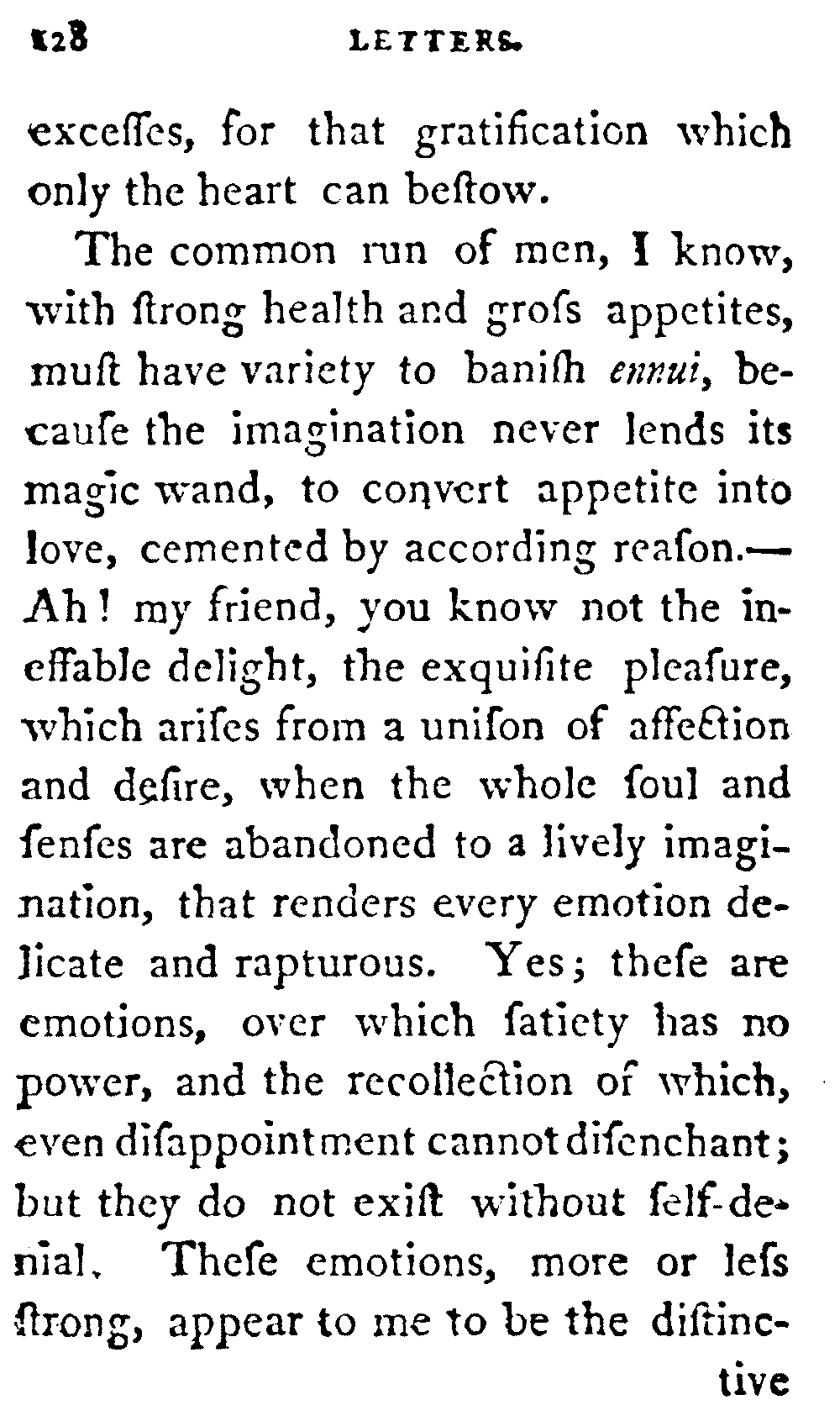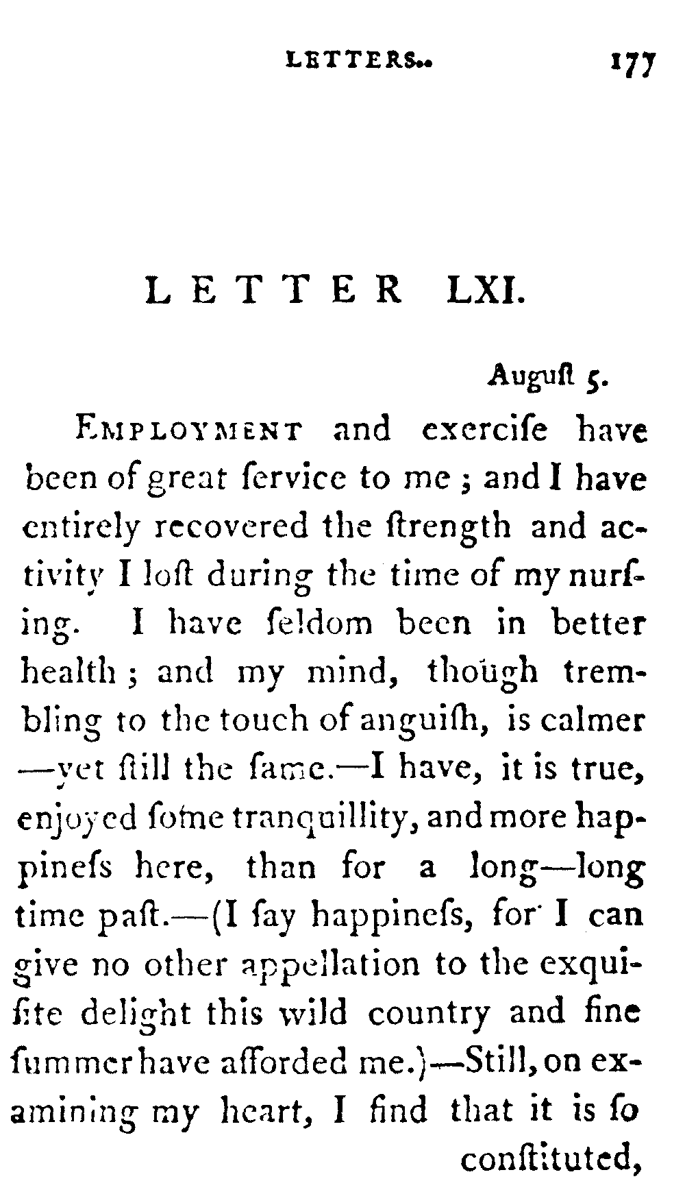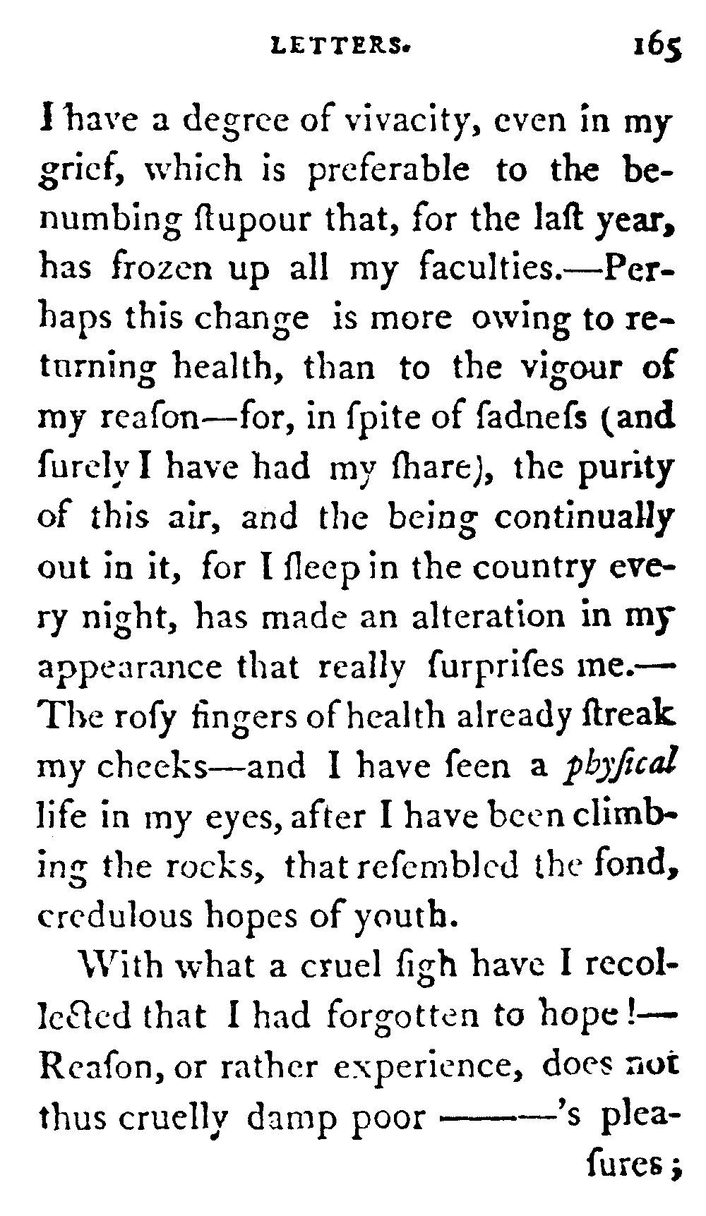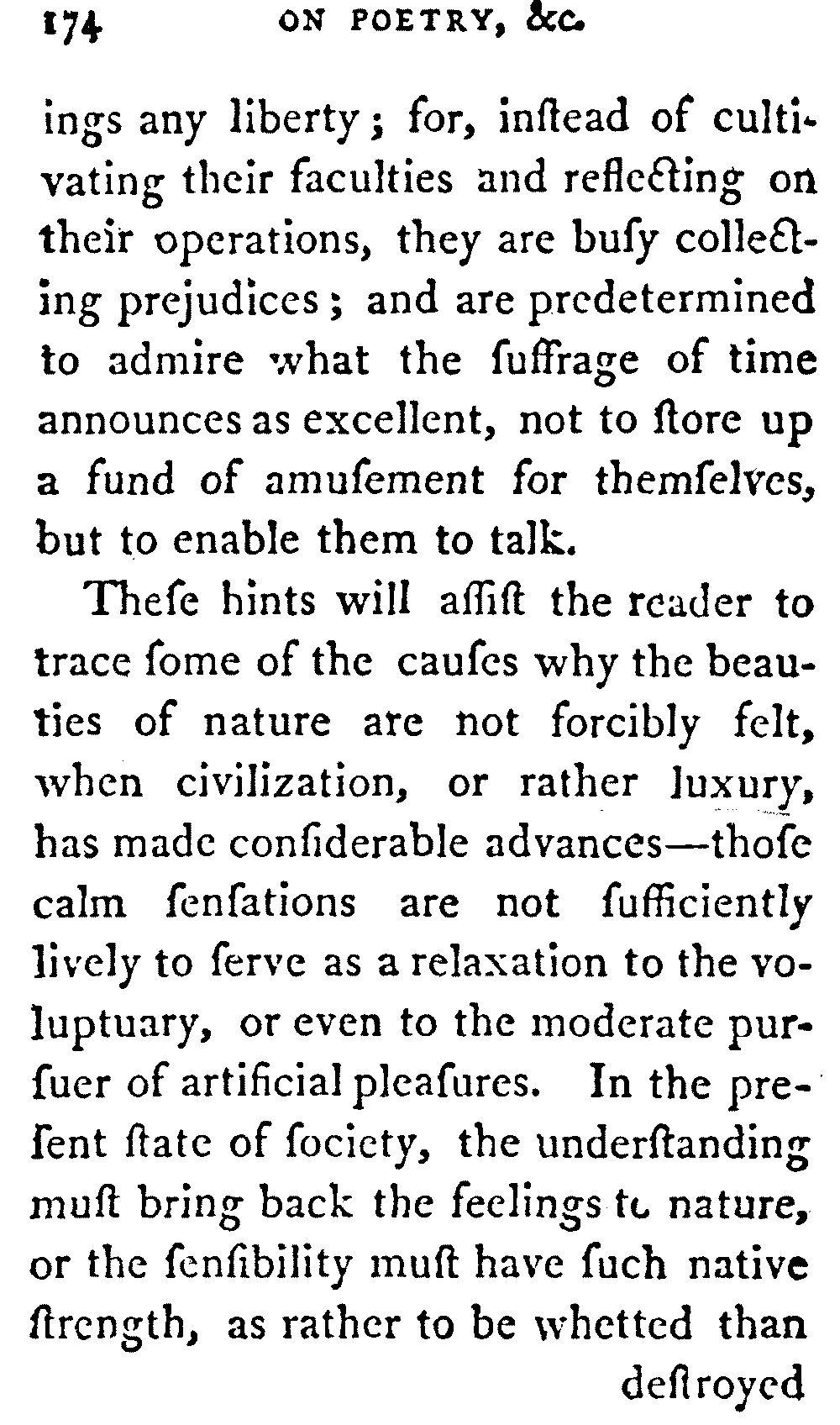 Theſe hints will aſſiſt the reader to trace ſome of the cauſes why the beauties of nature are not forcibly felt, when civilization, or rather luxury, has made conſiderable advances—thoſe calm ſenſations are not ſufficiently lively to ſerve as a relaxation to the voluptuary, or even to the moderate purſuer of artificial pleaſures. In the preſent ſtate of ſociety, the underſtanding muſt bring back the feelings to nature, or the ſenſibility muſt have ſuch native ſtrength, as rather to be whetted than[175] deſtroyed by the ſtrong exerciſes of paſſion.