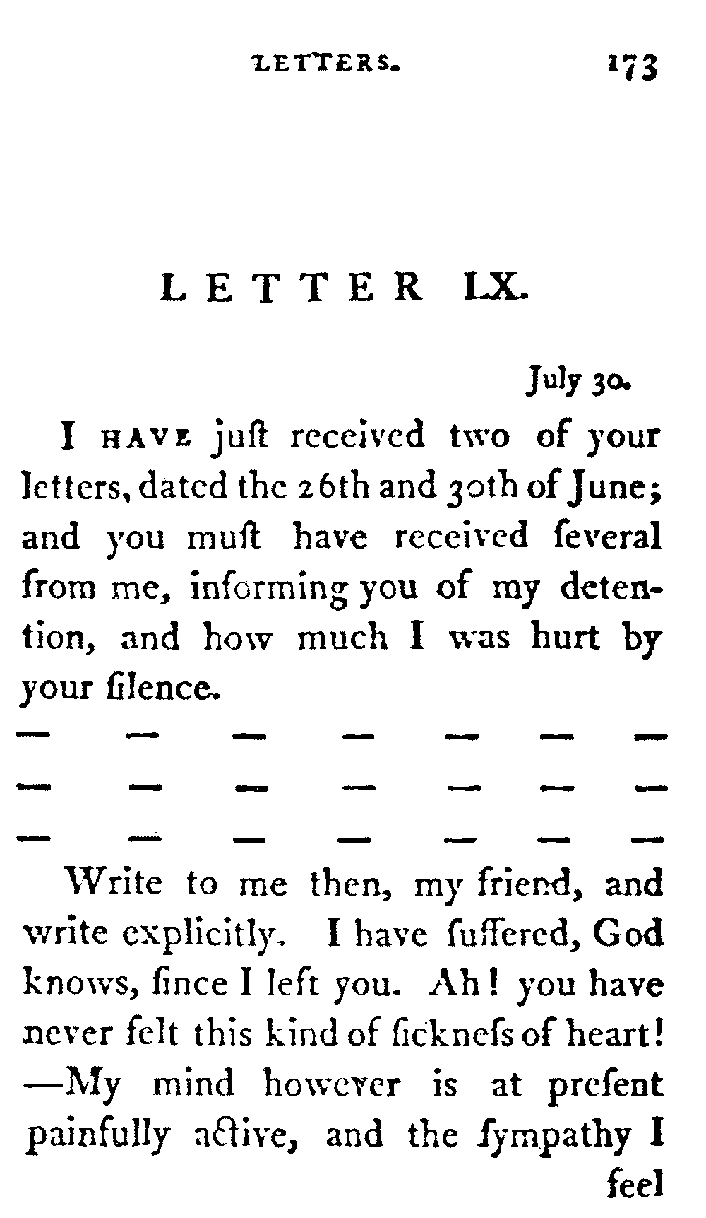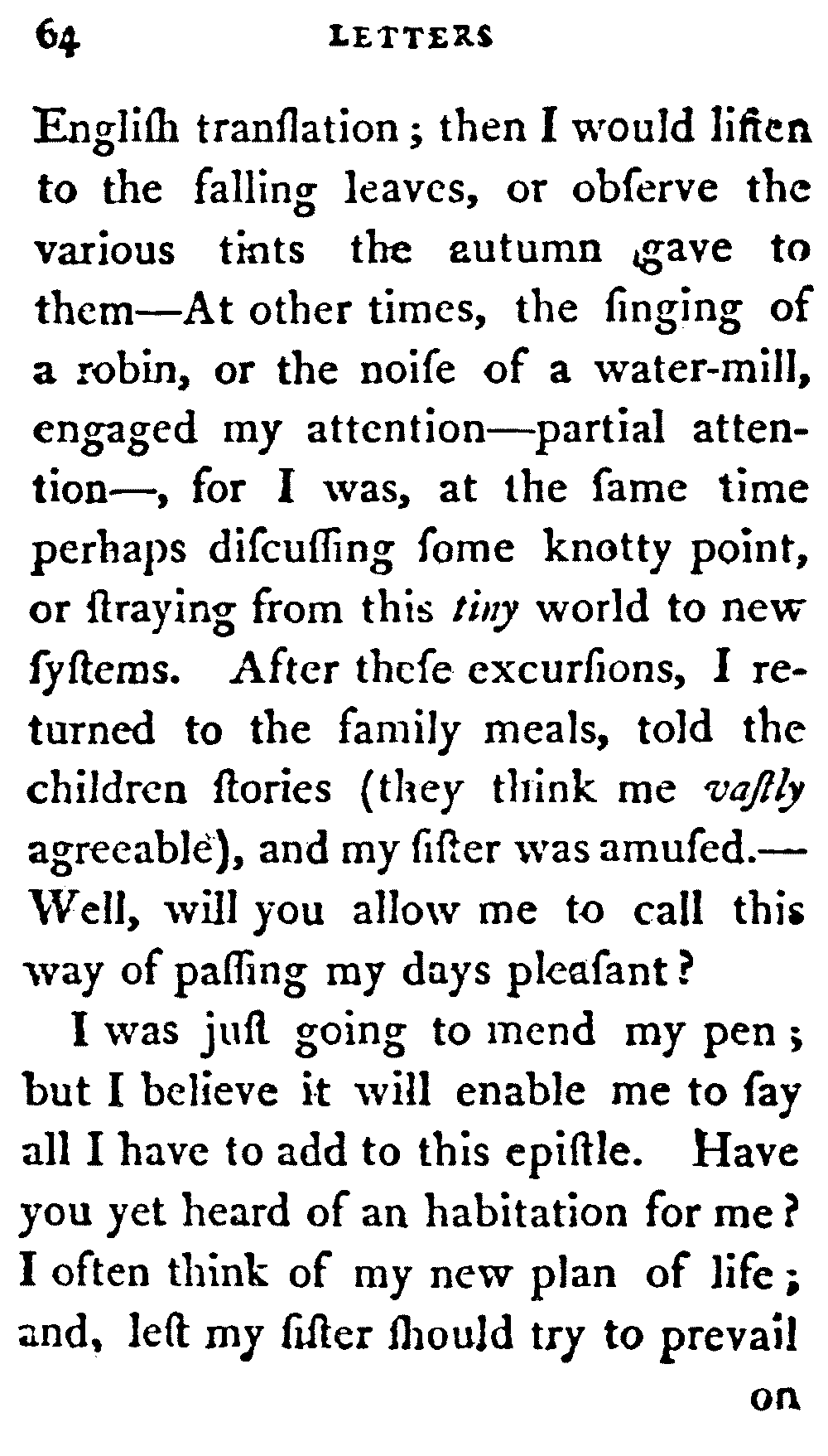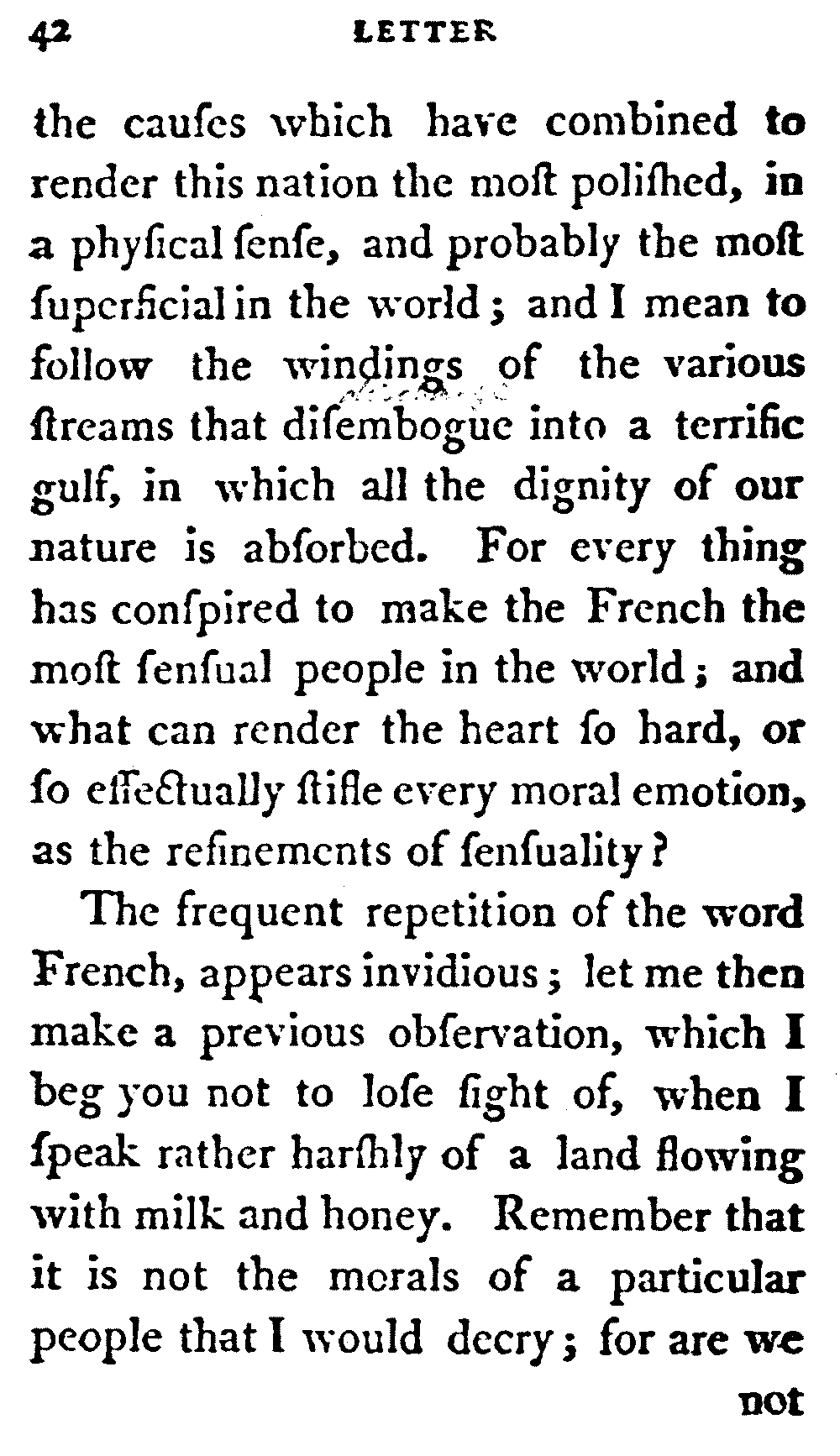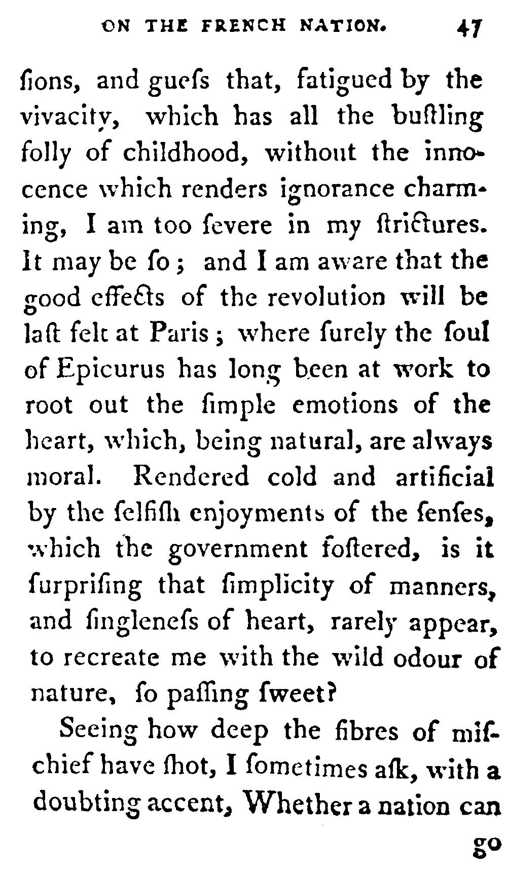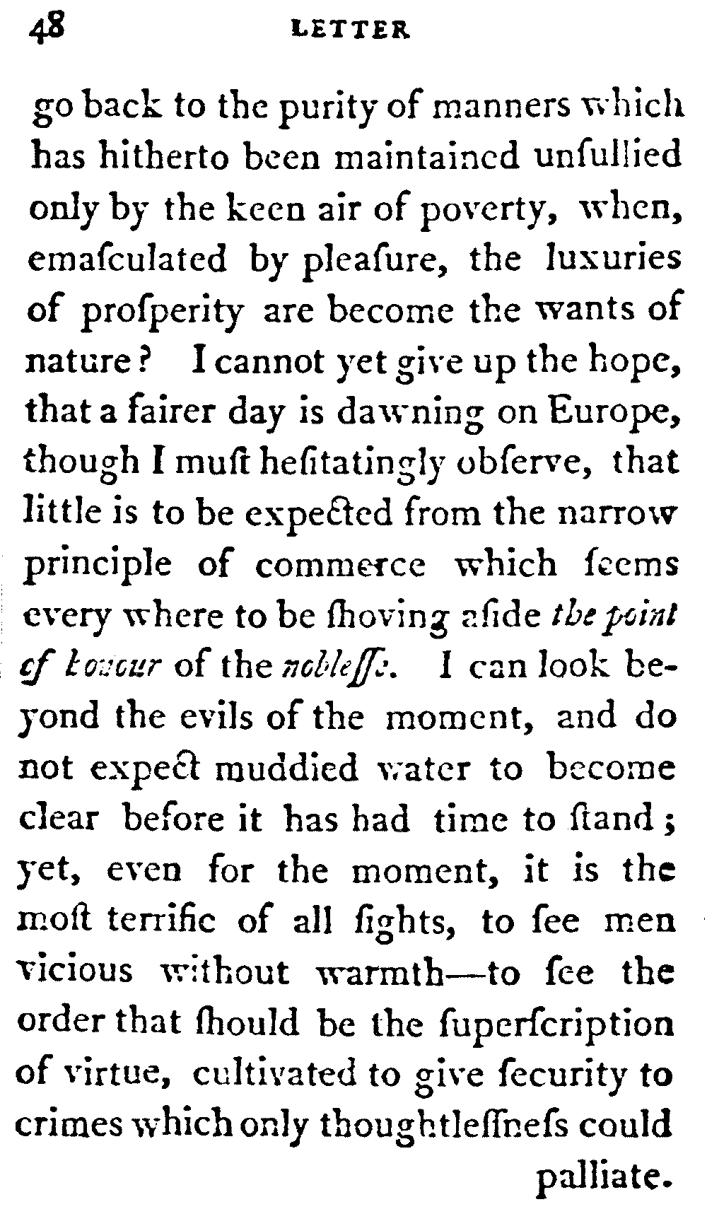 Theſe hints will aſſiſt the reader to trace ſome of the cauſes why the beauties of nature are not forcibly felt, when civilization, or rather luxury, has made conſiderable advances—thoſe calm ſenſations are not ſufficiently lively to ſerve as a relaxation to the voluptuary, or even to the moderate purſuer of artificial pleaſures. In the preſent ſtate of ſociety, the underſtanding muſt bring back the feelings to nature, or the ſenſibility muſt have ſuch native ſtrength, as rather to be whetted than[175] deſtroyed by the ſtrong exerciſes of paſſion.