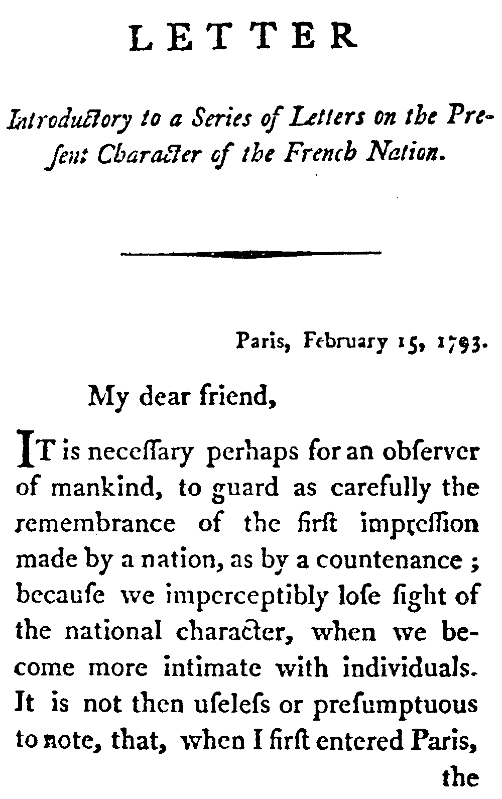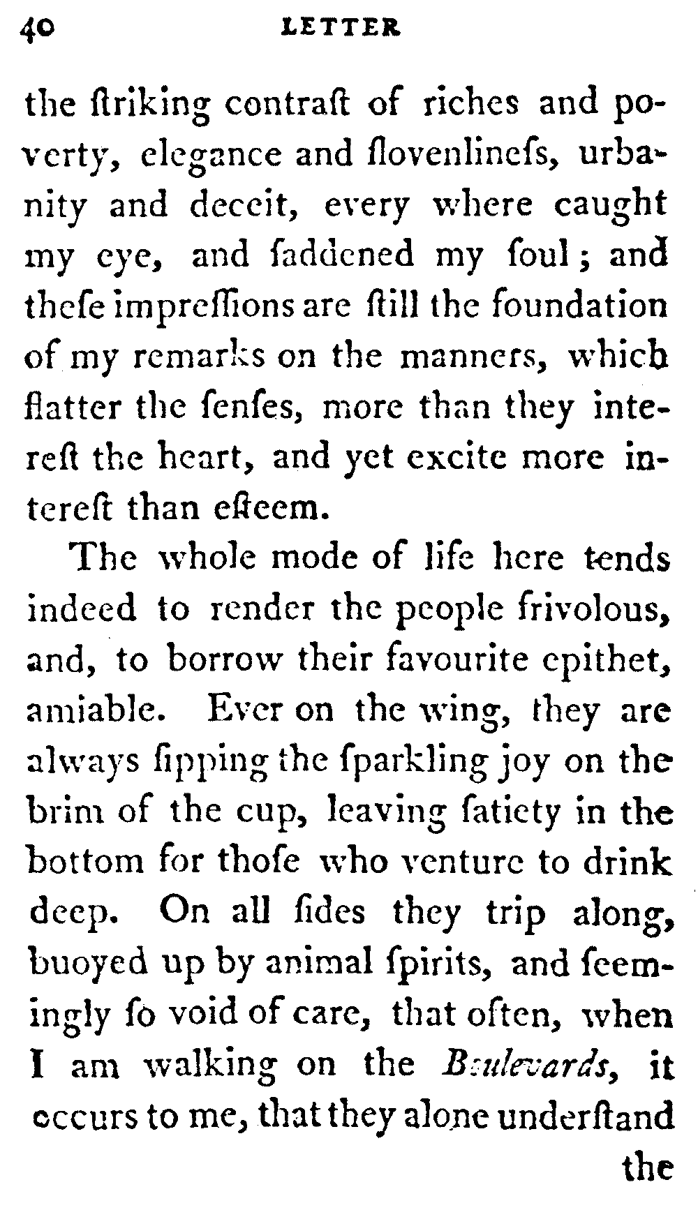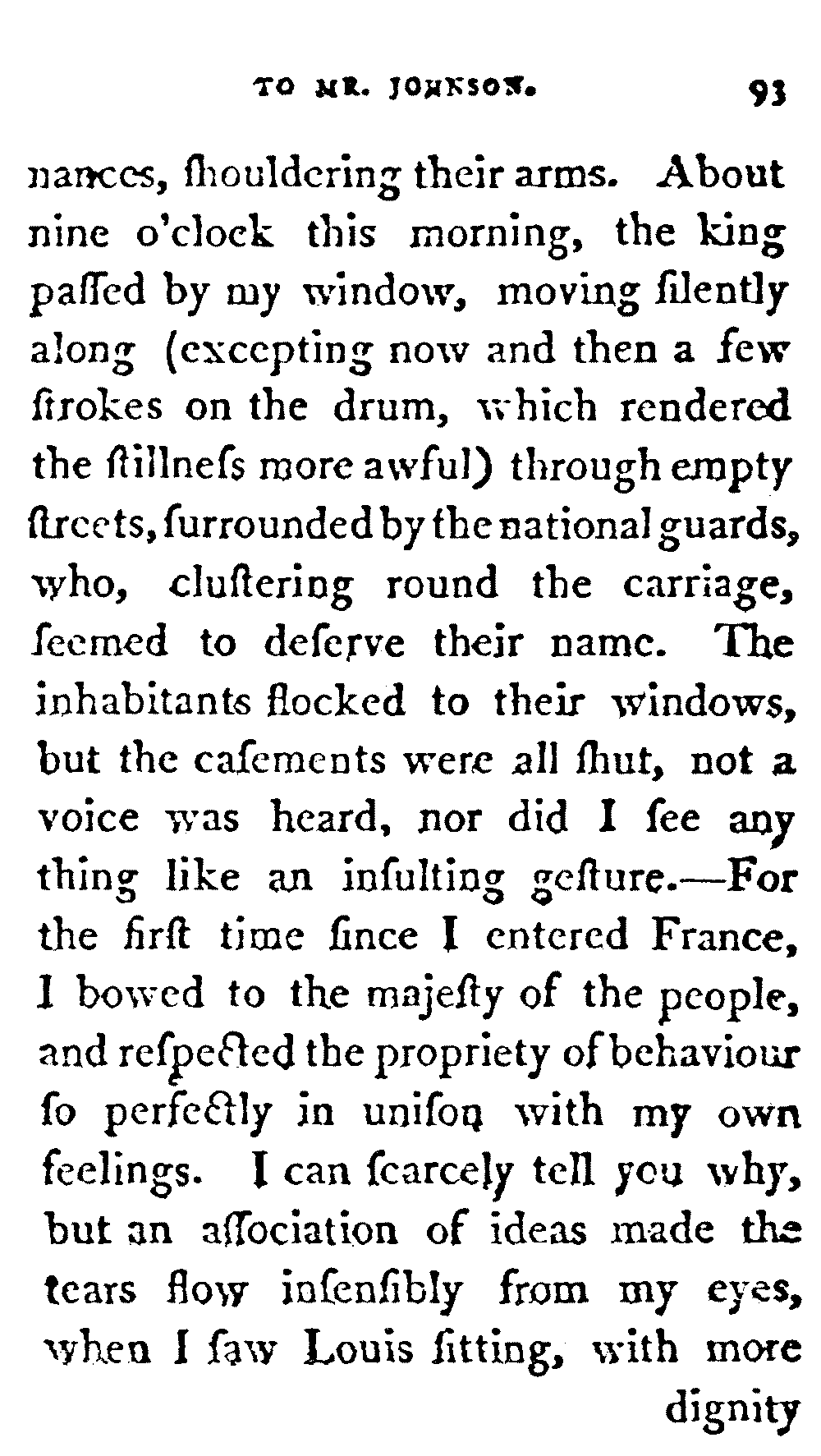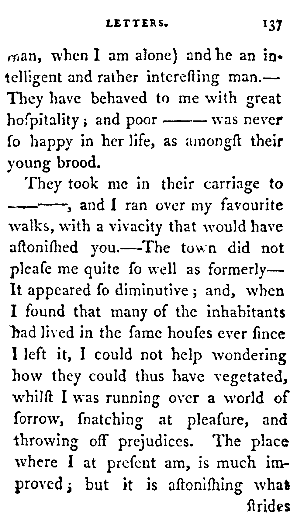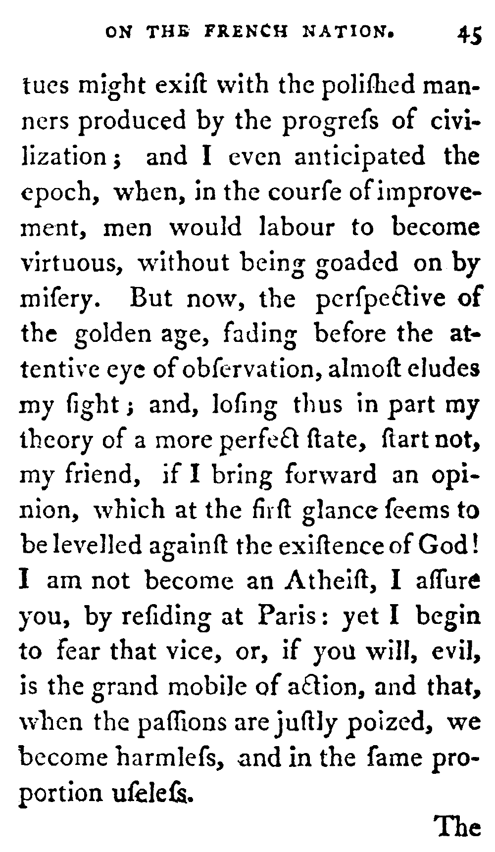 Theſe hints will aſſiſt the reader to trace ſome of the cauſes why the beauties of nature are not forcibly felt, when civilization, or rather luxury, has made conſiderable advances—thoſe calm ſenſations are not ſufficiently lively to ſerve as a relaxation to the voluptuary, or even to the moderate purſuer of artificial pleaſures. In the preſent ſtate of ſociety, the underſtanding muſt bring back the feelings to nature, or the ſenſibility muſt have ſuch native ſtrength, as rather to be whetted than[175] deſtroyed by the ſtrong exerciſes of paſſion.