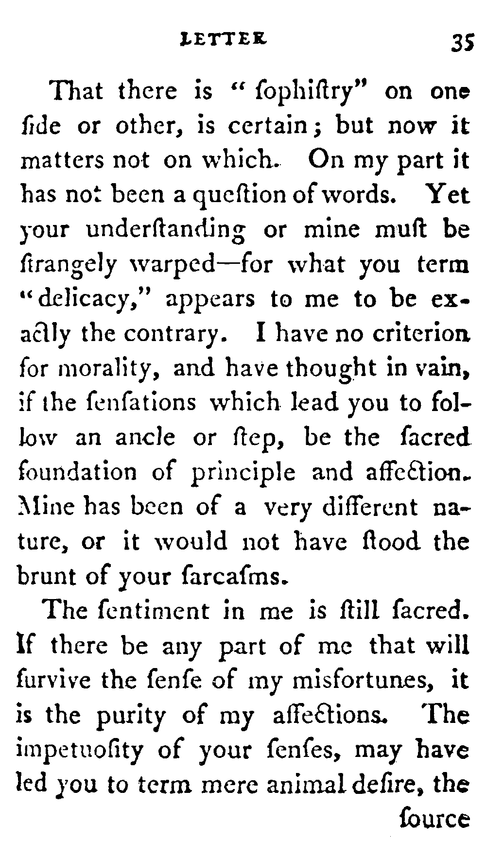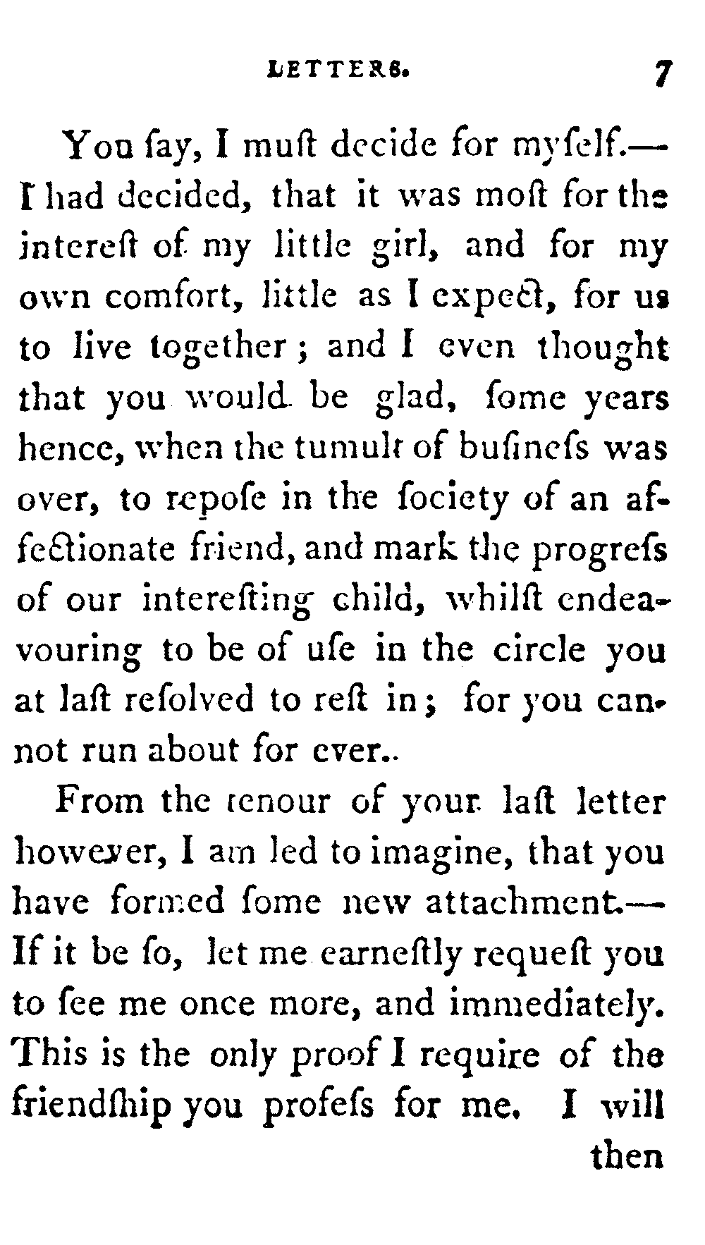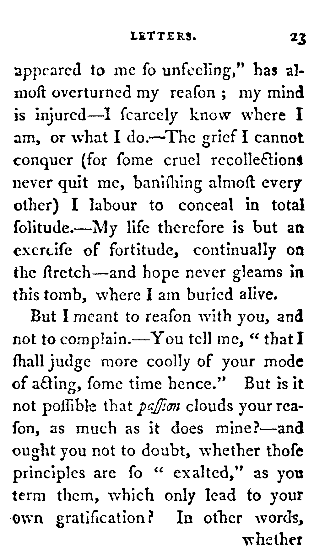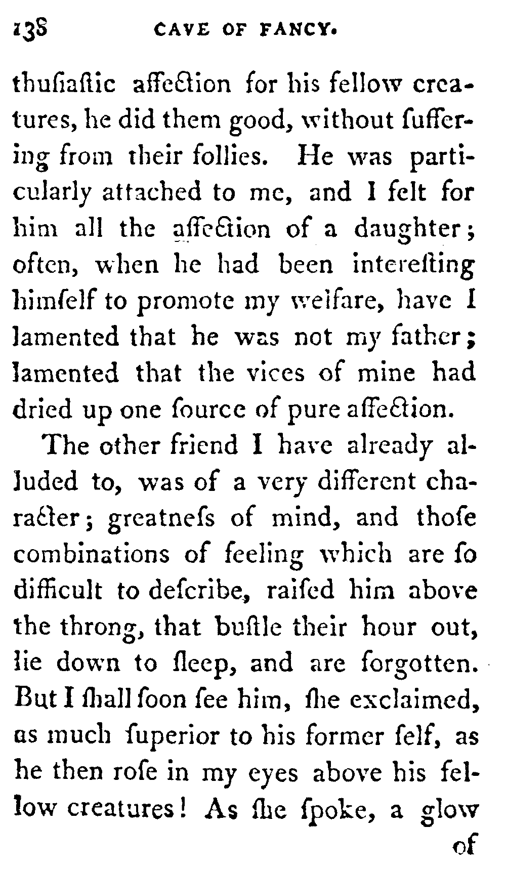 She proceeded. The man I am deſcribing was humanity itſelf; but frequently he did not underſtand me; many of my feelings were not to be analyzed by his common ſenſe. His friendſhips, for he had many friends, gave him pleaſure unmixed with pain; his religion was coldly reaſonable, becauſe he want[137]ed fancy, and he did not feel the neceſſity of finding, or creating, a perfect object, to anſwer the one engraved on his heart: the ſketch there was faint. He went with the ſtream, and rather caught a character from the ſociety he lived in, than ſpread one around him. In my mind many opinions were graven with a pen of braſs, which he thought chimerical: but time could not eraſe them, and I now recognize them as the ſeeds of eternal happineſs: they will ſoon expand in thoſe realms where I ſhall enjoy the bliſs adapted to my nature; this is all we need aſk of the Supreme Being; happineſs muſt follow the completion of his deſigns. He however could live quietly, without giving a preponderancy to many important opinions that continually obtruded on my mind; not having an en[138]thuſiaſtic affection for his fellow creatures, he did them good, without ſuffering from their follies. He was particularly attached to me, and I felt for him all the affection of a daughter; often, when he had been intereſting himſelf to promote my welfare, have I lamented that he was not my father; lamented that the vices of mine had dried up one ſource of pure affection.
