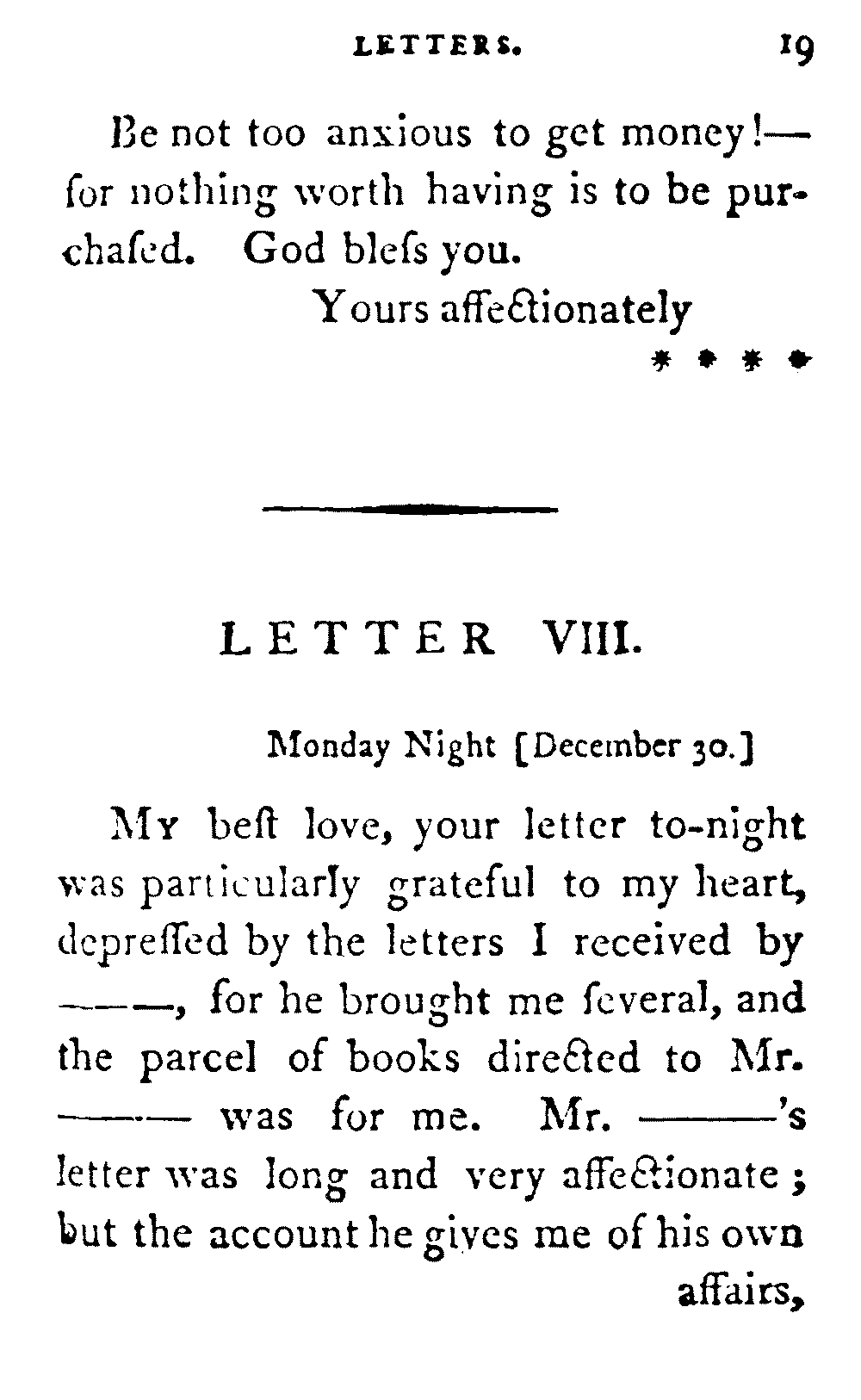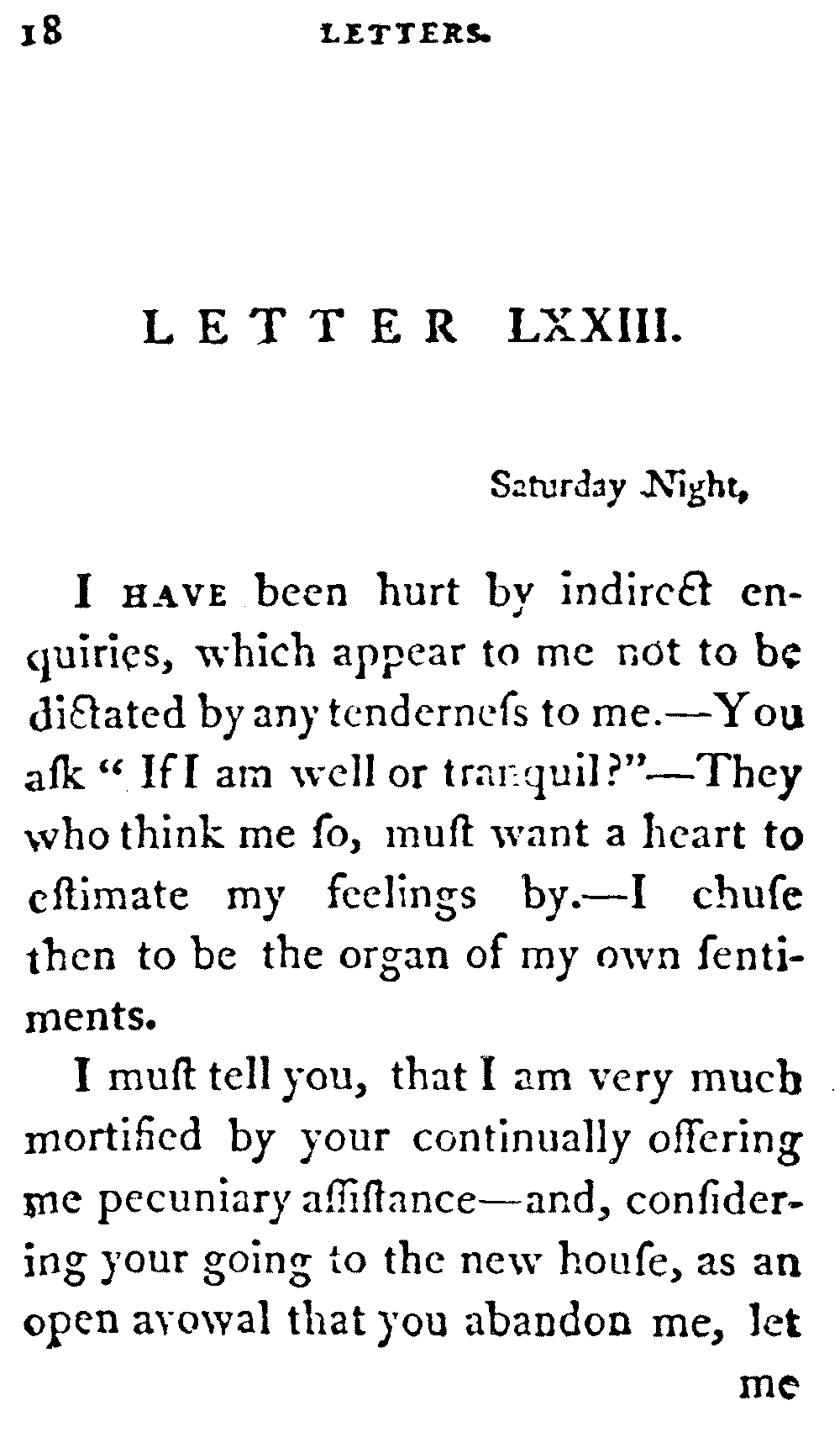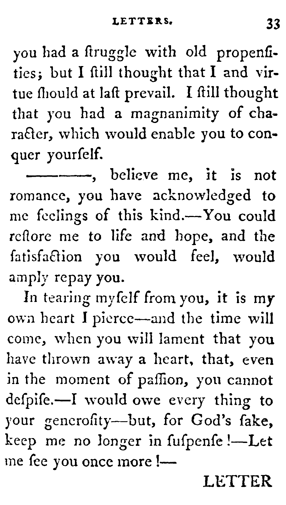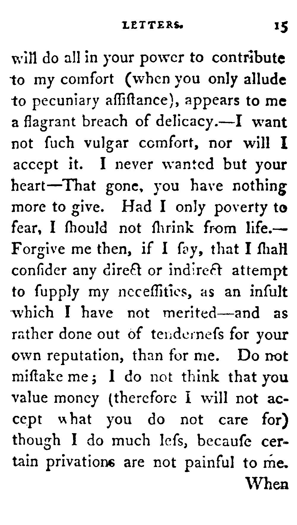 She proceeded. The man I am deſcribing was humanity itſelf; but frequently he did not underſtand me; many of my feelings were not to be analyzed by his common ſenſe. His friendſhips, for he had many friends, gave him pleaſure unmixed with pain; his religion was coldly reaſonable, becauſe he want[137]ed fancy, and he did not feel the neceſſity of finding, or creating, a perfect object, to anſwer the one engraved on his heart: the ſketch there was faint. He went with the ſtream, and rather caught a character from the ſociety he lived in, than ſpread one around him. In my mind many opinions were graven with a pen of braſs, which he thought chimerical: but time could not eraſe them, and I now recognize them as the ſeeds of eternal happineſs: they will ſoon expand in thoſe realms where I ſhall enjoy the bliſs adapted to my nature; this is all we need aſk of the Supreme Being; happineſs muſt follow the completion of his deſigns. He however could live quietly, without giving a preponderancy to many important opinions that continually obtruded on my mind; not having an en[138]thuſiaſtic affection for his fellow creatures, he did them good, without ſuffering from their follies. He was particularly attached to me, and I felt for him all the affection of a daughter; often, when he had been intereſting himſelf to promote my welfare, have I lamented that he was not my father; lamented that the vices of mine had dried up one ſource of pure affection.