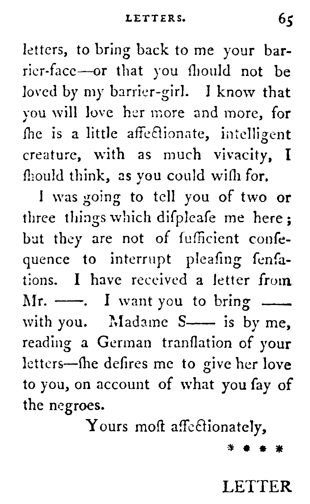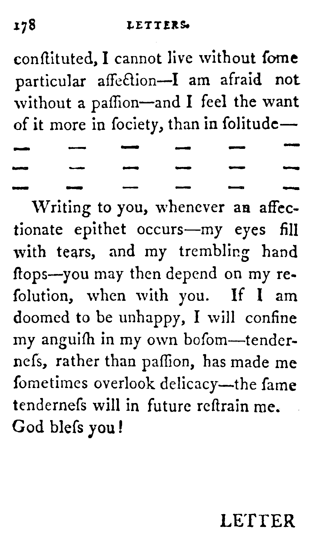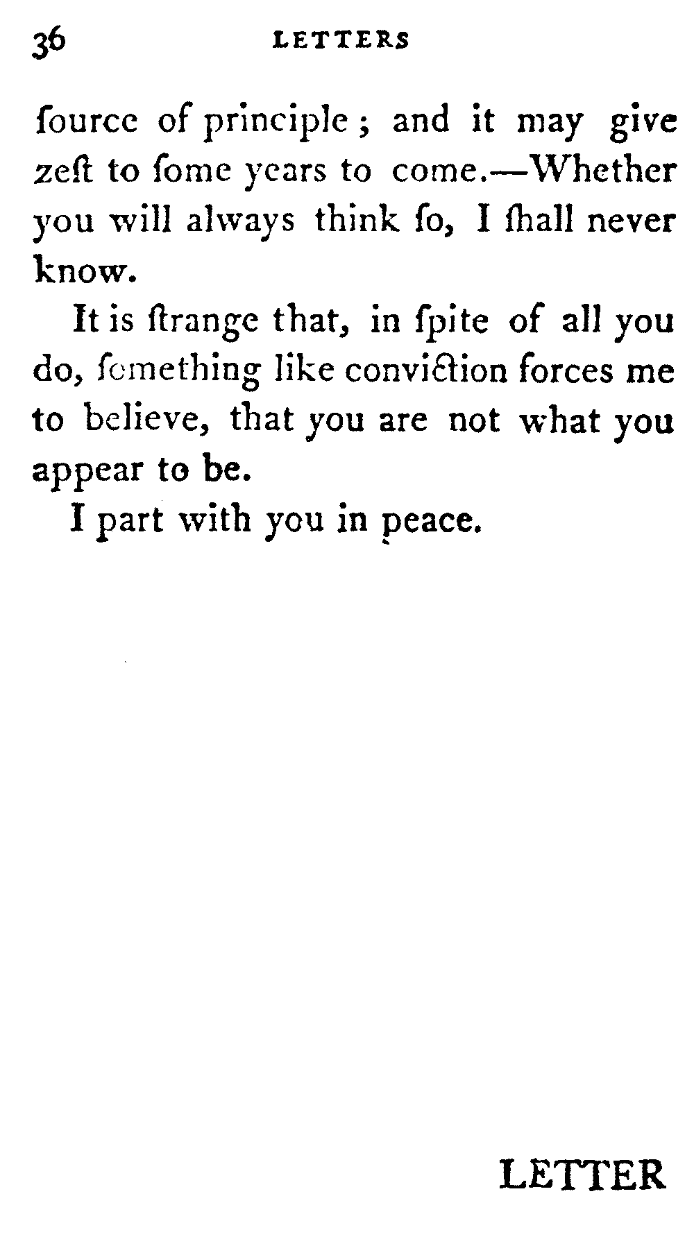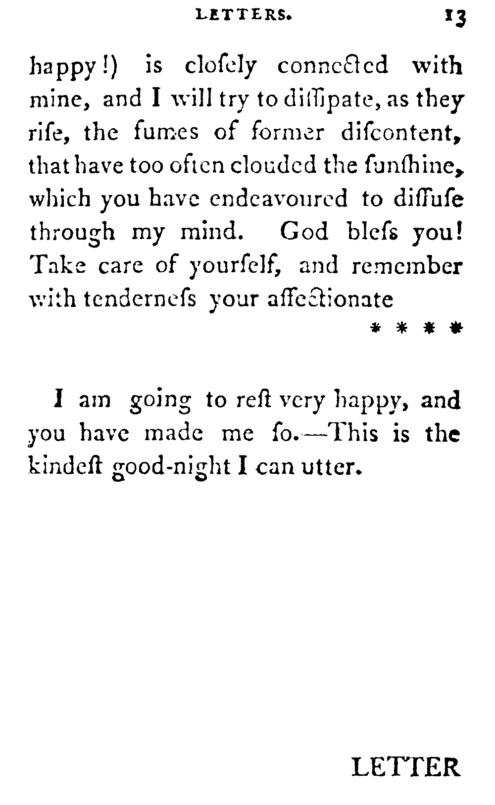 She proceeded. The man I am deſcribing was humanity itſelf; but frequently he did not underſtand me; many of my feelings were not to be analyzed by his common ſenſe. His friendſhips, for he had many friends, gave him pleaſure unmixed with pain; his religion was coldly reaſonable, becauſe he want[137]ed fancy, and he did not feel the neceſſity of finding, or creating, a perfect object, to anſwer the one engraved on his heart: the ſketch there was faint. He went with the ſtream, and rather caught a character from the ſociety he lived in, than ſpread one around him. In my mind many opinions were graven with a pen of braſs, which he thought chimerical: but time could not eraſe them, and I now recognize them as the ſeeds of eternal happineſs: they will ſoon expand in thoſe realms where I ſhall enjoy the bliſs adapted to my nature; this is all we need aſk of the Supreme Being; happineſs muſt follow the completion of his deſigns. He however could live quietly, without giving a preponderancy to many important opinions that continually obtruded on my mind; not having an en[138]thuſiaſtic affection for his fellow creatures, he did them good, without ſuffering from their follies. He was particularly attached to me, and I felt for him all the affection of a daughter; often, when he had been intereſting himſelf to promote my welfare, have I lamented that he was not my father; lamented that the vices of mine had dried up one ſource of pure affection.