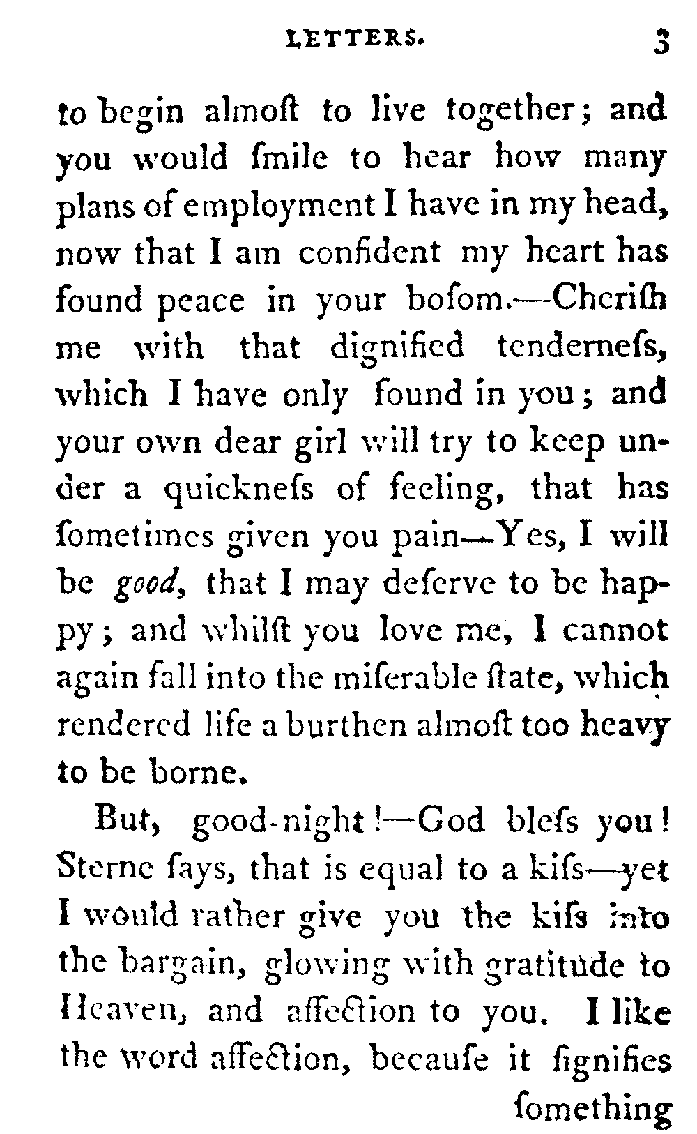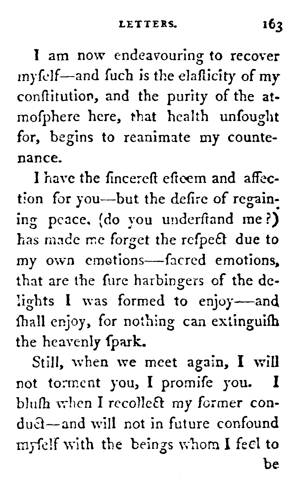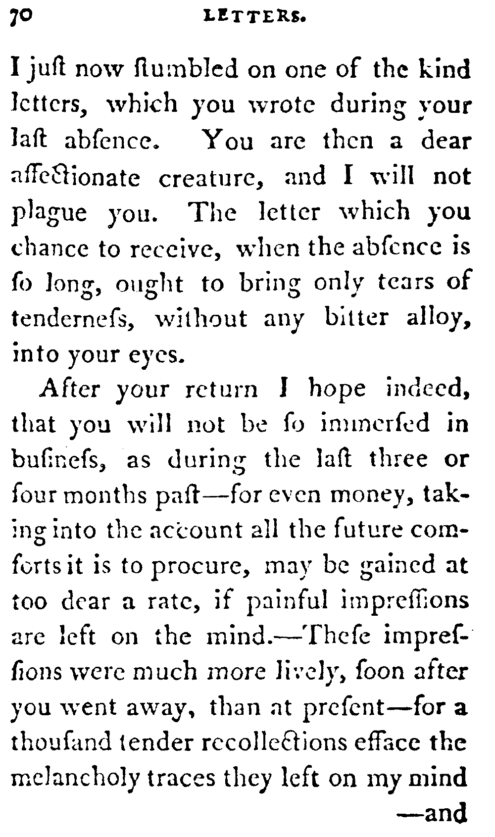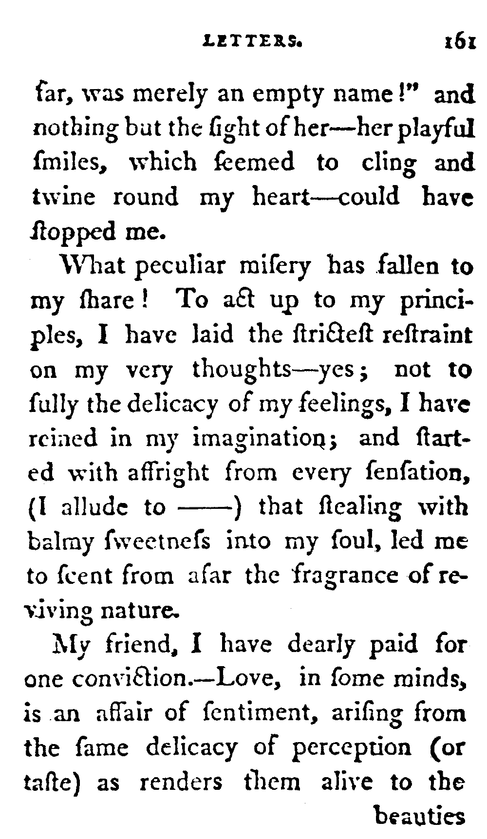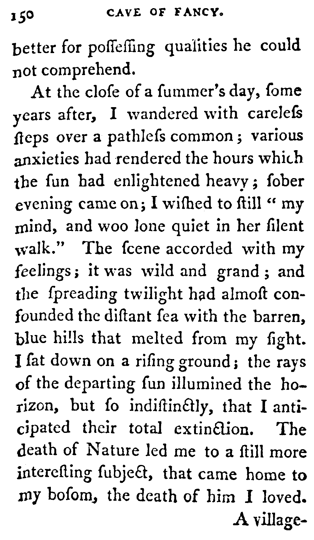At the cloſe of a ſummer's day, ſome years after, I wandered with careleſs ſteps over a pathleſs common; various anxieties had rendered the hours which the ſun had enlightened heavy; ſober evening came on; I wiſhed to ſtill "my mind, and woo lone quiet in her ſilent walk." The ſcene accorded with my feelings; it was wild and grand; and the ſpreading twilight had almoſt confounded the diſtant ſea with the barren, blue hills that melted from my ſight. I ſat down on a riſing ground; the rays of the departing ſun illumined the horizon, but ſo indiſtinctly, that I anticipated their total extinction. The death of Nature led me to a ſtill more intereſting ſubject, that came home to my boſom, the death of him I loved.[151] A village-bell was tolling; I liſtened, and thought of the moment when I heard his interrupted breath, and felt the agonizing fear, that the ſame ſound would never more reach my ears, and that the intelligence glanced from my eyes, would no more be felt. The ſpoiler had ſeized his prey; the ſun was fled, what was this world to me! I wandered to another, where death and darkneſs could not enter; I purſued the ſun beyond the mountains, and the ſoul eſcaped from this vale of tears. My reflections were tinged with melancholy, but they were ſublime.—I graſped a mighty whole, and ſmiled on the king of terrors; the tie which bound me to my friends he could not break; the ſame myſterious knot united me to the ſource of all goodneſs and happineſs. I had ſeen the divinity re[152]flected in a face I loved; I had read immortal characters diſplayed on a human countenance, and forgot myſelf whilſt I gazed. I could not think of immortality, without recollecting the ecſtacy I felt, when my heart firſt whiſpered to me that I was beloved; and again did I feel the ſacred tie of mutual affection; fervently I prayed to the father of mercies; and rejoiced that he could ſee every turn of a heart, whoſe movements I could not perfectly underſtand. My paſſion ſeemed a pledge of immortality; I did not wiſh to hide it from the all-ſearching eye of heaven. Where indeed could I go from his preſence? and, whilſt it was dear to me, though darkneſs might reign during the night of life, joy would come when I awoke to life everlaſting.