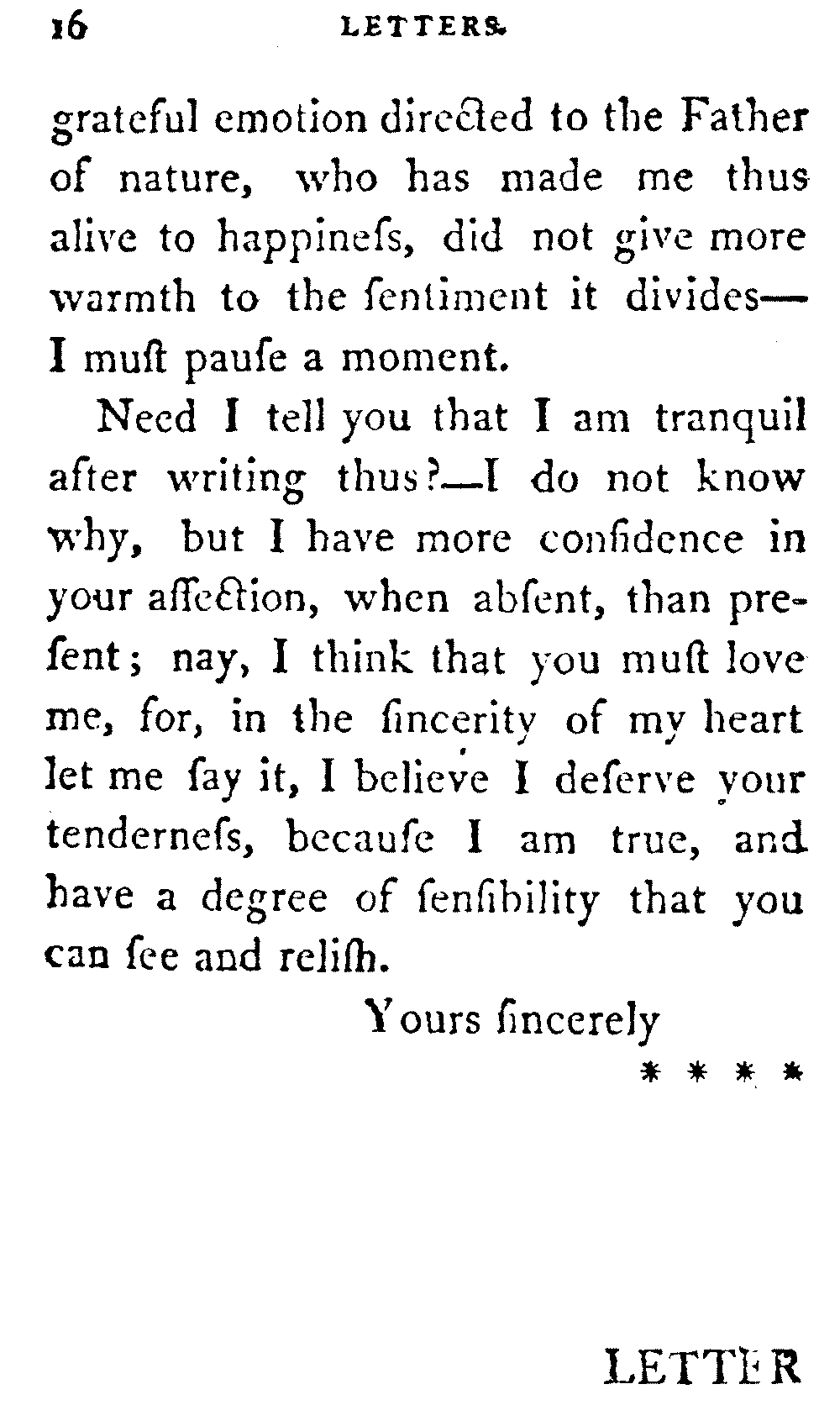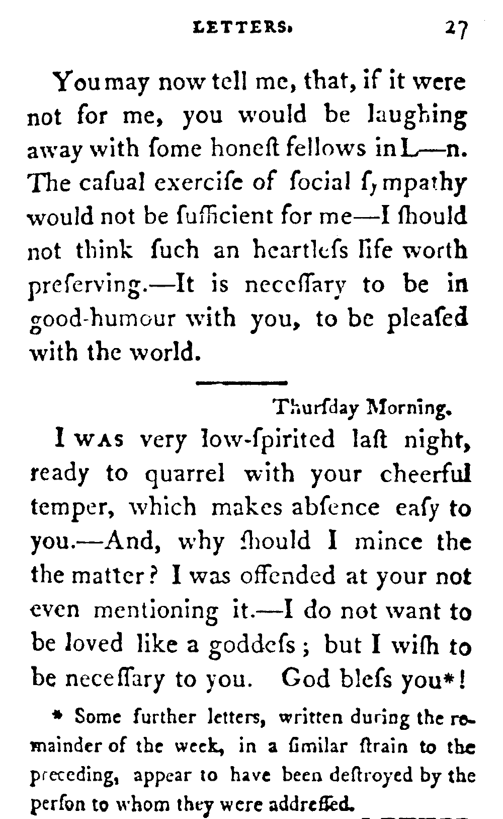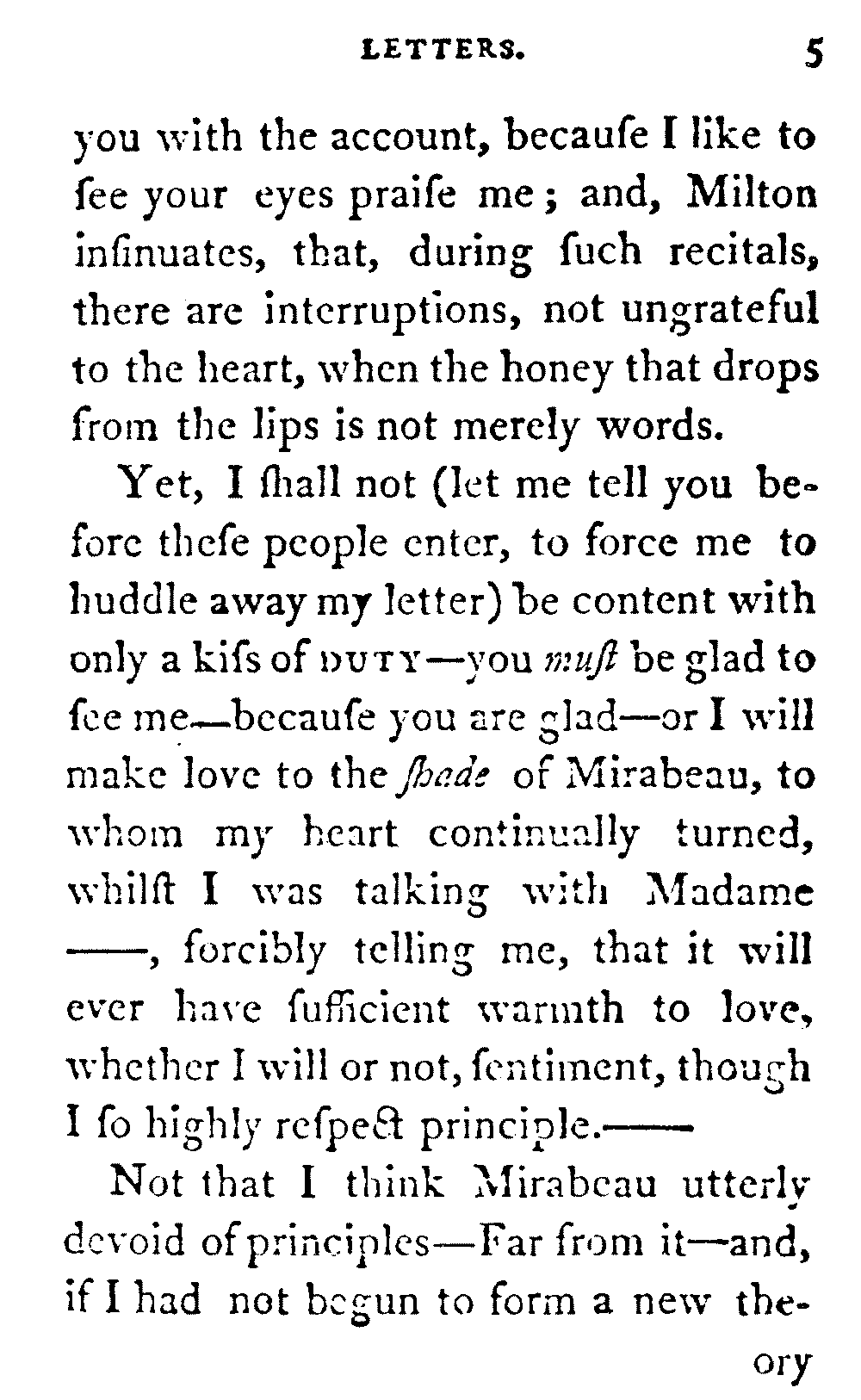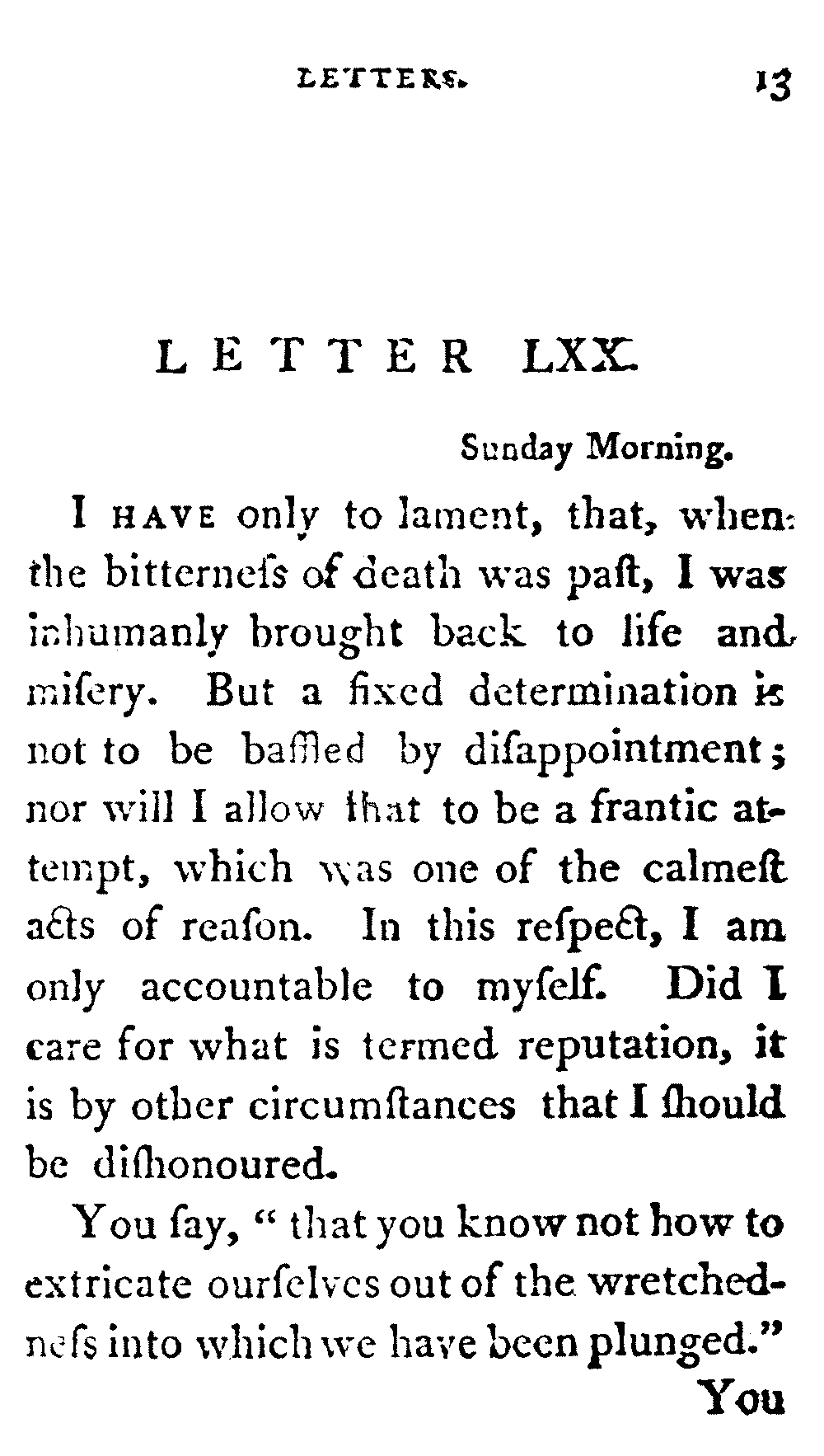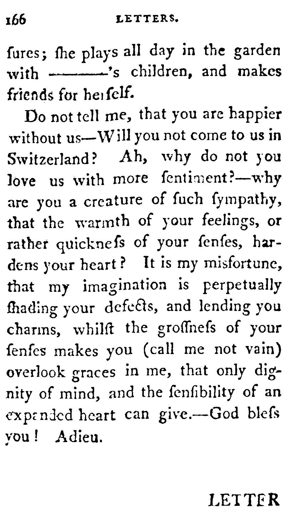 At the cloſe of a ſummer's day, ſome years after, I wandered with careleſs ſteps over a pathleſs common; various anxieties had rendered the hours which the ſun had enlightened heavy; ſober evening came on; I wiſhed to ſtill "my mind, and woo lone quiet in her ſilent walk." The ſcene accorded with my feelings; it was wild and grand; and the ſpreading twilight had almoſt confounded the diſtant ſea with the barren, blue hills that melted from my ſight. I ſat down on a riſing ground; the rays of the departing ſun illumined the horizon, but ſo indiſtinctly, that I anticipated their total extinction. The death of Nature led me to a ſtill more intereſting ſubject, that came home to my boſom, the death of him I loved.[151] A village-bell was tolling; I liſtened, and thought of the moment when I heard his interrupted breath, and felt the agonizing fear, that the ſame ſound would never more reach my ears, and that the intelligence glanced from my eyes, would no more be felt. The ſpoiler had ſeized his prey; the ſun was fled, what was this world to me! I wandered to another, where death and darkneſs could not enter; I purſued the ſun beyond the mountains, and the ſoul eſcaped from this vale of tears. My reflections were tinged with melancholy, but they were ſublime.—I graſped a mighty whole, and ſmiled on the king of terrors; the tie which bound me to my friends he could not break; the ſame myſterious knot united me to the ſource of all goodneſs and happineſs. I had ſeen the divinity re[152]flected in a face I loved; I had read immortal characters diſplayed on a human countenance, and forgot myſelf whilſt I gazed. I could not think of immortality, without recollecting the ecſtacy I felt, when my heart firſt whiſpered to me that I was beloved; and again did I feel the ſacred tie of mutual affection; fervently I prayed to the father of mercies; and rejoiced that he could ſee every turn of a heart, whoſe movements I could not perfectly underſtand. My paſſion ſeemed a pledge of immortality; I did not wiſh to hide it from the all-ſearching eye of heaven. Where indeed could I go from his preſence? and, whilſt it was dear to me, though darkneſs might reign during the night of life, joy would come when I awoke to life everlaſting.