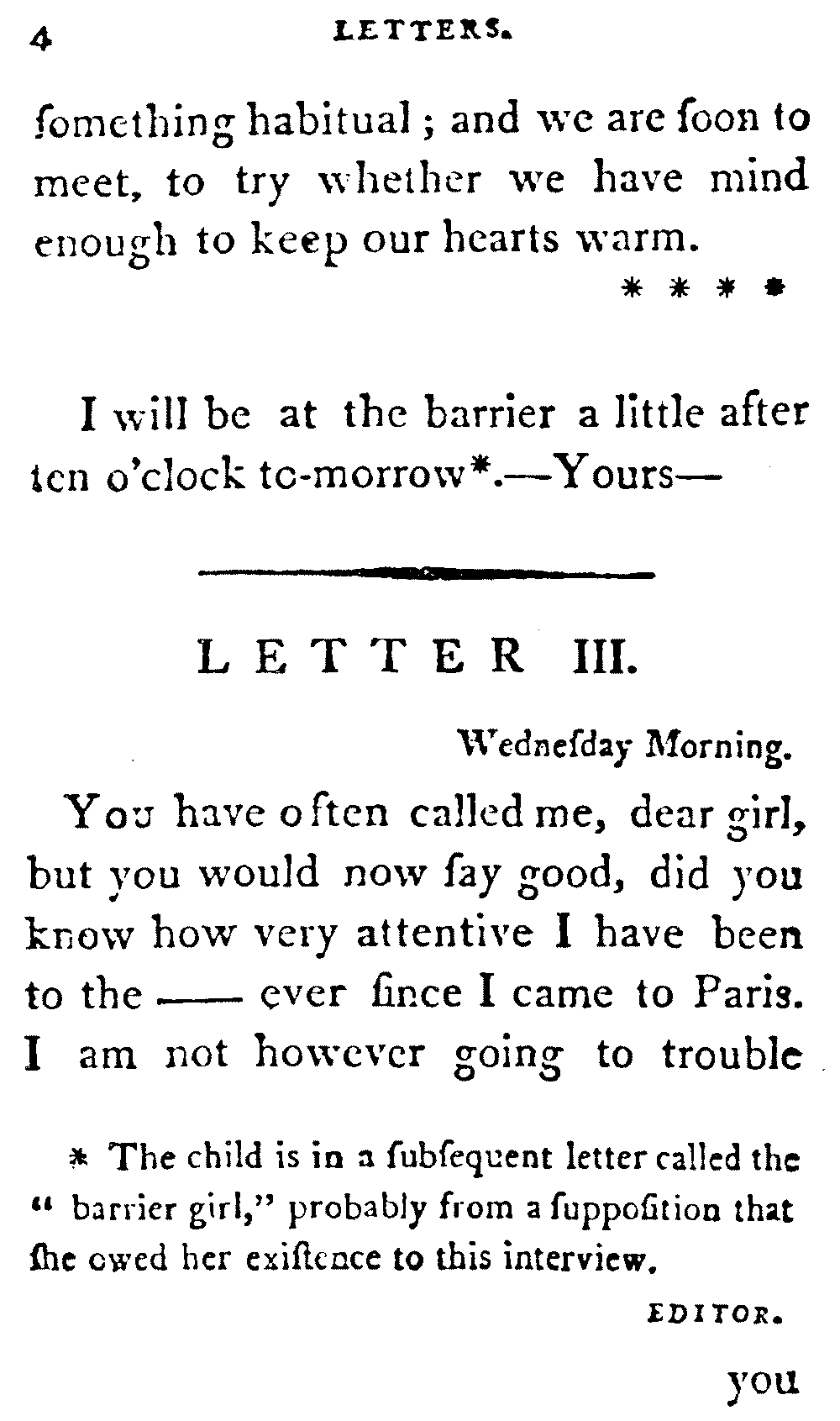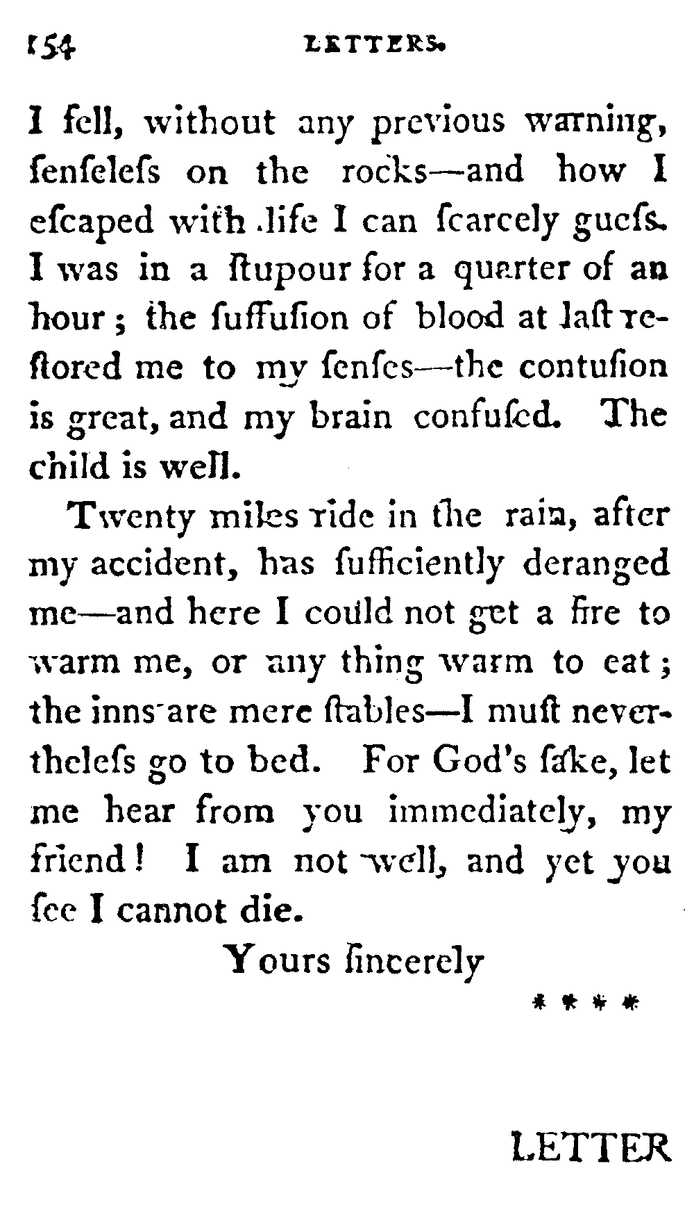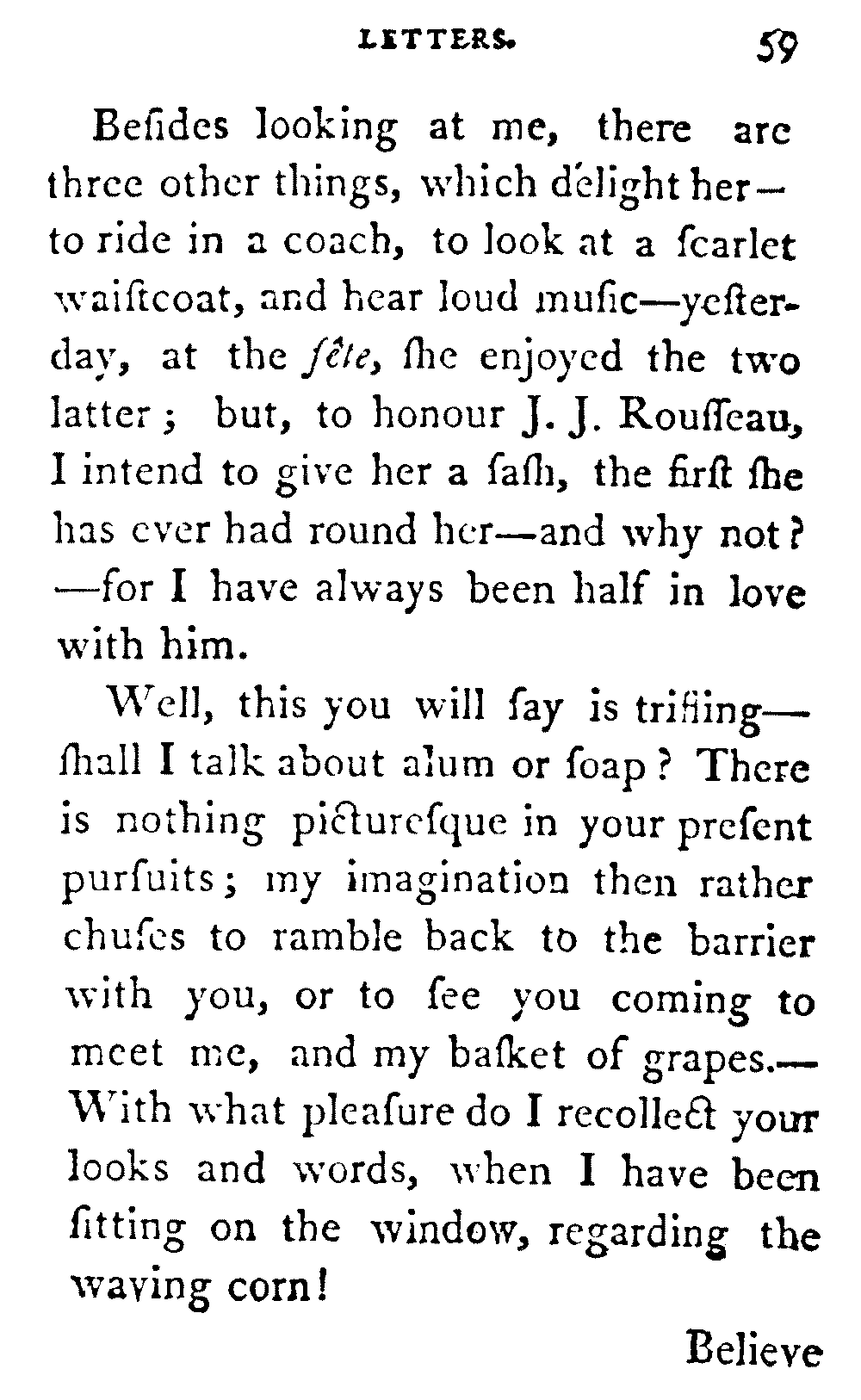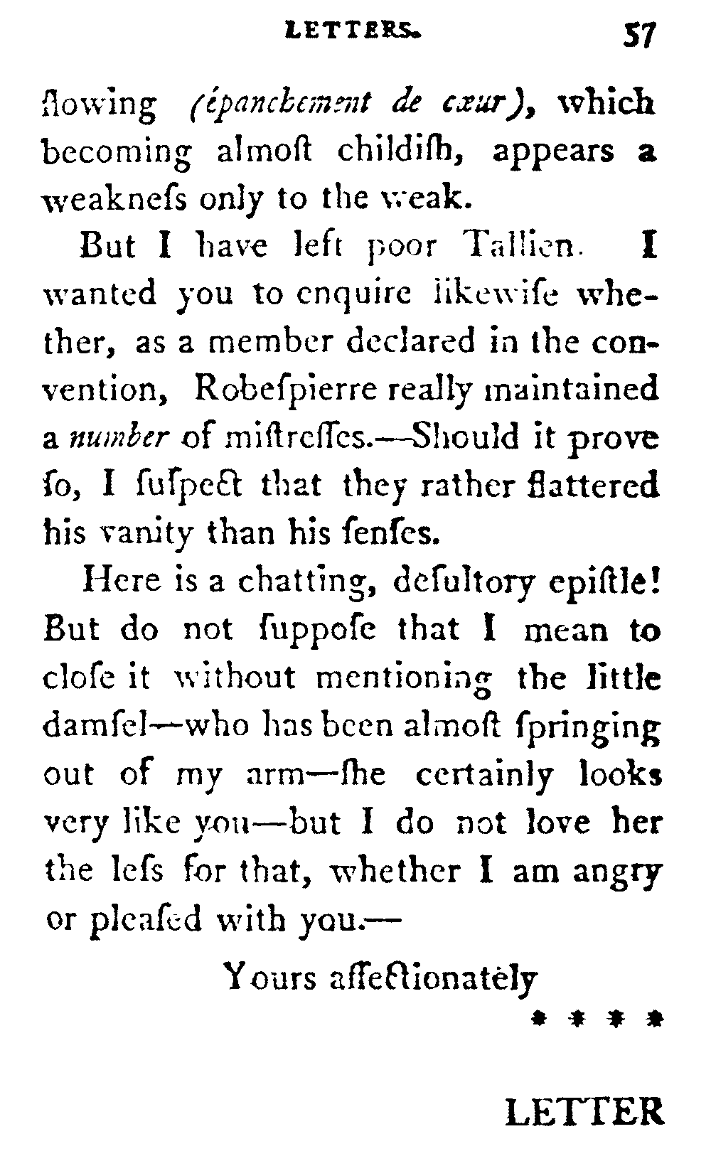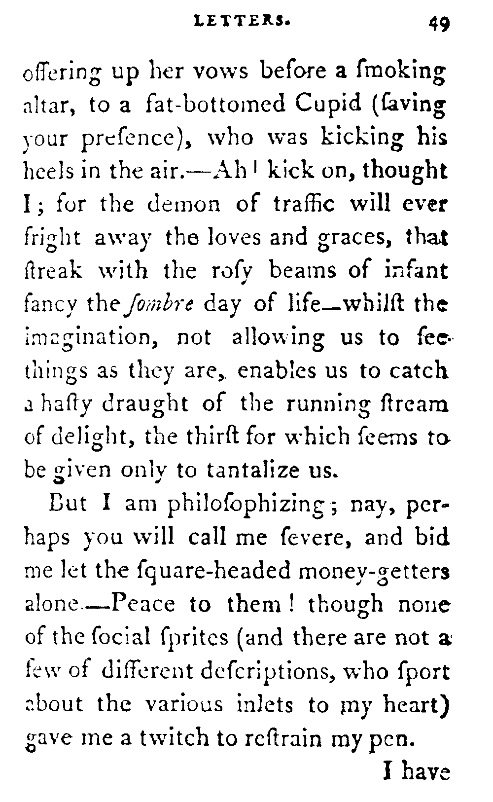 At the cloſe of a ſummer's day, ſome years after, I wandered with careleſs ſteps over a pathleſs common; various anxieties had rendered the hours which the ſun had enlightened heavy; ſober evening came on; I wiſhed to ſtill "my mind, and woo lone quiet in her ſilent walk." The ſcene accorded with my feelings; it was wild and grand; and the ſpreading twilight had almoſt confounded the diſtant ſea with the barren, blue hills that melted from my ſight. I ſat down on a riſing ground; the rays of the departing ſun illumined the horizon, but ſo indiſtinctly, that I anticipated their total extinction. The death of Nature led me to a ſtill more intereſting ſubject, that came home to my boſom, the death of him I loved.[151] A village-bell was tolling; I liſtened, and thought of the moment when I heard his interrupted breath, and felt the agonizing fear, that the ſame ſound would never more reach my ears, and that the intelligence glanced from my eyes, would no more be felt. The ſpoiler had ſeized his prey; the ſun was fled, what was this world to me! I wandered to another, where death and darkneſs could not enter; I purſued the ſun beyond the mountains, and the ſoul eſcaped from this vale of tears. My reflections were tinged with melancholy, but they were ſublime.—I graſped a mighty whole, and ſmiled on the king of terrors; the tie which bound me to my friends he could not break; the ſame myſterious knot united me to the ſource of all goodneſs and happineſs. I had ſeen the divinity re[152]flected in a face I loved; I had read immortal characters diſplayed on a human countenance, and forgot myſelf whilſt I gazed. I could not think of immortality, without recollecting the ecſtacy I felt, when my heart firſt whiſpered to me that I was beloved; and again did I feel the ſacred tie of mutual affection; fervently I prayed to the father of mercies; and rejoiced that he could ſee every turn of a heart, whoſe movements I could not perfectly underſtand. My paſſion ſeemed a pledge of immortality; I did not wiſh to hide it from the all-ſearching eye of heaven. Where indeed could I go from his preſence? and, whilſt it was dear to me, though darkneſs might reign during the night of life, joy would come when I awoke to life everlaſting.
