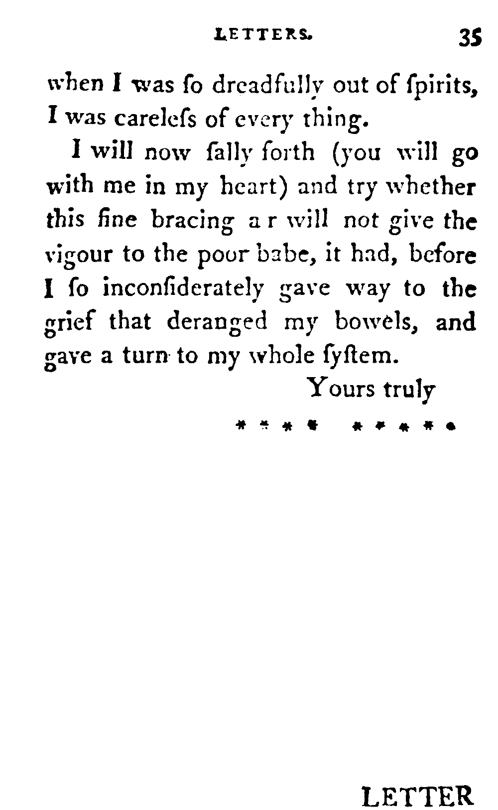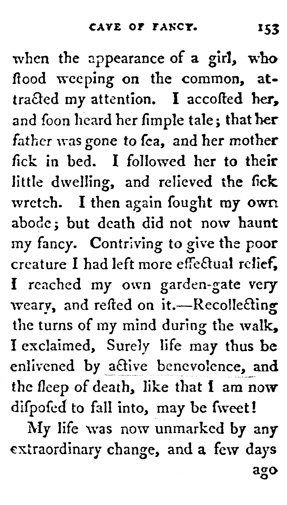I now turned my ſtep towards home,[153] when the appearance of a girl, who ſtood weeping on the common, attracted my attention. I accoſted her, and ſoon heard her ſimple tale; that her father was gone to ſea, and her mother ſick in bed. I followed her to their little dwelling, and relieved the ſick wretch. I then again ſought my own abode; but death did not now haunt my fancy. Contriving to give the poor creature I had left more effectual relief, I reached my own garden-gate very weary, and reſted on it.—Recollecting the turns of my mind during the walk, I exclaimed, Surely life may thus be enlivened by active benevolence, and the ſleep of death, like that I am now diſpoſed to fall into, may be ſweet!