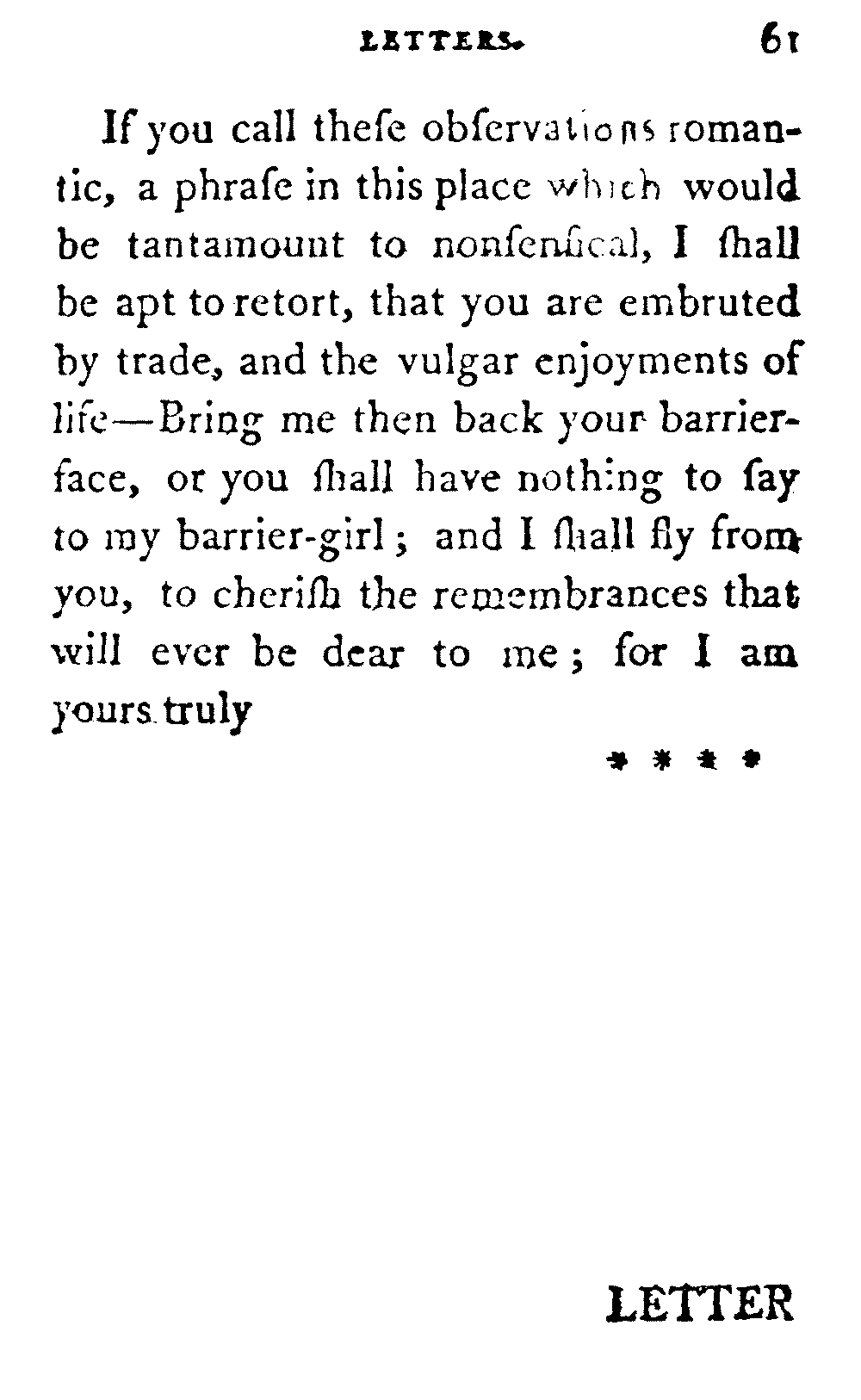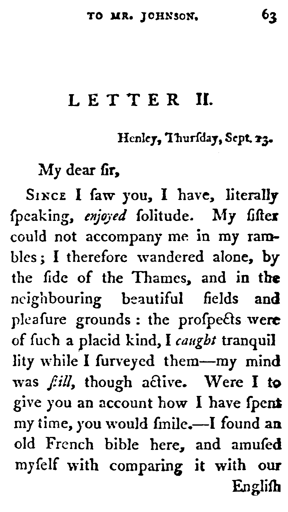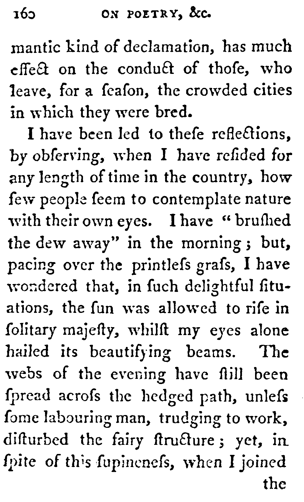 I have been led to theſe reflections, by obſerving, when I have reſided for any length of time in the country, how few people ſeem to contemplate nature with their own eyes. I have "bruſhed the dew away" in the morning; but, pacing over the printleſs graſs, I have wondered that, in ſuch delightful ſituations, the ſun was allowed to riſe in ſolitary majeſty, whilſt my eyes alone hailed its beautifying beams. The webs of the evening have ſtill been ſpread acroſs the hedged path, unleſs ſome labouring man, trudging to work, diſturbed the fairy ſtructure; yet, in ſpite of this ſupineneſs, when I joined[161] the ſocial circle, every tongue rang changes on the pleaſures of the country.