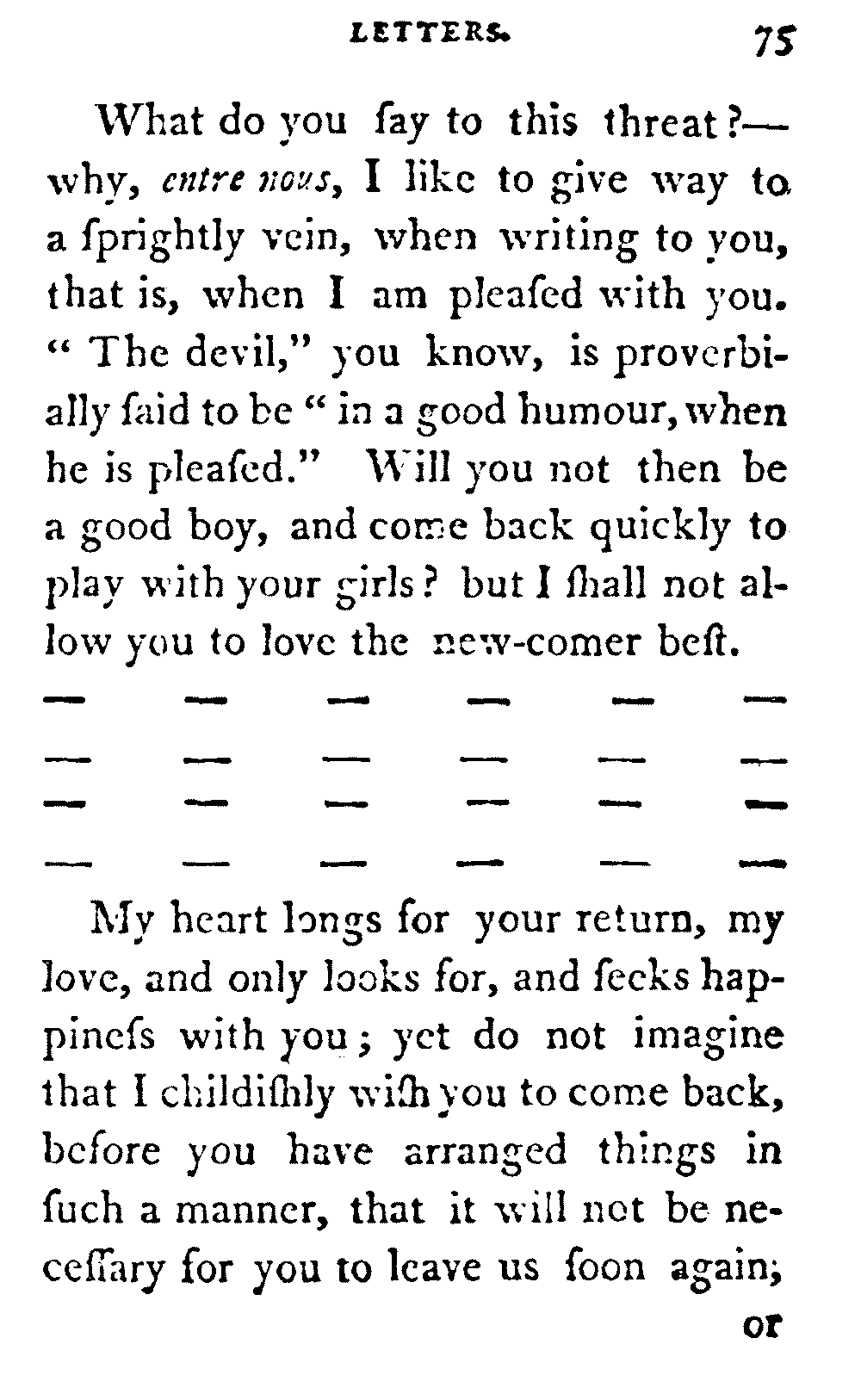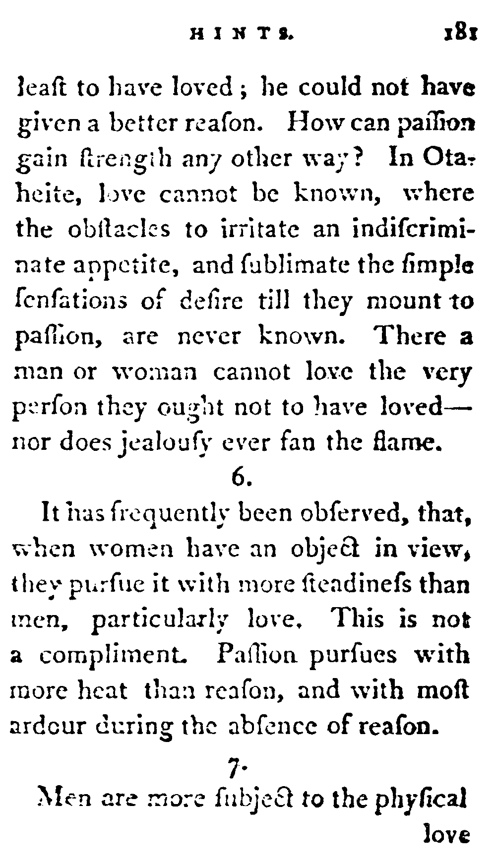Nothing can be more abſurd than the ridicule of the critic, that the heroine of his mock-tragedy was in love with the very man whom ſhe ought[181] leaſt to have loved; he could not have given a better reaſon. How can paſſion gain ſtrength any other way? In Otaheite, love cannot be known, where the obſtacles to irritate an indiſcriminate appetite, and ſublimate the ſimple ſenſations of deſire till they mount to paſſion, are never known. There a man or woman cannot love the very perſon they ought not to have loved—nor does jealouſy ever fan the flame.