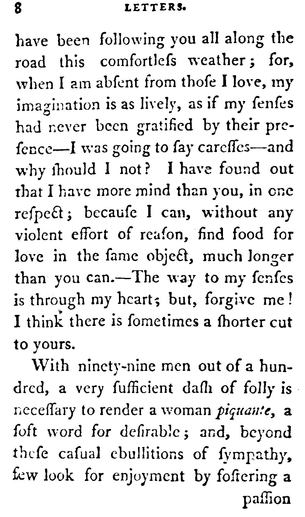 For my part, I cannot suppose any situation more distressing, than for a[xvi] woman of sensibility, with an improving mind, to be bound to such a man as I have described for life; obliged to renounce all the humanizing affections, and to avoid cultivating her taste, lest her perception of grace and refinement of sentiment, should sharpen to agony the pangs of disappointment. Love, in which the imagination mingles its bewitching colouring, must be fostered by delicacy. I should despise, or rather call her an ordinary woman, who could endure such a husband as I have sketched.