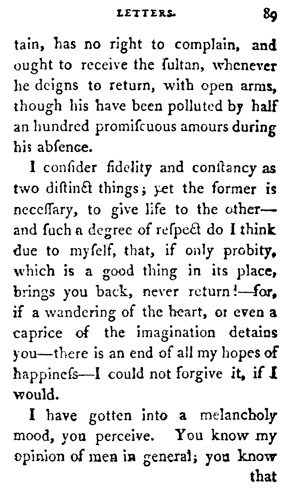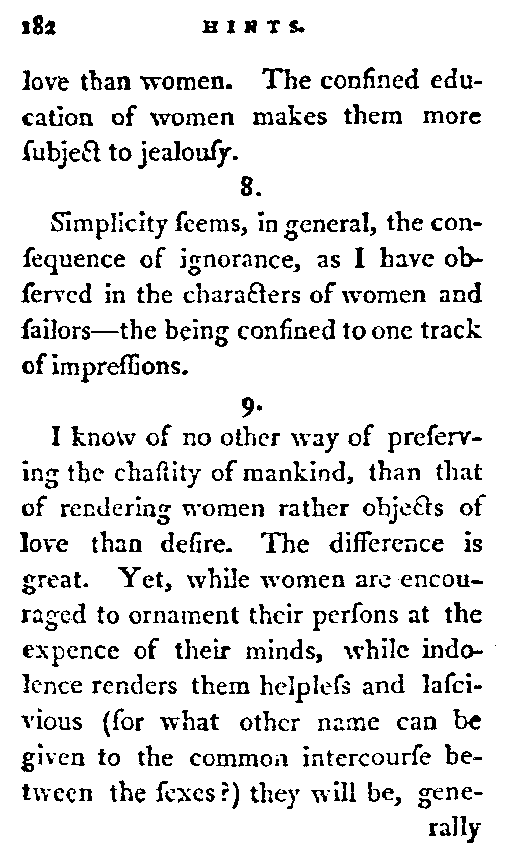 I know of no other way of preſerving the chaſtity of mankind, than that of rendering women rather objects of love than deſire. The difference is great. Yet, while women are encouraged to ornament their perſons at the expence of their minds, while indolence renders them helpleſs and laſcivious (for what other name can be given to the common intercourſe between the ſexes?) they will be, gene[183]rally ſpeaking, only objects of deſire; and, to ſuch women, men cannot be conſtant. Men, accuſtomed only to have their ſenſes moved, merely ſeek for a ſelfiſh gratification in the ſociety of women, and their ſexual inſtinct, being neither ſupported by the underſtanding nor the heart, muſt be excited by variety.