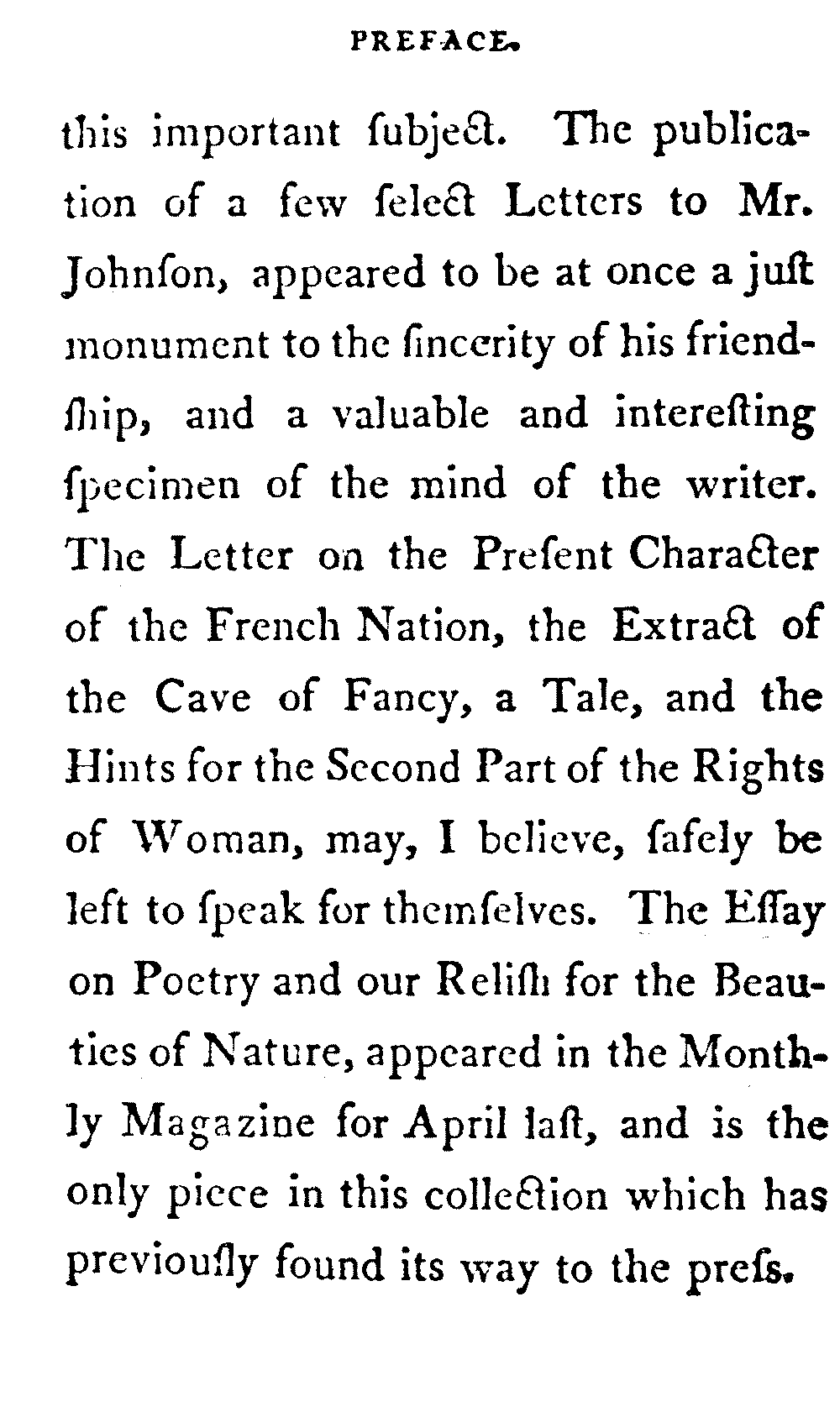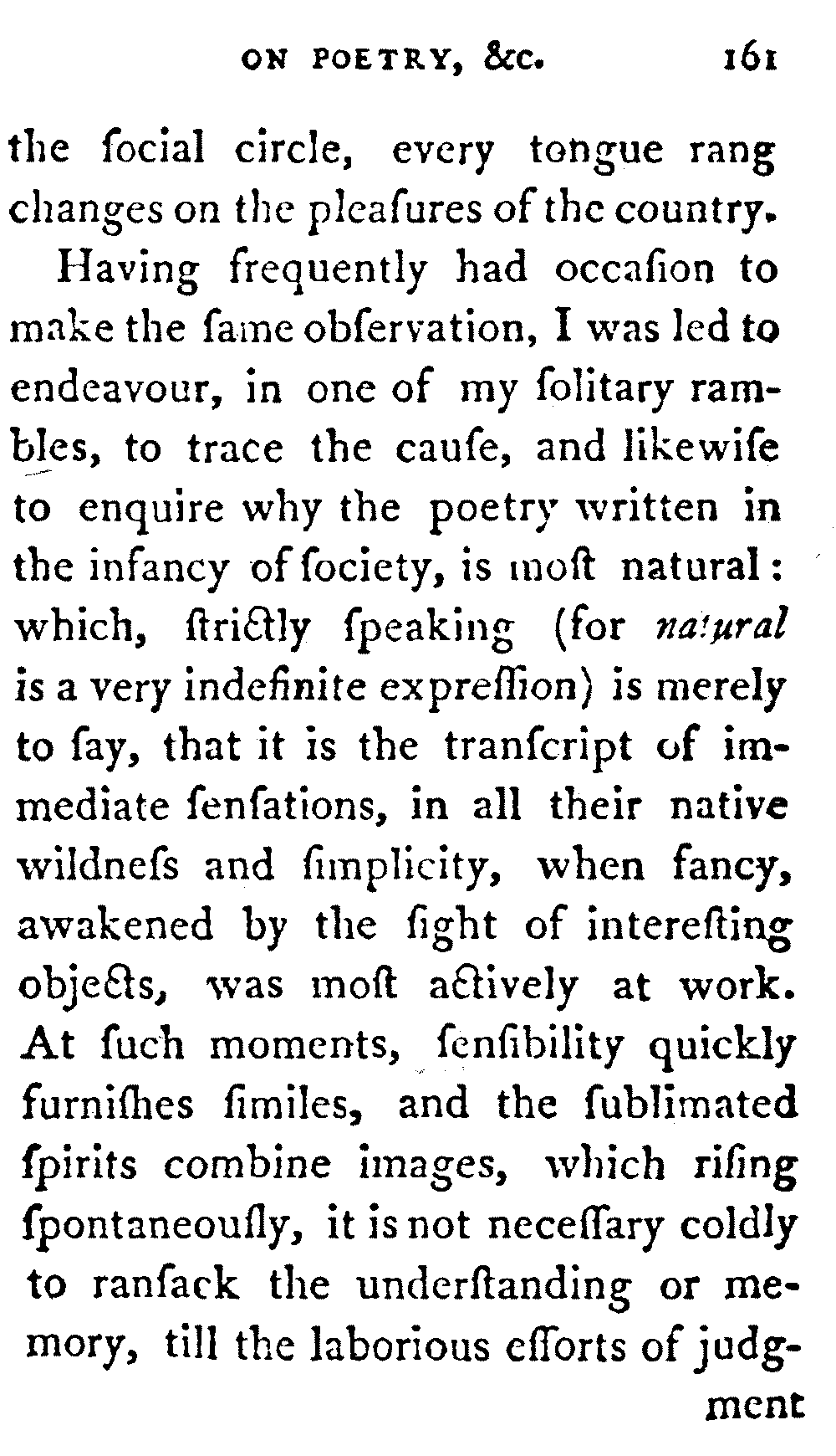 Having frequently had occaſion to make the ſame obſervation, I was led to endeavour, in one of my ſolitary rambles, to trace the cauſe, and likewiſe to enquire why the poetry written in the infancy of ſociety, is moſt natural: which, ſtrictly ſpeaking (for natural is a very indefinite expreſſion) is merely to ſay, that it is the tranſcript of immediate ſenſations, in all their native wildneſs and ſimplicity, when fancy, awakened by the ſight of intereſting objects, was moſt actively at work. At ſuch moments, ſenſibility quickly furniſhes ſimiles, and the ſublimated ſpirits combine images, which riſing ſpontaneouſly, it is not neceſſary coldly to ranſack the underſtanding or memory, till the laborious efforts of judg[162]ment exclude preſent ſenſations, and damp the fire of enthuſiaſm.