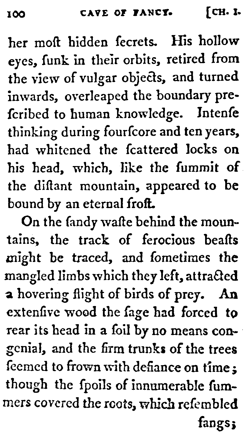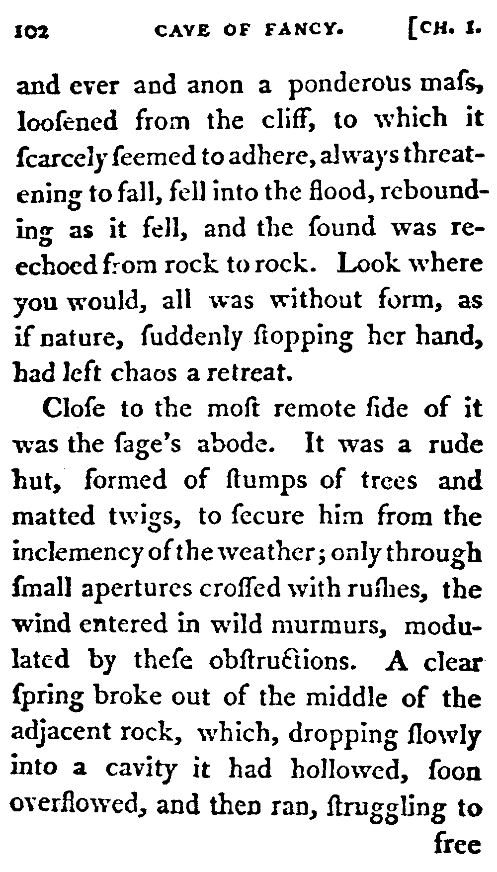 Cloſe to the moſt remote ſide of it was the ſage's abode. It was a rude hut, formed of ſtumps of trees and matted twigs, to ſecure him from the inclemency of the weather; only through ſmall apertures croſſed with ruſhes, the wind entered in wild murmurs, modulated by theſe obſtructions. A clear ſpring broke out of the middle of the adjacent rock, which, dropping ſlowly into a cavity it had hollowed, ſoon overflowed, and then ran, ſtruggling to[103] free itſelf from the cumbrous fragments, till, become a deep, ſilent ſtream, it eſcaped through reeds, and roots of trees, whoſe blaſted tops overhung and darkened the current.