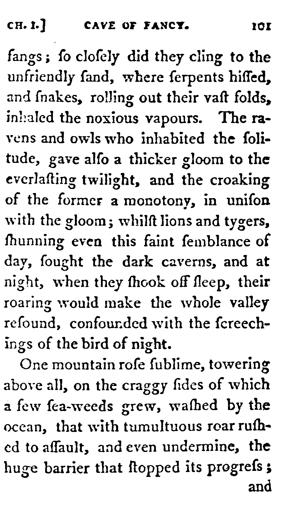 One mountain roſe ſublime, towering above all, on the craggy ſides of which a few ſea-weeds grew, waſhed by the ocean, that with tumultuous roar ruſhed to aſſault, and even undermine, the huge barrier that ſtopped its progreſs;[102] and ever and anon a ponderous maſs, looſened from the cliff, to which it ſcarcely ſeemed to adhere, always threatening to fall, fell into the flood, rebounding as it fell, and the ſound was re-echoed from rock to rock. Look where you would, all was without form, as if nature, ſuddenly ſtopping her hand, had left chaos a retreat.