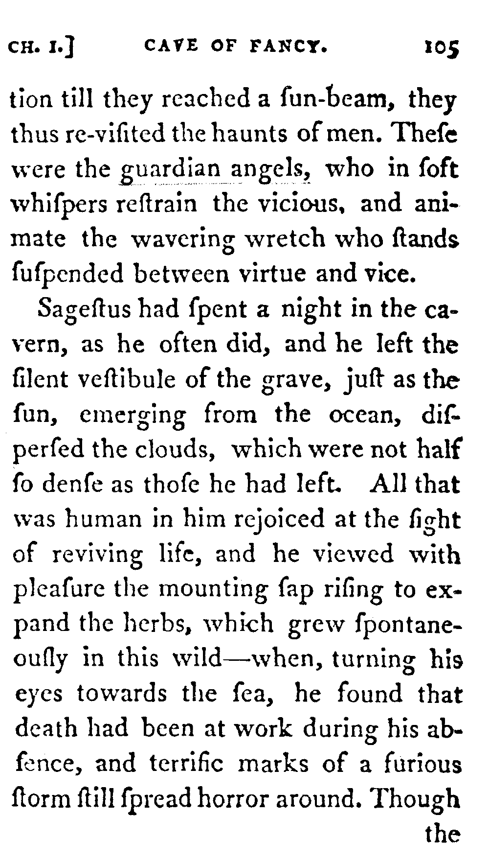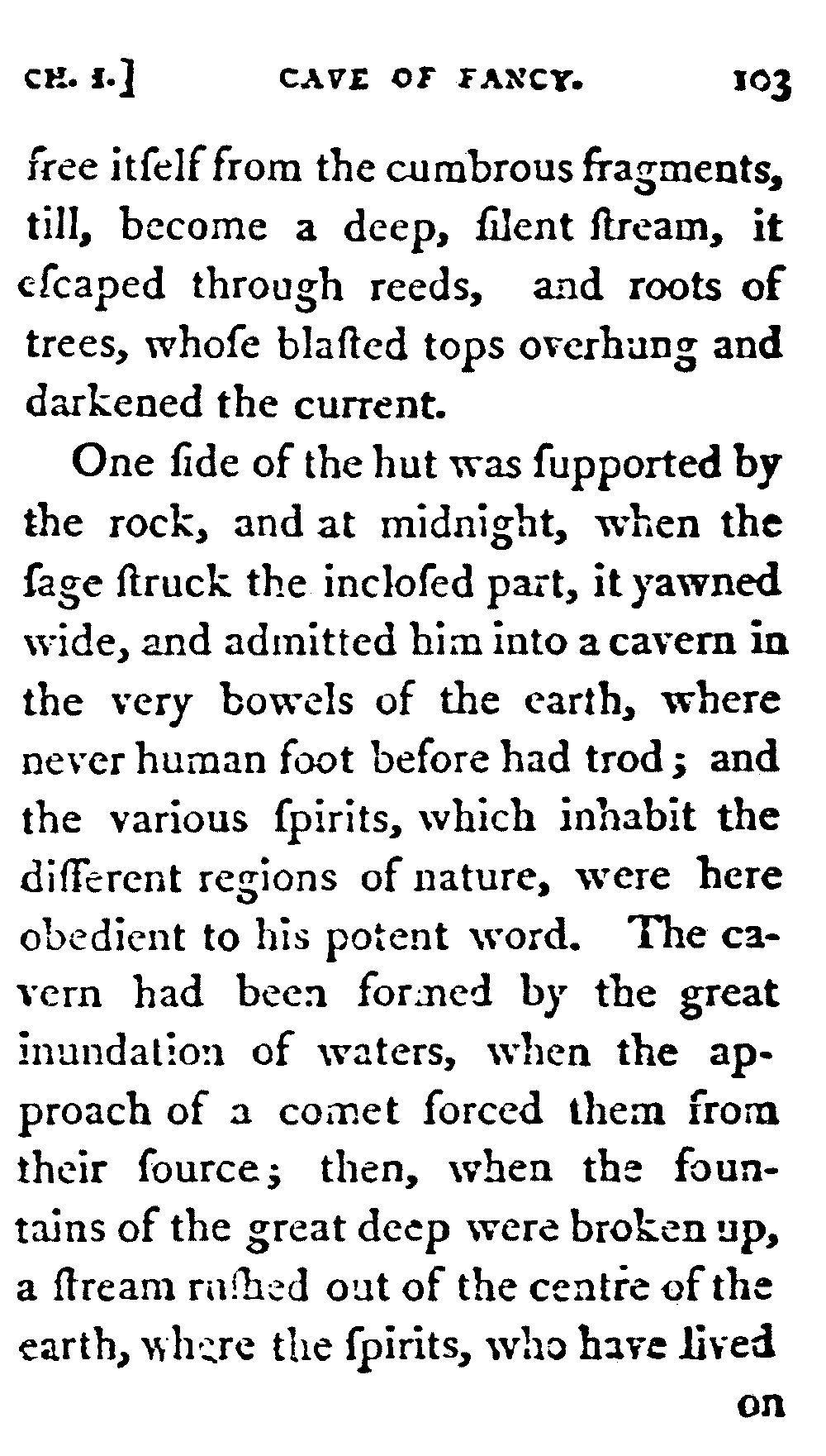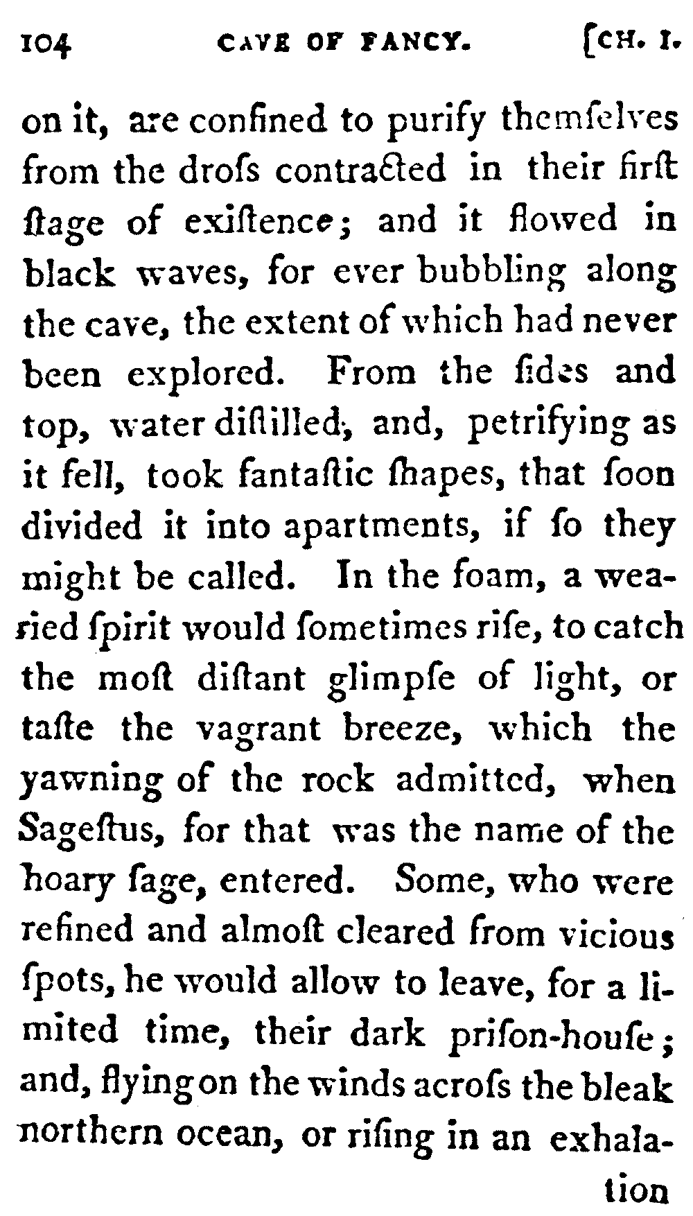 One ſide of the hut was ſupported by the rock, and at midnight, when the ſage ſtruck the incloſed part, it yawned wide, and admitted him into a cavern in the very bowels of the earth, where never human foot before had trod; and the various ſpirits, which inhabit the different regions of nature, were here obedient to his potent word. The cavern had been formed by the great inundation of waters, when the approach of a comet forced them from their ſource; then, when the fountains of the great deep were broken up, a ſtream ruſhed out of the centre of the earth, where the ſpirits, who have lived[104] on it, are confined to purify themſelves from the droſs contracted in their firſt ſtage of exiſtence; and it flowed in black waves, for ever bubbling along the cave, the extent of which had never been explored. From the ſides and top, water diſtilled, and, petrifying as it fell, took fantaſtic ſhapes, that ſoon divided it into apartments, if ſo they might be called. In the foam, a wearied ſpirit would ſometimes riſe, to catch the moſt diſtant glimpſe of light, or taſte the vagrant breeze, which the yawning of the rock admitted, when Sageſtus, for that was the name of the hoary ſage, entered. Some, who were refined and almoſt cleared from vicious ſpots, he would allow to leave, for a limited time, their dark priſon-houſe; and, flying on the winds acroſs the bleak northern ocean, or riſing in an exhala[105]tion till they reached a ſun-beam, they thus re-viſited the haunts of men. Theſe were the guardian angels, who in ſoft whiſpers reſtrain the vicious, and animate the wavering wretch who ſtands ſuſpended between virtue and vice.