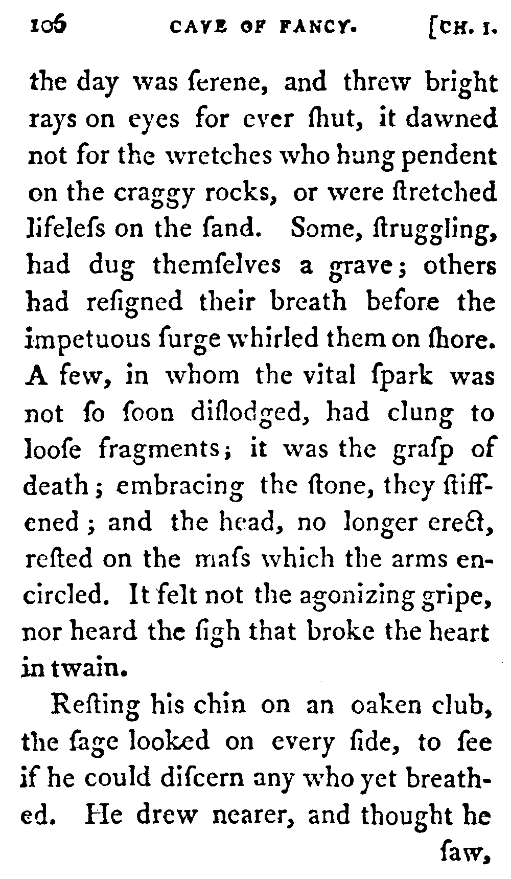 Sageſtus had ſpent a night in the cavern, as he often did, and he left the ſilent veſtibule of the grave, juſt as the ſun, emerging from the ocean, diſperſed the clouds, which were not half ſo denſe as thoſe he had left. All that was human in him rejoiced at the ſight of reviving life, and he viewed with pleaſure the mounting ſap riſing to expand the herbs, which grew ſpontaneouſly in this wild—when, turning his eyes towards the ſea, he found that death had been at work during his abſence, and terrific marks of a furious ſtorm ſtill ſpread horror around. Though[106] the day was ſerene, and threw bright rays on eyes for ever ſhut, it dawned not for the wretches who hung pendent on the craggy rocks, or were ſtretched lifeleſs on the ſand. Some, ſtruggling, had dug themſelves a grave; others had reſigned their breath before the impetuous ſurge whirled them on ſhore. A few, in whom the vital ſpark was not ſo ſoon diſlodged, had clung to looſe fragments; it was the graſp of death; embracing the ſtone, they ſtiffened; and the head, no longer erect, reſted on the maſs which the arms encircled. It felt not the agonizing gripe, nor heard the ſigh that broke the heart in twain.