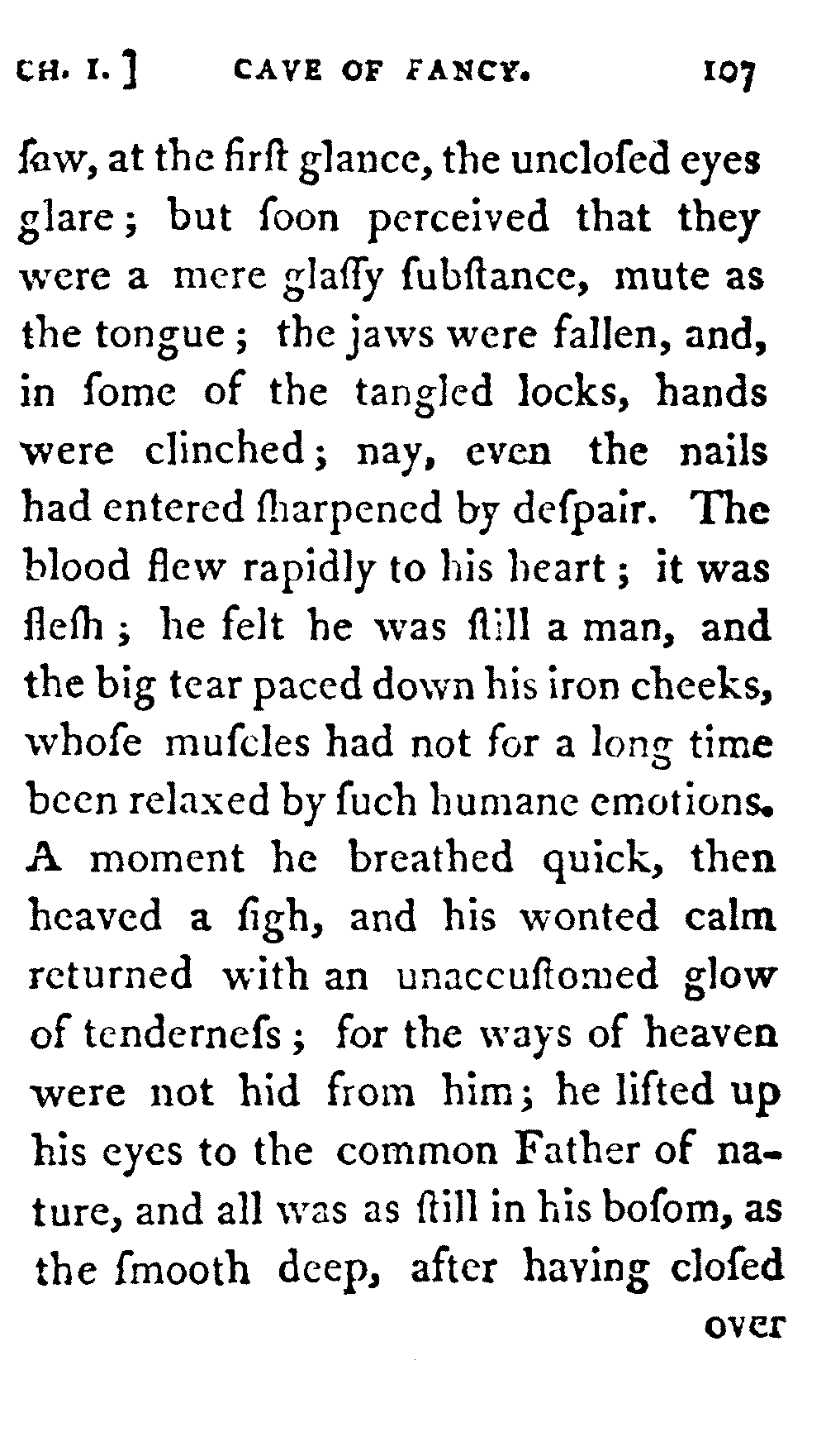 Reſting his chin on an oaken club, the ſage looked on every ſide, to ſee if he could diſcern any who yet breathed. He drew nearer, and thought he[107] ſaw, at the firſt glance, the uncloſed eyes glare; but ſoon perceived that they were a mere glaſſy ſubſtance, mute as the tongue; the jaws were fallen, and, in ſome of the tangled locks, hands were clinched; nay, even the nails had entered ſharpened by deſpair. The blood flew rapidly to his heart; it was fleſh; he felt he was ſtill a man, and the big tear paced down his iron cheeks, whoſe muſcles had not for a long time been relaxed by ſuch humane emotions. A moment he breathed quick, then heaved a ſigh, and his wonted calm returned with an unaccuſtomed glow of tenderneſs; for the ways of heaven were not hid from him; he lifted up his eyes to the common Father of nature, and all was as ſtill in his boſom, as the ſmooth deep, after having cloſed[108] over the huge veſſel from which the wretches had fled.