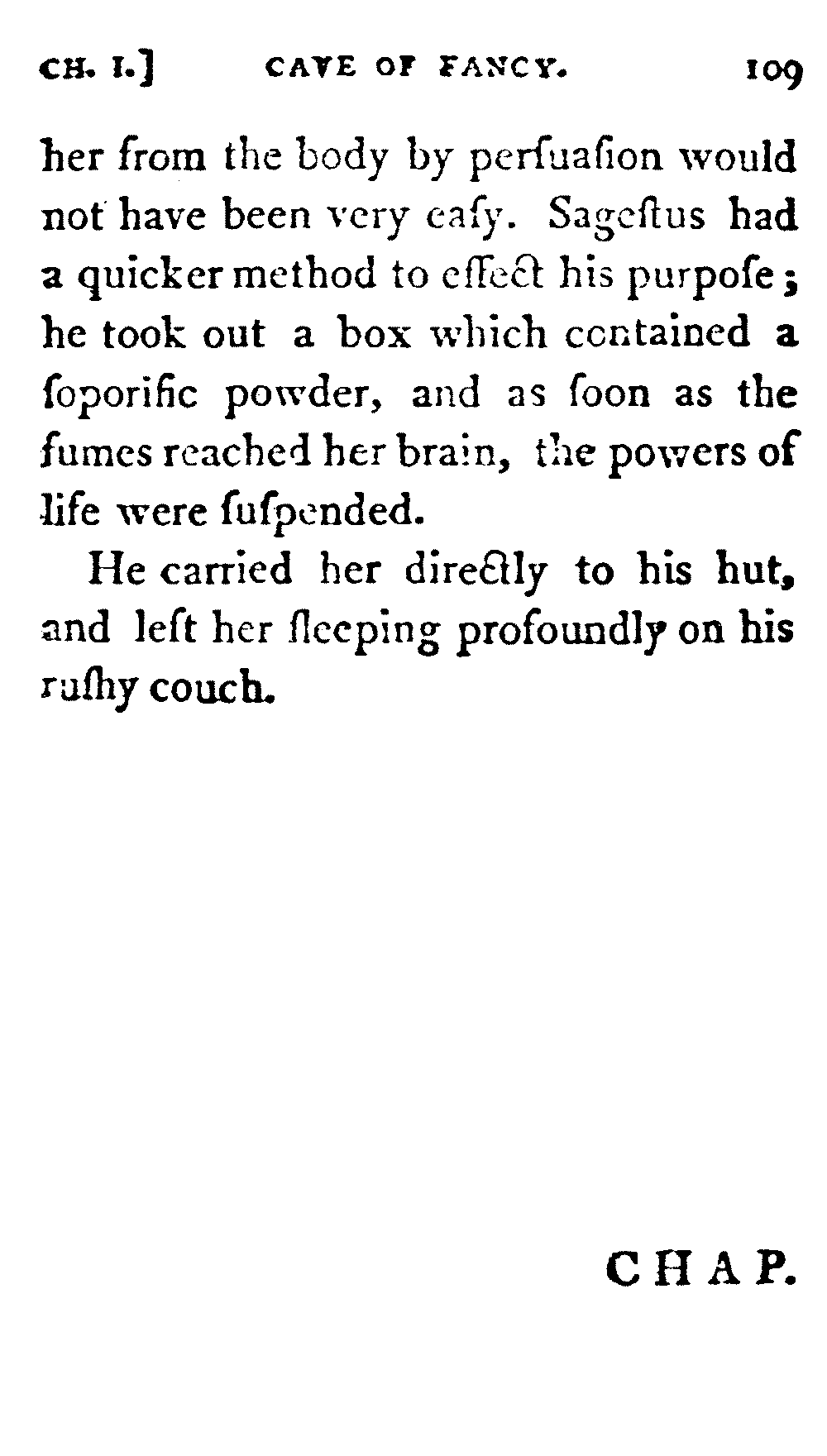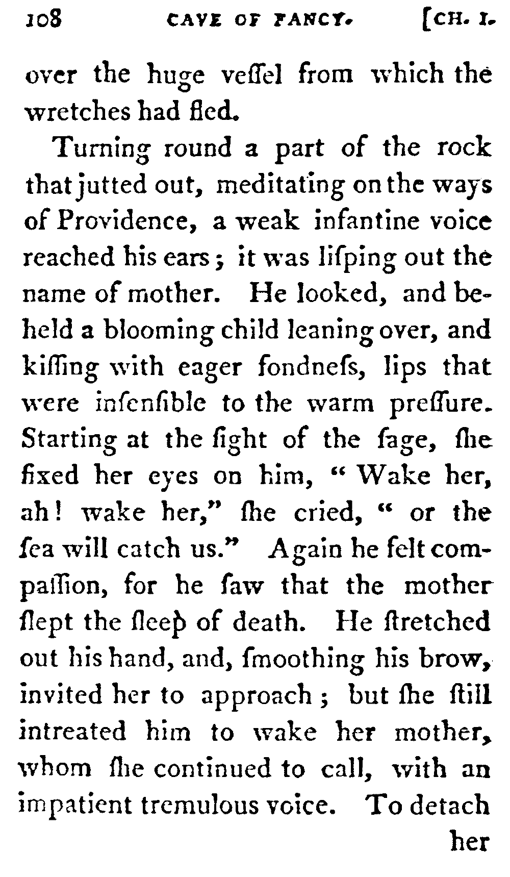 Turning round a part of the rock that jutted out, meditating on the ways of Providence, a weak infantine voice reached his ears; it was liſping out the name of mother. He looked, and beheld a blooming child leaning over, and kiſſing with eager fondneſs, lips that were inſenſible to the warm preſſure. Starting at the ſight of the ſage, ſhe fixed her eyes on him, "Wake her, ah! wake her," ſhe cried, "or the ſea will catch us." Again he felt compaſſion, for he ſaw that the mother ſlept the ſleep of death. He ſtretched out his hand, and, ſmoothing his brow, invited her to approach; but ſhe ſtill intreated him to wake her mother, whom ſhe continued to call, with an impatient tremulous voice. To detach[109] her from the body by perſuaſion would not have been very eaſy. Sageſtus had a quicker method to effect his purpoſe; he took out a box which contained a ſoporific powder, and as ſoon as the fumes reached her brain, the powers of life were ſuſpended.