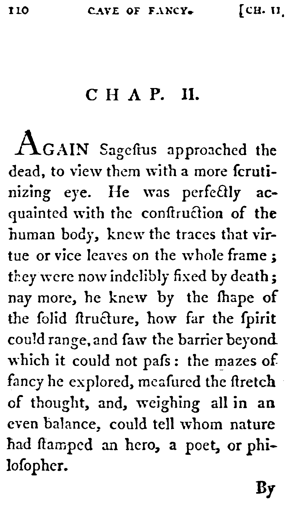 Again Sageſtus approached the dead, to view them with a more ſcrutinizing eye. He was perfectly acquainted with the conſtruction of the human body, knew the traces that virtue or vice leaves on the whole frame; they were now indelibly fixed by death; nay more, he knew by the ſhape of the ſolid ſtructure, how far the ſpirit could range, and ſaw the barrier beyond which it could not paſs: the mazes of fancy he explored, meaſured the ſtretch of thought, and, weighing all in an even balance, could tell whom nature had ſtamped an hero, a poet, or philoſopher.