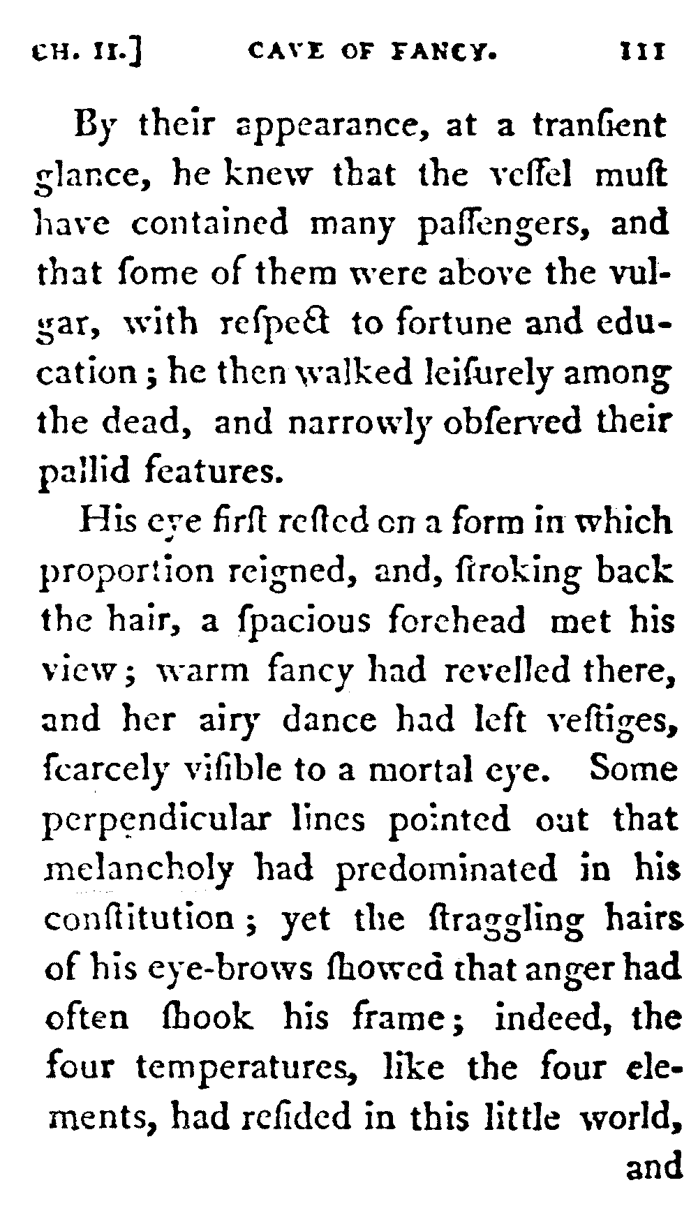 [111] By their appearance, at a tranſient glance, he knew that the veſſel muſt have contained many paſſengers, and that ſome of them were above the vulgar, with reſpect to fortune and education; he then walked leiſurely among the dead, and narrowly obſerved their pallid features.