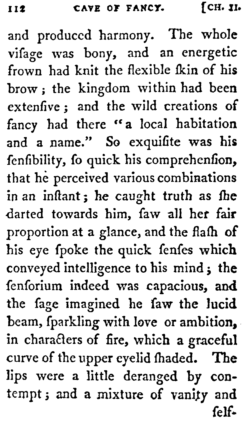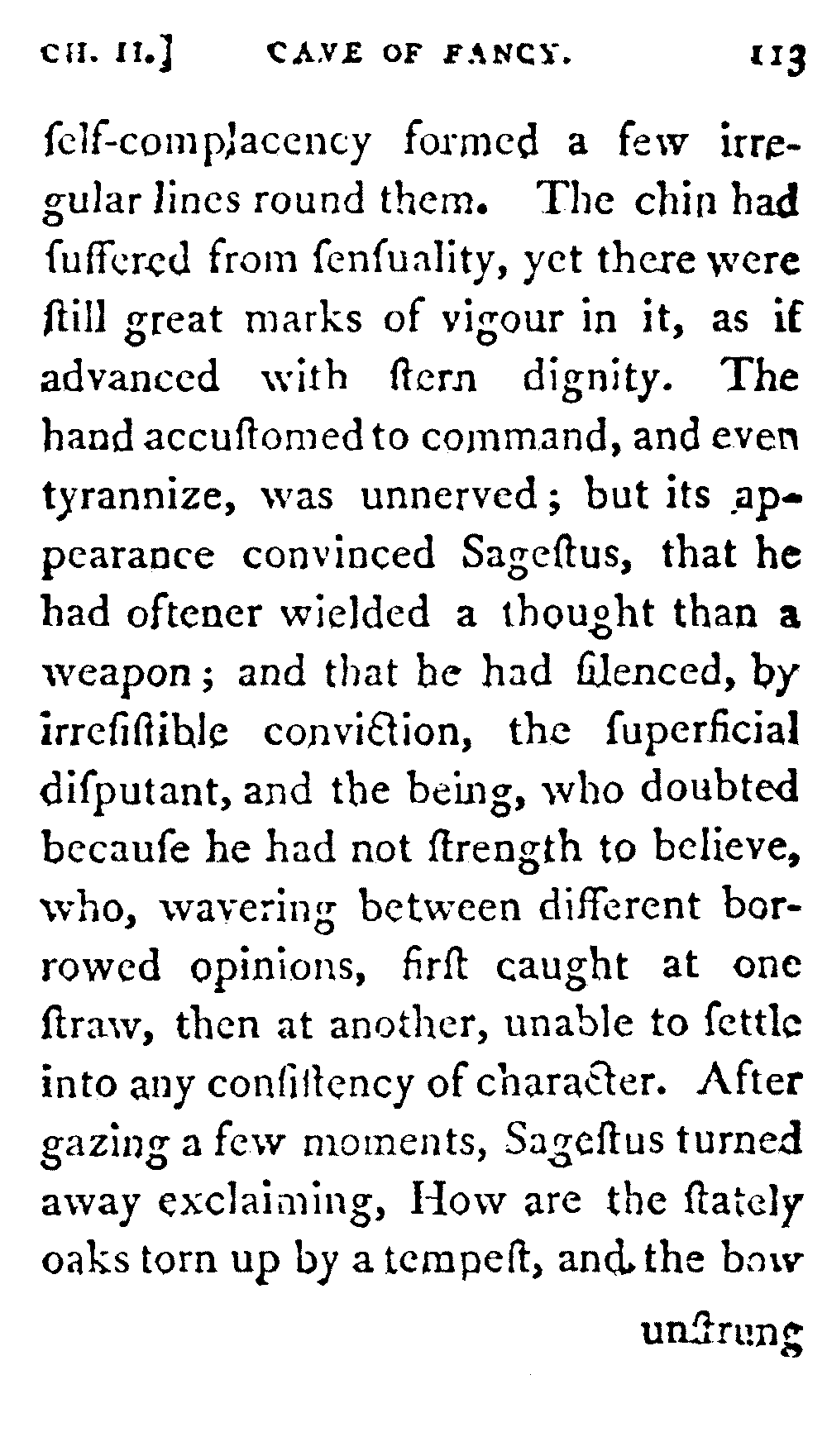 His eye firſt reſted on a form in which proportion reigned, and, ſtroking back the hair, a ſpacious forehead met his view; warm fancy had revelled there, and her airy dance had left veſtiges, ſcarcely viſible to a mortal eye. Some perpendicular lines pointed out that melancholy had predominated in his conſtitution; yet the ſtraggling hairs of his eye-brows ſhowed that anger had often ſhook his frame; indeed, the four temperatures, like the four elements, had reſided in this little world,[112] and produced harmony. The whole viſage was bony, and an energetic frown had knit the flexible ſkin of his brow; the kingdom within had been extenſive; and the wild creations of fancy had there "a local habitation and a name." So exquiſite was his ſenſibility, ſo quick his comprehenſion, that he perceived various combinations in an inſtant; he caught truth as ſhe darted towards him, ſaw all her fair proportion at a glance, and the flaſh of his eye ſpoke the quick ſenſes which conveyed intelligence to his mind; the ſenſorium indeed was capacious, and the ſage imagined he ſaw the lucid beam, ſparkling with love or ambition, in characters of fire, which a graceful curve of the upper eyelid ſhaded. The lips were a little deranged by contempt; and a mixture of vanity and[113] ſelf-complacency formed a few irregular lines round them. The chin had ſuffered from ſenſuality, yet there were ſtill great marks of vigour in it, as if advanced with ſtern dignity. The hand accuſtomed to command, and even tyrannize, was unnerved; but its appearance convinced Sageſtus, that he had oftener wielded a thought than a weapon; and that he had ſilenced, by irreſiſtible conviction, the ſuperficial diſputant, and the being, who doubted becauſe he had not ſtrength to believe, who, wavering between different borrowed opinions, firſt caught at one ſtraw, then at another, unable to ſettle into any conſiſtency of character. After gazing a few moments, Sageſtus turned away exclaiming, How are the ſtately oaks torn up by a tempeſt, and the bow[114] unſtrung, that could force the arrow beyond the ken of the eye!