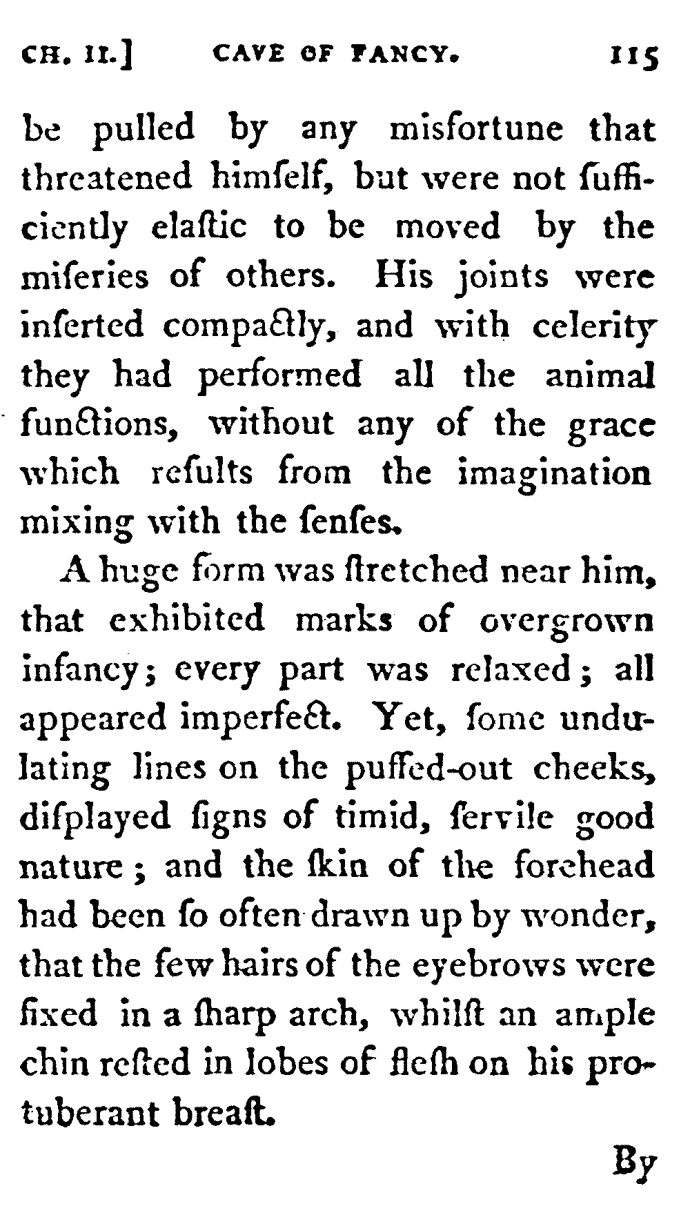 A huge form was ſtretched near him, that exhibited marks of overgrown infancy; every part was relaxed; all appeared imperfect. Yet, ſome undulating lines on the puffed-out cheeks, diſplayed ſigns of timid, ſervile good nature; and the ſkin of the forehead had been ſo often drawn up by wonder, that the few hairs of the eyebrows were fixed in a ſharp arch, whilſt an ample chin reſted in lobes of fleſh on his protuberant breaſt.